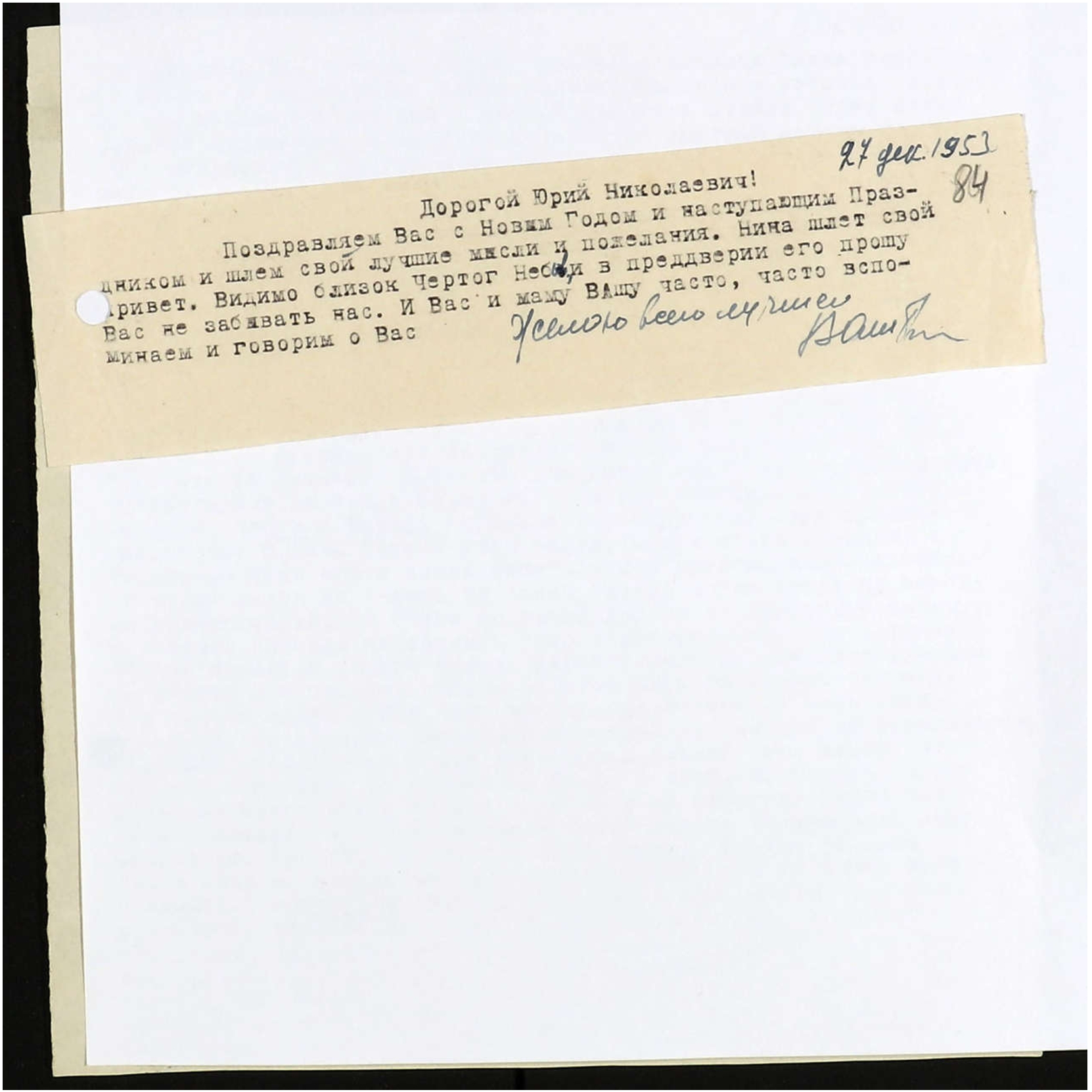 Поздравляем Вас с Новым Годом и наступающим Праздником и шлем свои лучшие мысли и пожелания. Нина шлет свой привет. Видимо близок Чертог Неба, и в преддверии его прошу Вас не забывать нас. И Вас и маму Вашу часто-часто вспоминаем и говорим о Вас. Желаю всего лучшего. Ваш Борис.