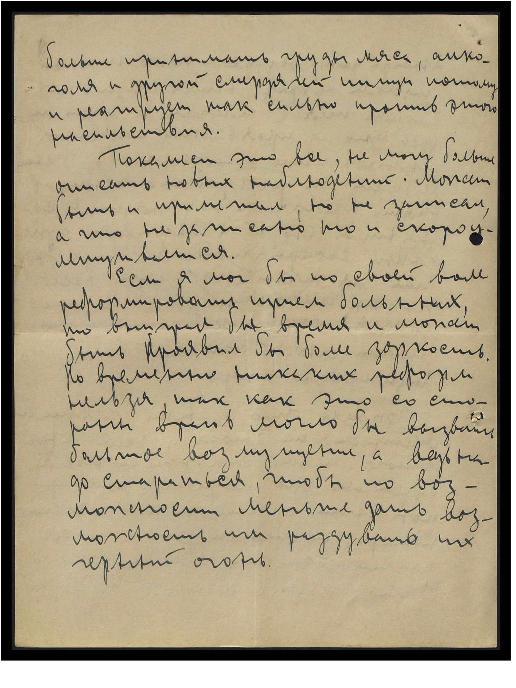 Если я мог бы по своей воле реформировать приём больных, то выиграл бы время и, может быть, проявил бы более зоркость. Но временно никаких реформ нельзя, так как это со стороны врагов могло бы вызвать большое возмущение, а ведь надо стараться, чтобы по возможности меньше дать возможность им раздувать их чёрный огонь.
