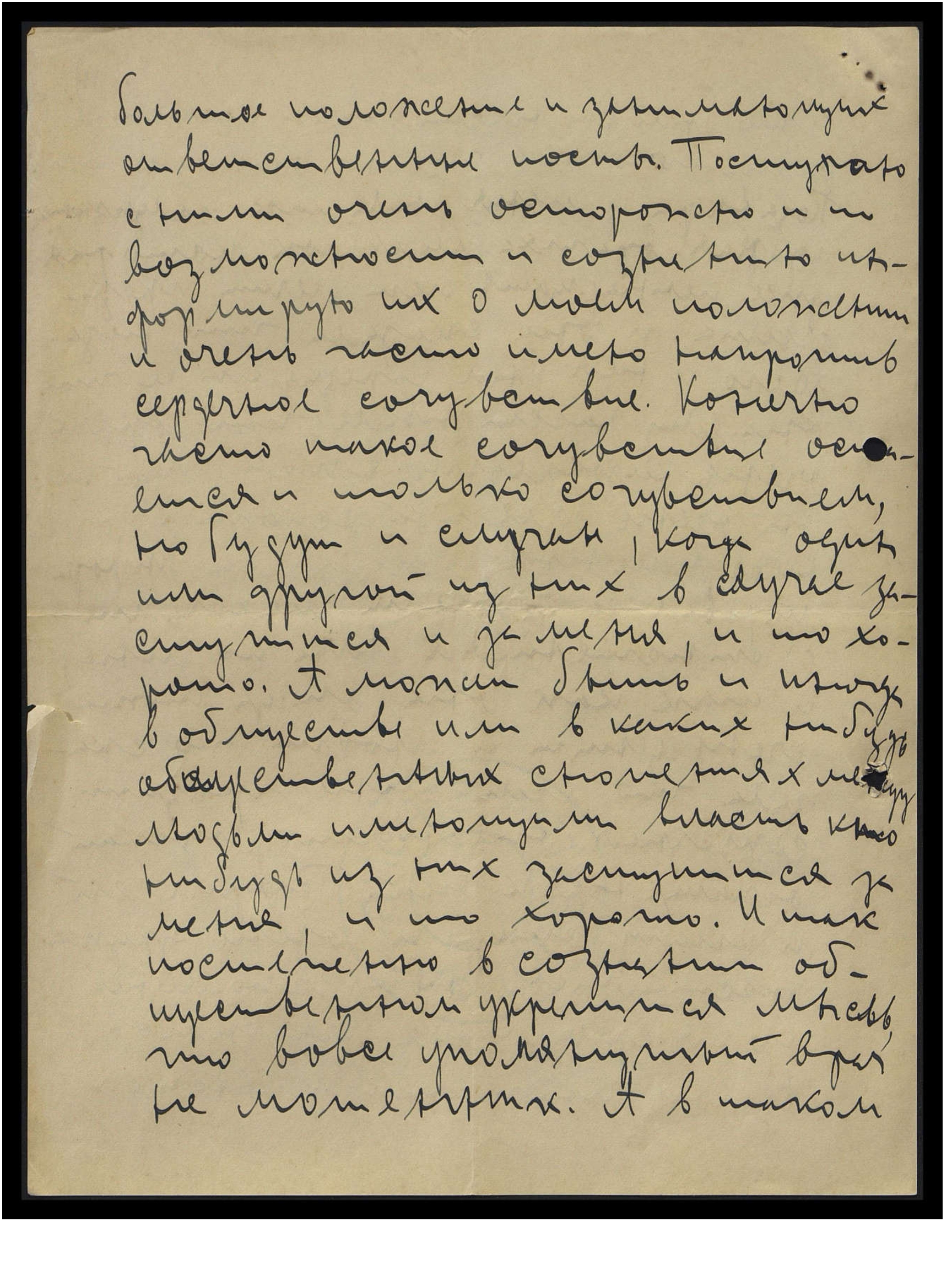 большое положение и занимающих ответственные посты. Поступаю с ними очень осторожно и по возможности и сознанию информирую их о моём положении, и очень часто имею напротив сердечное сочувствие. Конечно, часто такое сочувствие остаётся только сочувствием, но будут и случаи, когда один или другой из них в случае заступится и за меня, и то хорошо. А может быть, и иногда в обществе или в каких-нибудь общественных сношениях между людьми, имеющими власть, кто-нибудь из них заступится за меня, и то хорошо. И так постепенно в сознании общественном укрепится мысль, что вовсе упомянутый врач - не мошенник. А в таком