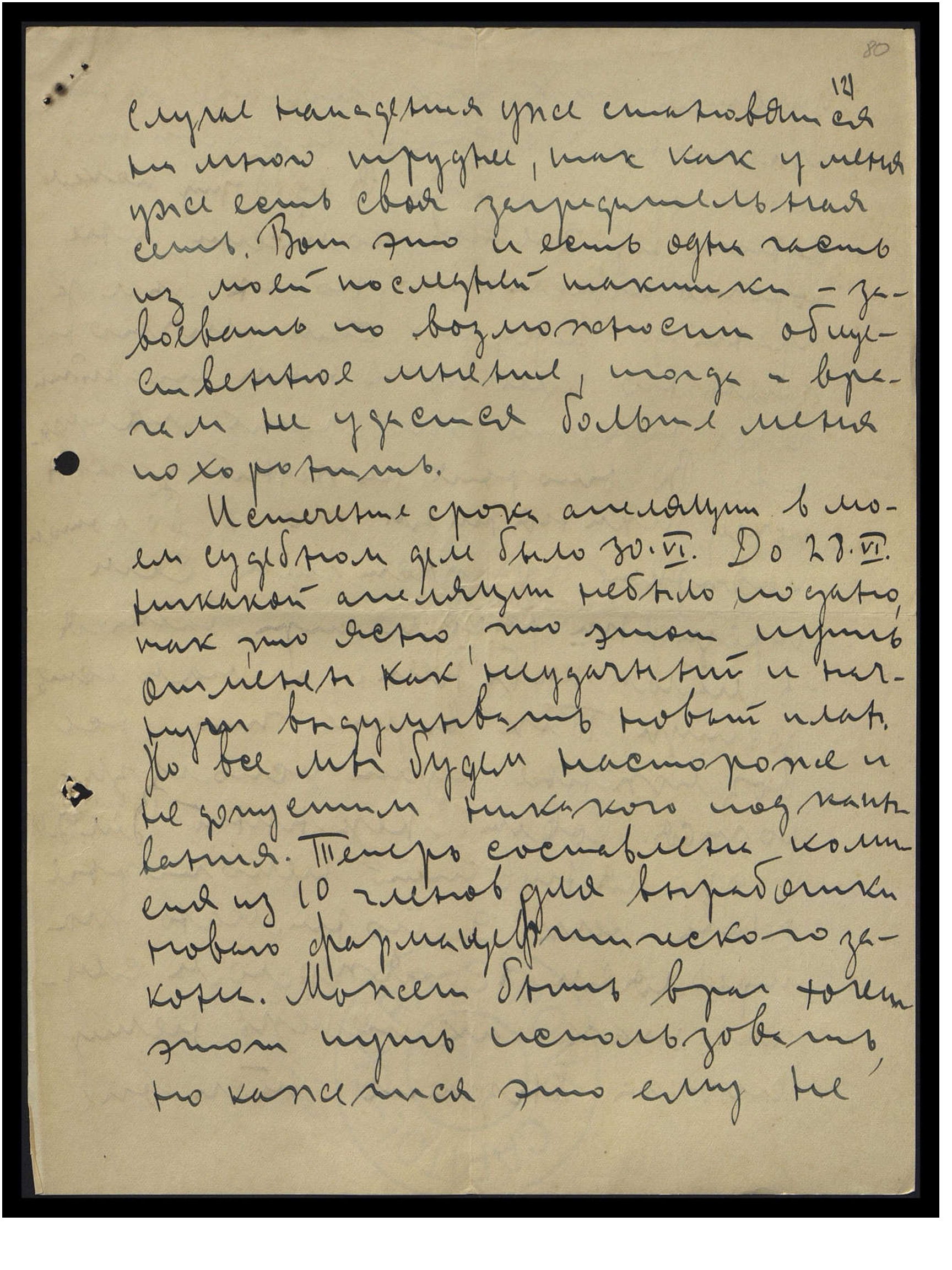 Истечение срока апелляции в моём судебном деле было 30.VI. До 28.VI никакой апелляции не было подано, так что ясно, что этот путь отменён как неудачный, и начнут выдумывать новый план. Но все мы будем настороже и не допустим никакого подкапывания. Теперь составлена комиссия из 10 членов для выработки нового фармацевтического закона. Может быть, враг хочет этот путь использовать, но кажется, это ему не