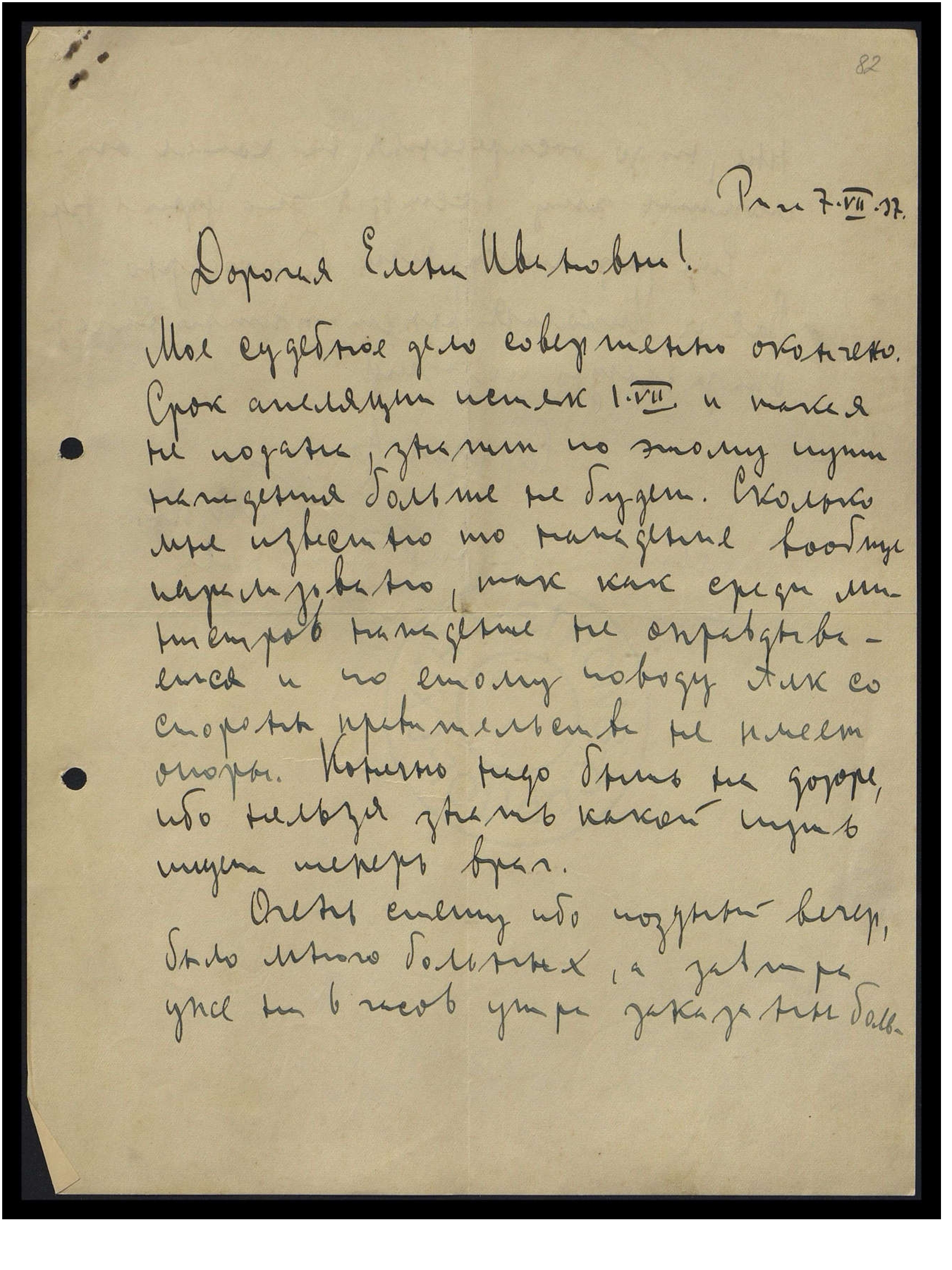 Моё судебное дело совершенно окончено. Срок апелляции истёк 1.VII, и такая не подана, значит, по этому пути нападения больше не будет. Сколько мне известно, то нападение вообще парализовано, так как среди министров нападение не оправдывается, и по этому поводу Алк со стороны правительства не имеет опоры. Конечно, надо быть на дозоре, ибо нельзя знать, какой путь теперь ищет враг.