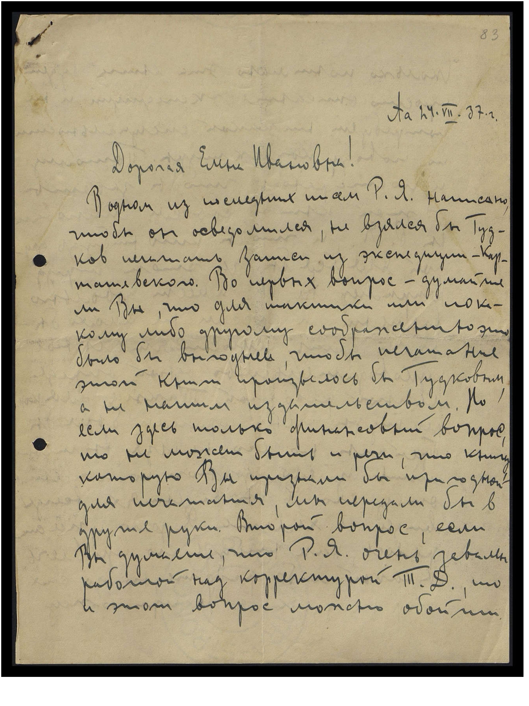 В одном из последних писем Р[ихарду] Я[ковлевичу] написано, чтобы он осведомился, не взялся бы Гудков печатать записи из экспедиции Карташевского. Во-первых, вопрос: думаете ли Вы, что для тактики или по какому-либо другому соображению это было бы выгоднее, чтобы печатание этой книги произвелось бы Гудковым, а не нашим издательством. Но если здесь только финансовый вопрос, то не может быть и речи, что книгу, которую Вы признали бы пригодной для печатания, мы передали бы в другие руки. Второй вопрос: если Вы думаете, что Р[ихард] Я[ковлевич] очень завален работой над корректурой "Т[айной] Д[октрины"], то и этот вопрос можно обойти.