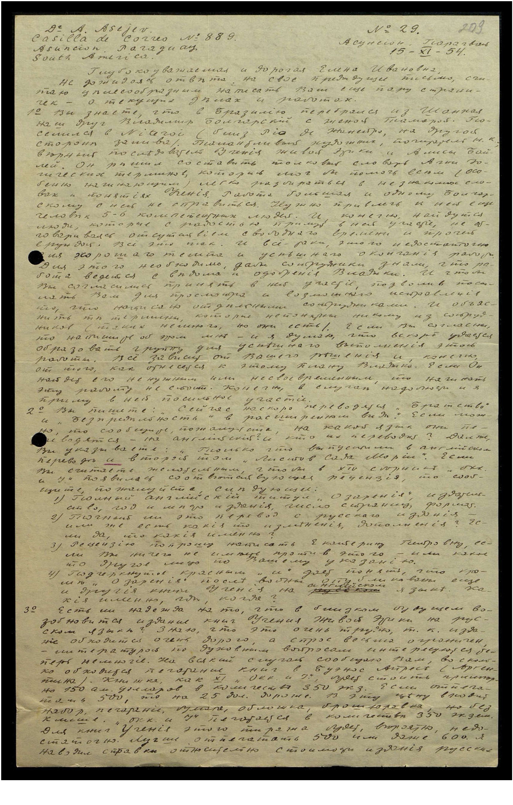 книг в Бразилии, Бельгии, Зап[адной] Германии и Франции, везде значительно дороже (в 2-3 раза!), чем в Буэнос-Айресе. Не говоря уже о Сев[ерной] Америке — там цены совершенно недоступны. Духовную литературу на русском языке сейчас лучше всего издавать в Буэнос-Айресе. В Парагвае, к сожалению, нет ни одной русской типографии. К сожалению, я лично не мог бы издавать книги Учения, т[ак] к[ак] зарабатываю меньше, чем нужно для скромной жизни; даже сборники "Окк[ультизма] и Й[оги]" выходят теперь совсем тоненькими, раз в год — и для того, чтобы расплатиться с типографией, приходится залезать в долги. Но мог бы взять на себя корректуру и организовать отправку книг за границу. Последнее очень сложно и трудно, т[ак] к[ак] в Аргентине не хватает бумаги, и потому при отправки книг за границу чинятся всяческие препятствия. Если моё материальное положение улучшится (на это есть надежда), то, конечно, я и денежно помогу изданию книг Учения на русском языке.