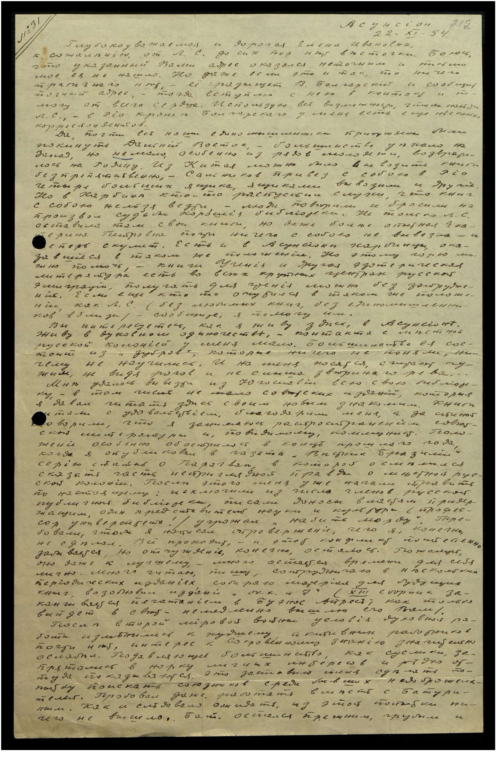 Вы спрашиваете, как живу я в Асунсьоне? Моё материальное положение незавидно, зарабатываю меньше, чем нужно для жизни, т[ак] к[ак] иностранные врачи не имеют здесь права практики, практикую только среди русской колонии, а это даёт гроши. Издание "Окк[ультизма] и Й[оги]", конечно, приносит дефицит, — чтобы покрывать его, принуждён продавать книги своей библиотеки. Это не выход из создавшегося положения, если так продолжится, рискую остаться без нужных мне книг, купить которые сейчас нигде нельзя. Потому мне кажется разумным собрать немного того золотого дождя, который щедро изливается американцами на некоторые эмигрантские организации и употребить его на издательские нужды. Конечно, не запачкавшись при этом в грязи и не потеряв своего лица. Вот почему я предложил "Институту по изучению истории и культуры СССР" написать для них работу о спиритуалистическом движении в Сов[етской] России. Материал у меня есть, это гл[авным] образом статьи М. Артемьева, опубликованные в начале 30-х годов в русской зарубежной прессе, и рассказы оккультистов, покинувших Сов[етскую] Россию во время и после войны. Конечно, я не собираюсь писать ничего такого, что могло бы повредить оставшимся на Родине братьям и сёстрам в Духе. Работа эта будет компилятивного характера, она соберёт воедино и, так сказать, приведёт к одному знаменателю те данные, ко-