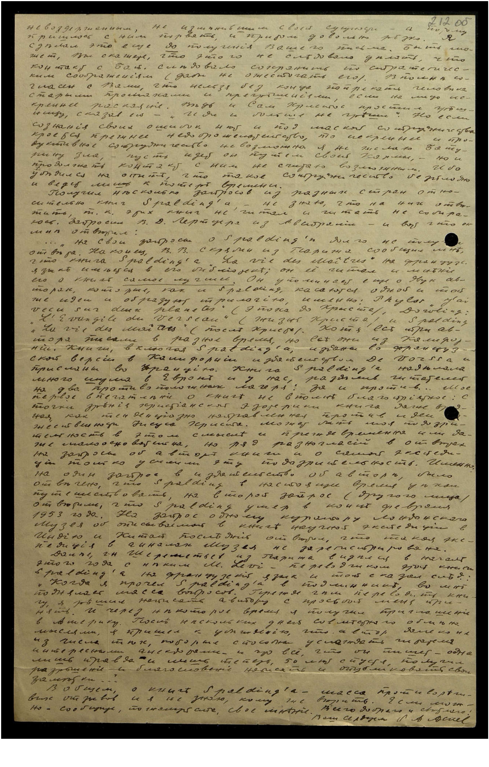..."На свои запросы о Spalding'е долго не полу[чал] ответа. Наконец В.В. Скрябин из Парижа сообщил мне, что книга Spalding'a "La vie des Maîtres [франц.: Жизнь Мастеров]" на французском языке имеется в его библиотеке; он её читал и мнение его о книге самое лучшее. Он упоминает ещё о двух авторах, которые, как и Spalding касаются одной и той же идеи и образуют трилогию, именно: Phylas "L'ai vecu sur deux planetes" [франц.: Филос "Гражданин двух планет"] (эпоха до Христа), Dowling** "L'Evangile du Verseau [франц. Доулинг "Евангелие Водолея"] (жизнь Христа) и Spolding "La vie des Maîtres" [франц.: Сполдинг "Жизнь Мастеров"] (после Христа). Хотя все три автора писали в разное время, но все они из Калифорнии. Книги, включая Spalding'a, изданы во французской версии в Калифорнии издательством De Vorssa и присланы во Францию. Книга Spalding'a наделала много шума в Европе и у нас, разделив читателей на два противоположных лагеря: за и против. Моё первое впечатление о книге не вполне благоприятное: с точки зрения христианской эзотерики книга даже вредная, как тенденциозно направленная против идеи [тор]жественности Исуса Христа. Может быть моя подозрительность в этом смысле и преждевременная или даже малоосновательная, но ряд разногласий в ответах на запросы об авторе книги и о самой экспедиции только усилили эту подозрительность. Именно: на один запрос в издательство об авторе было отвечено, что Spalding в настоящее время уехал путешествовать, на второй запрос (другого лица) ответили, что Spalding умер в конце февраля 1953 года. На запрос одному куратору Лондонского Музея об описываемой в книге научной экспедиции в Индию и Китай последний ответил, что такая экспедиция в анналах Музея не зарегистрирована.