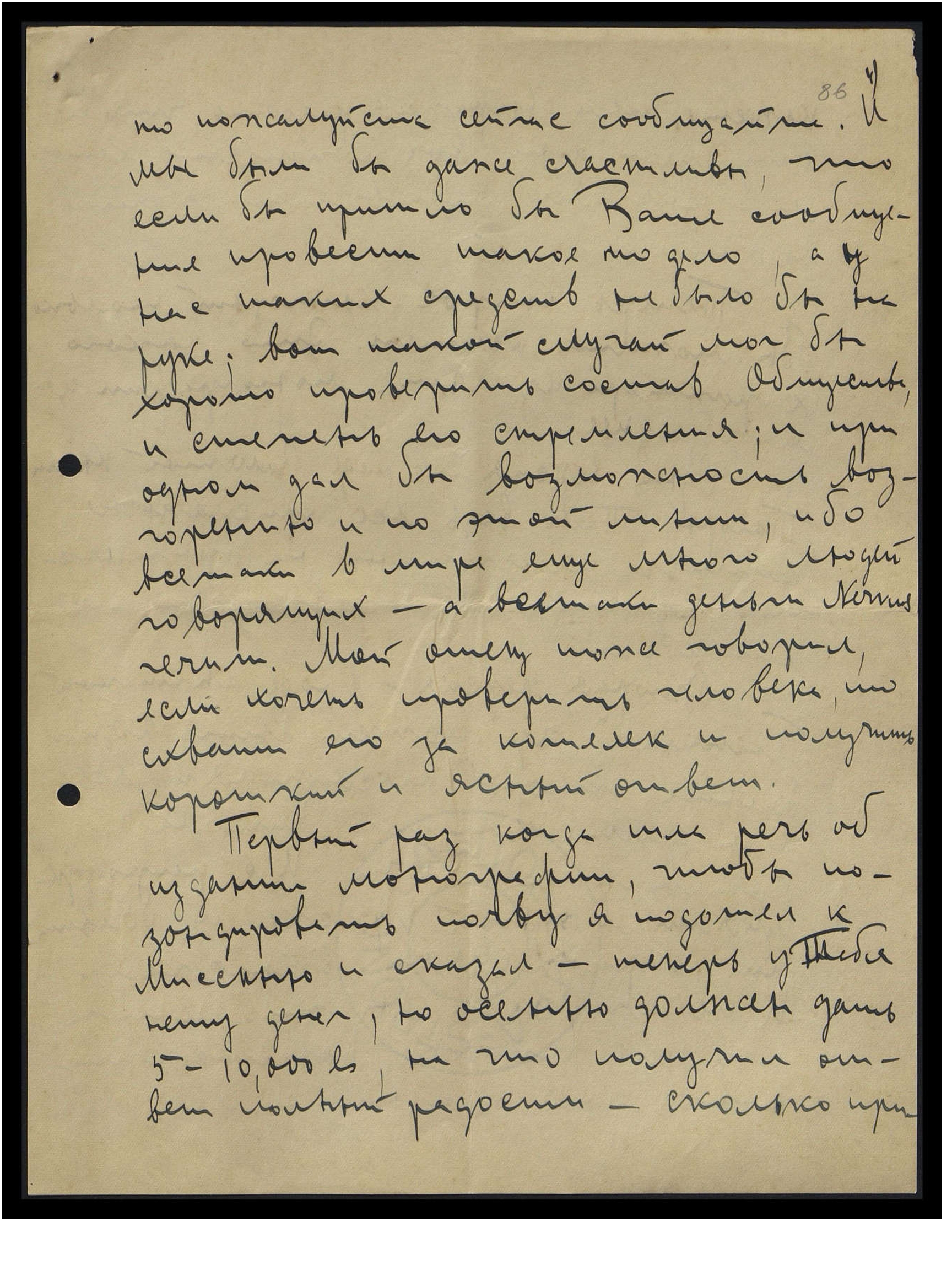 то, пожалуйста, сейчас сообщайте. И мы были бы даже счастливы, что если бы пришло бы Ваше сообщение, провести такое-то дело, а у нас таких средств не было бы на руке; вот такой случай мог бы хорошо проверить состав Общества и степень его стремления; и при одном дал бы возможность возгоранию и по этой линии, ибо всё-таки в мире ещё много людей говорящих - а всё-таки деньги Nervus rerum [лат.: нервные явления]. Мой отец тоже говорил, если хочешь проверить человека, схвати его за кошелёк и получишь короткий и ясный ответ.