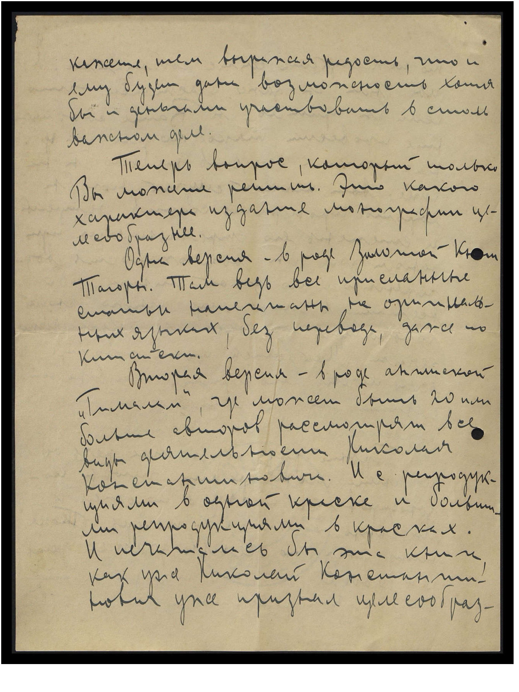 Вторая версия — вроде английской "Гималаи", где, может быть, 20 или больше авторов рассмотрят все виды деятельности Николая Константиновича. И с репродукциями в одной краске и большими репродукциями в красках. И печаталась бы эта книга, как уже Николай Константинович уже признал целесообраз-