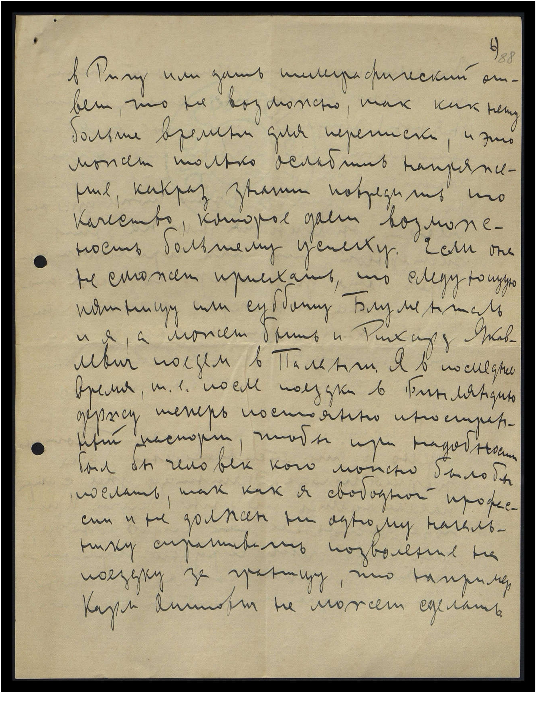 в Ригу или дать телеграфический ответ, что невозможно, так как нету больше времени для переписки, и это может только ослабить напряжение, как раз, значит, повредить то качество, которое даёт возможность большему успеху. Если она не сможет приехать, то в следующую пятницу или субботу Блументаль и я, а, может быть, и Рихард Яковлевич поедем в Палангу. Я в последнее время, т.е. после поездки в Финляндию держу теперь постоянно иностранный паспорт, чтобы при надобности был бы человек, кого можно было бы послать. Так как я свободной профессии и не должен ни одному начальнику спрашивать позволения на поездку за границу, что, например, Карл Оттович не может сделать.