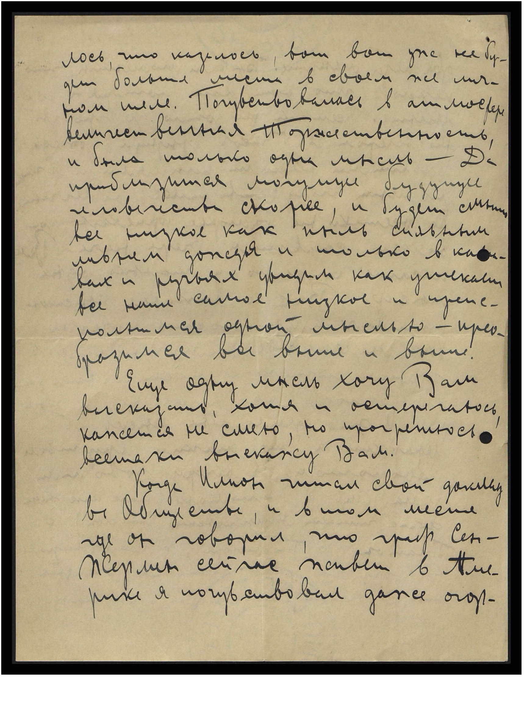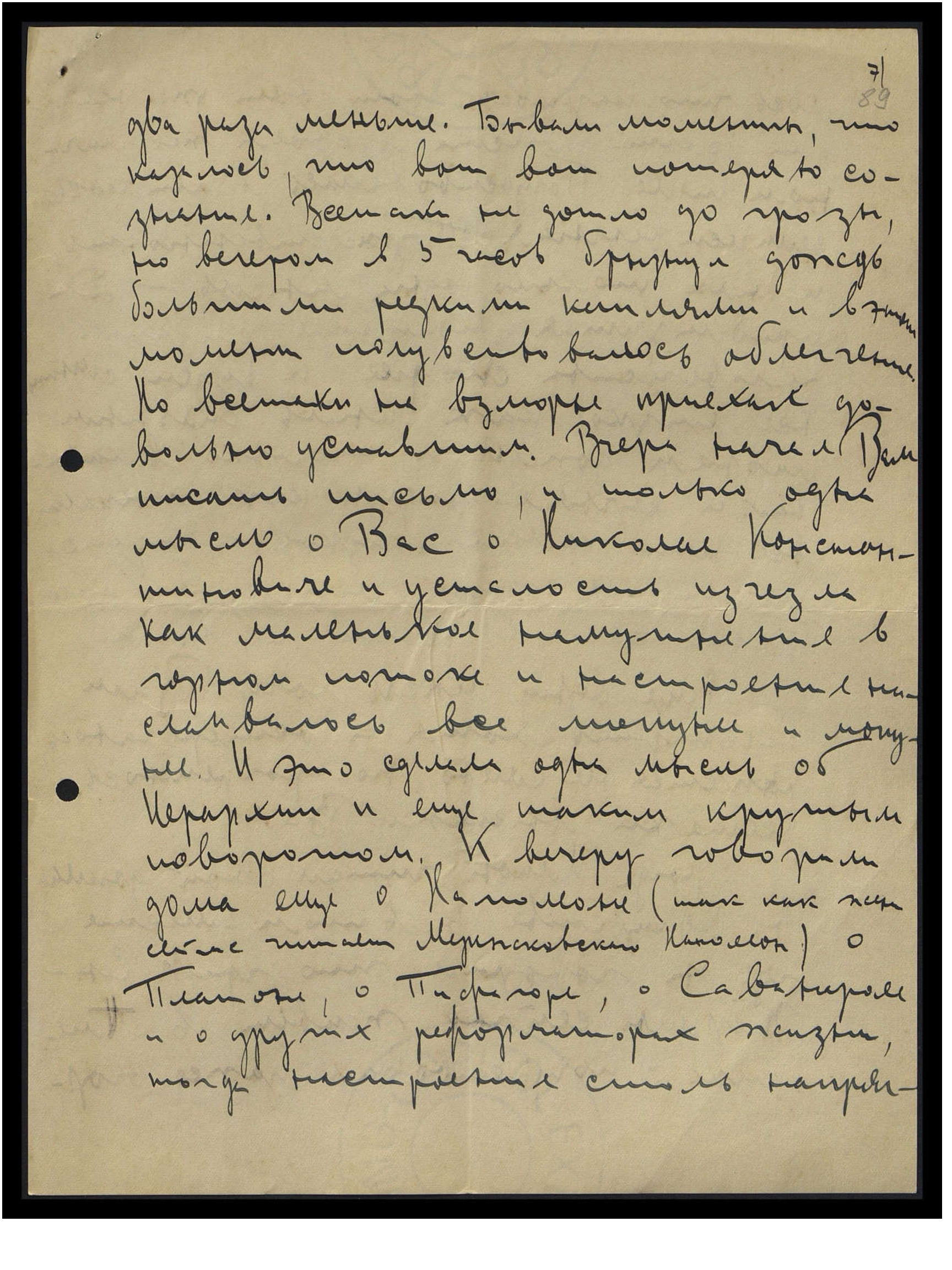[в] два раза меньше. Бывали моменты, что казалось, что вот-вот потеряю сознание. Всё-таки не дошло до грозы, но вечером в 5 часов брызнул дождь большими редкими каплями, и в этот момент почувствовалось облегчение. Но всё-таки на взморье приехал довольно уставшим. Вчера начал Вам писать письмо, и только одна мысль о Вас, о Николае Константиновиче — и усталость исчезла, как маленькое помутнение в горном потоке, и настроение становилось всё могучее и могучее. И это сделала одна мысль об Иерархии и ещё таким крупным поворотом. К вечеру говорили дома ещё о Наполеоне (так как жена сейчас читает Мережковского "Наполеон"), о Платоне, о Пифагоре, о Савонароле и о других реформаторах жизни, тогда настроение столь напряг-