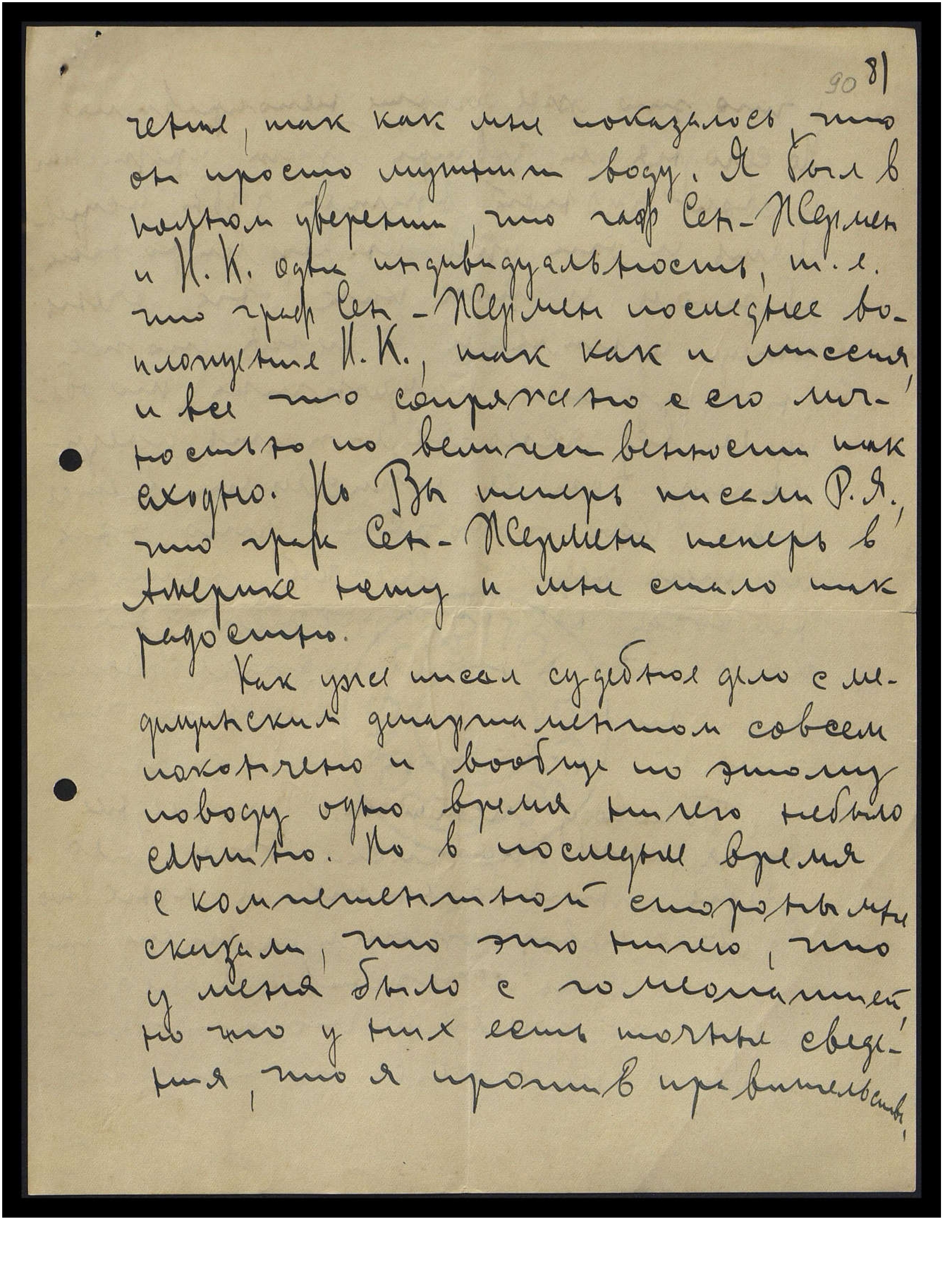 чение, так как мне показалось, что он просто мутит воду. Я был в полном уверении, что граф Сен-Жермен и Н[иколай] К[онстантинович] — одна индивидуальность, т.е., что граф Сен-Жермен — последнее воплощение Н[иколая] К[онстантиновича], так как и миссия, и всё, что сопряжено с его личностью по величественности так сходно. Но Вы теперь писали Р[ихарду] Я[ковлевичу], что графа Сен-Жермена теперь в Америке нету, и мне стало так радостно.