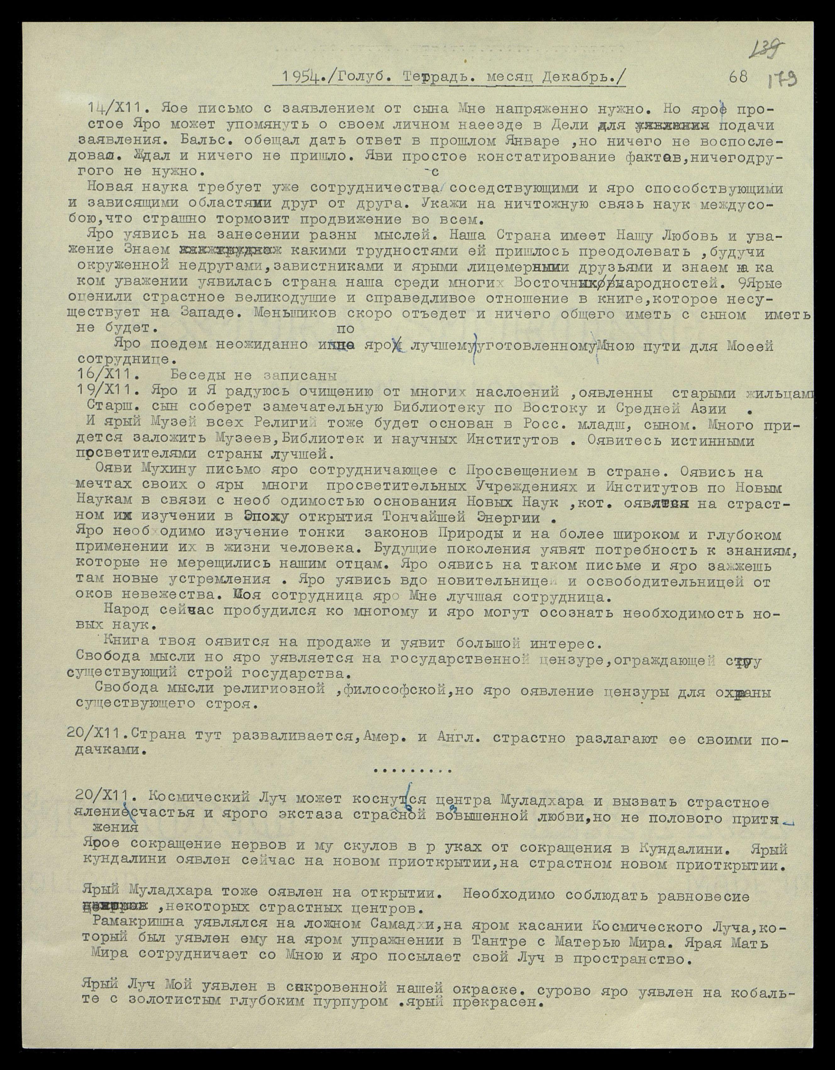19/ХII. Яро и Я радуюсь очищению от многих наслоений, оявленных старыми жильцами. Старш[ий] сын соберет замечательную библиотеку по Востоку и Средней Азии. И ярый Музей всех Религий тоже будет основан в Росс[ии] младш[им] сыном. Много придется заложить музеев, библиотек и научных институтов. Оявитесь истинными просветителями страны лучшей.
