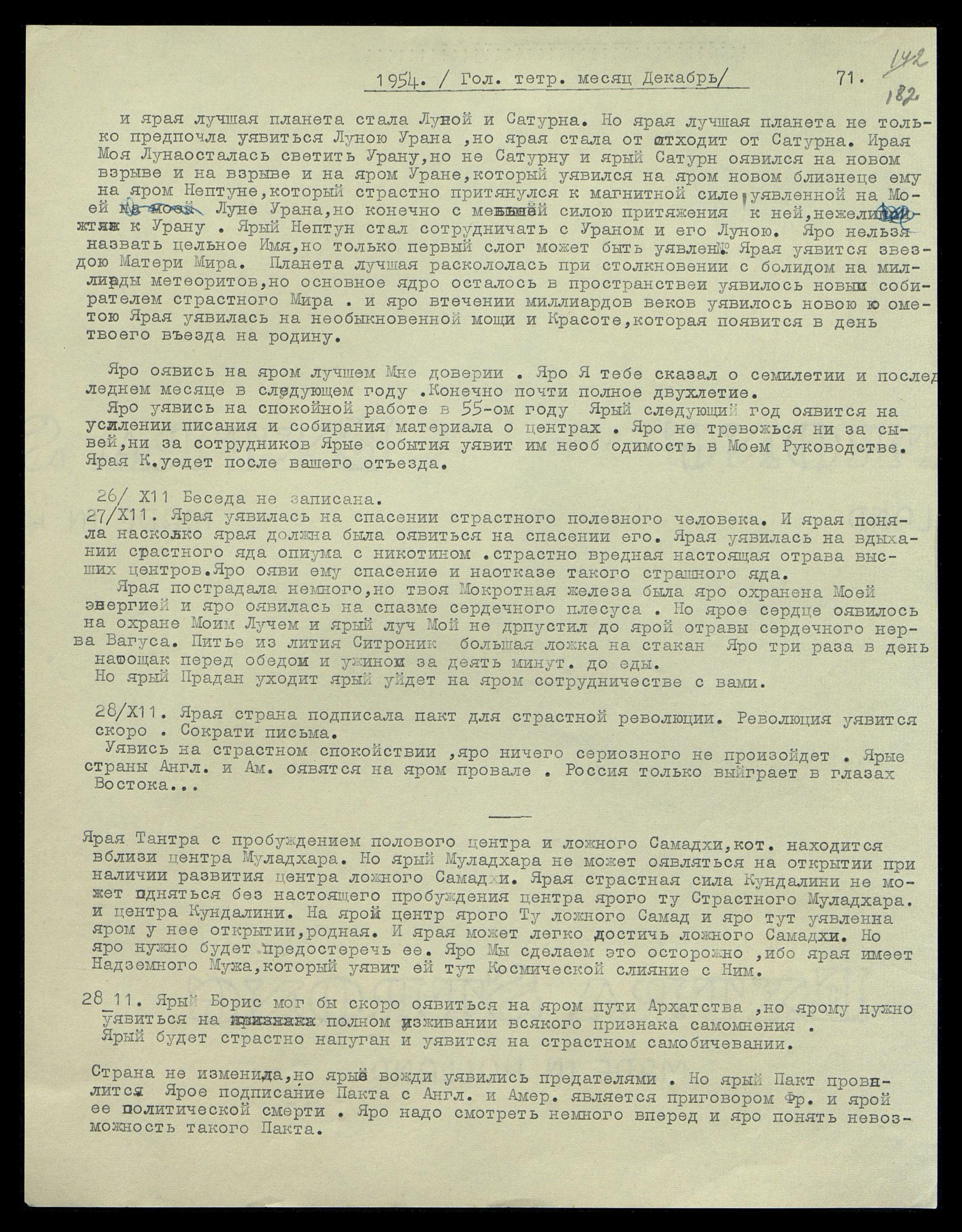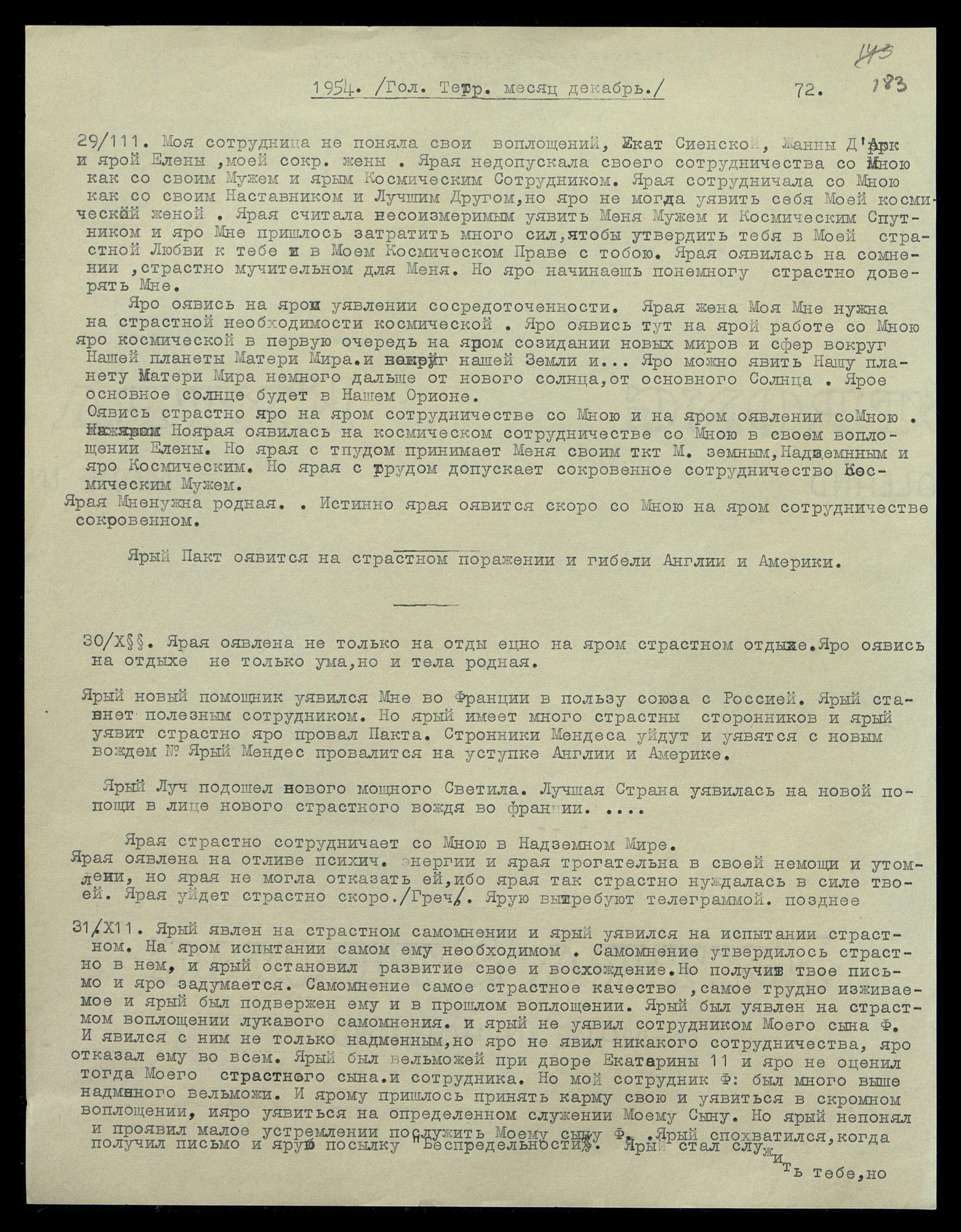 31/ХII. Ярый явлен на страстном самомнении и ярый уявился на испытании страстном. На яром испытании самом ему необходимом. Самомнение утвердилось страстно в нем, и ярый остановил развитие свое и восхождение. Но получив твое письмо, и яро задумается. Самомнение − самое страстное качество, самое трудно изживаемое и ярый был подвержен ему и в прошлом воплощении. Ярый был уявлен на страстном воплощении лукавого самомнения, и ярый не уявил сотрудником Моего сына Ф[уяму]. И явился с ним не только надменным, но яро не явил никакого сотрудничества, яро отказал ему во всем. Ярый был вельможей при дворе Екатерины II и яро не оценил тогда Моего страстного сына и сотрудника. Но мой сотрудник Ф[уяма] был много выше надменного вельможи. И ярому пришлось принять карму свою и уявиться в скромном воплощении, и яро уявиться на определенном служении Моему Сыну. Но ярый не понял и проявил малое устремлении послужить Моему сыну Ф[уяме]. Ярый спохватился, когда получил письмо и ярую посылку "Беспредельности". Ярый стал служить тебе,