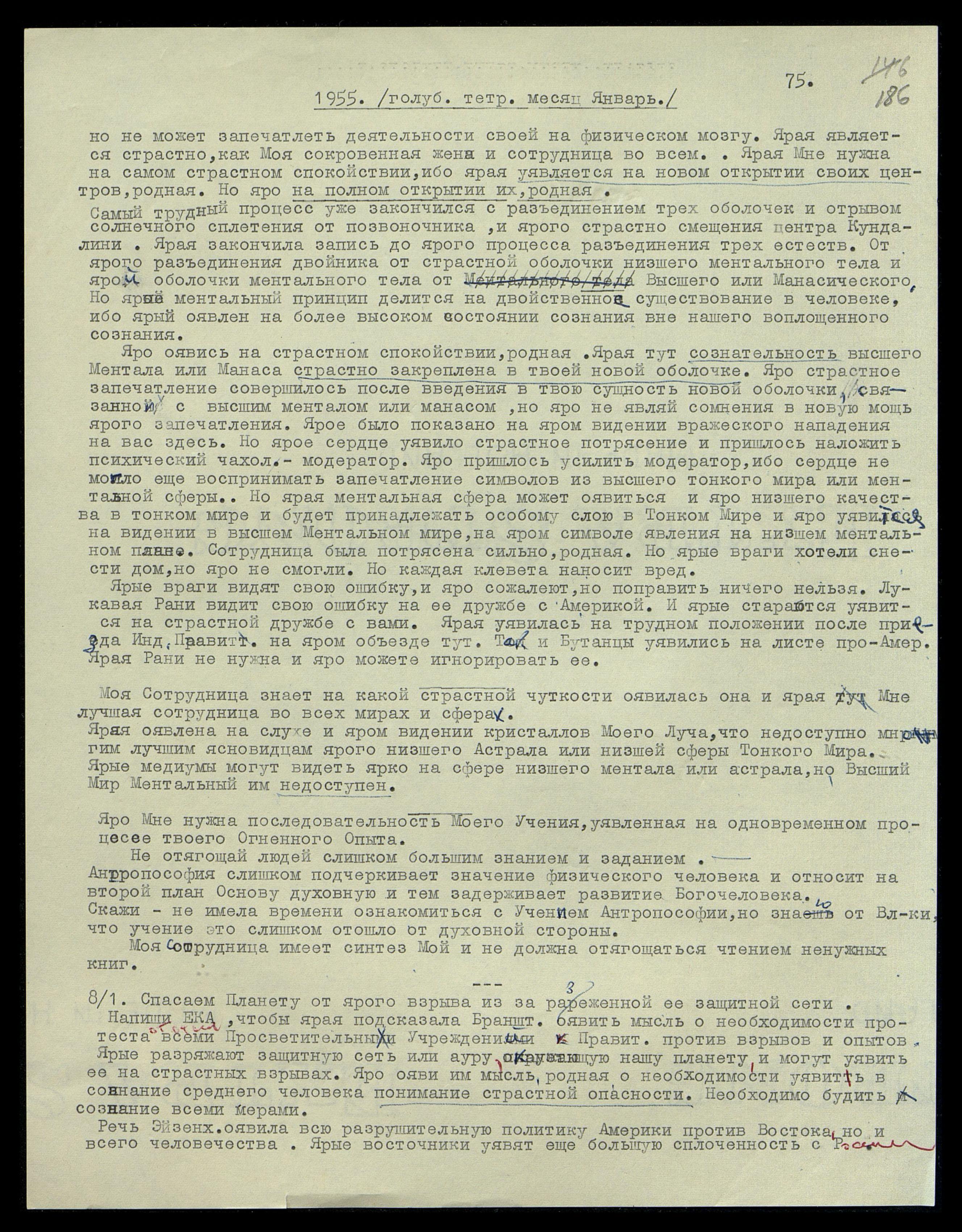 Напиши Ека[терине Инге], чтобы ярая подсказала Браншт[етеру] оявить мысль о необходимости протеста от всех Просветительных Учреждений к Правит[ельству] против [атомных] взрывов и опытов. Ярые разряжают защитную сеть или ауру, окружающую нашу планету, и могут уявить ее на страстных взрывах. Яро ояви им мысль, родная, о необходимости уявить в сознание среднего человека понимание страстной опасности. Необходимо будить сознание всеми мерами.
