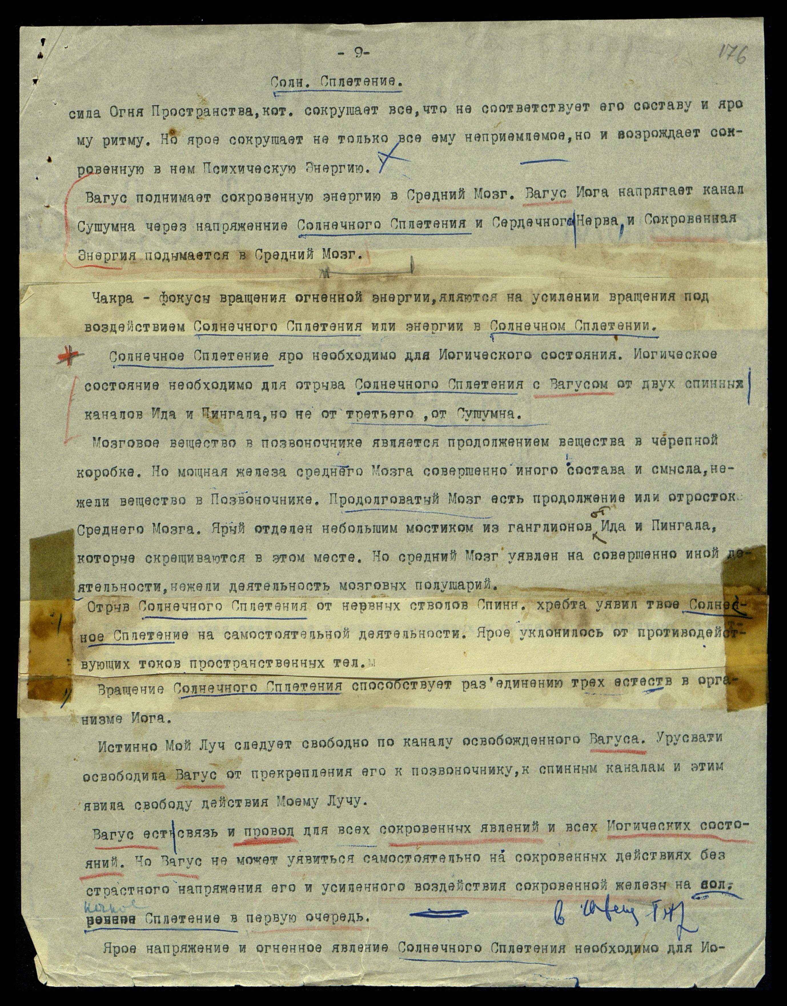 До приступа страстного вращения Солнечного Сплет[ения] Урусвати оявилась на страстном напряжении и боли в голове и зубах, но после падения боль и напряжение прошли, и только немного спустя легкая зубная боль вернулась, но напряжение в голове совершенно прекратилось. Ярая уявилась на большом сердечном утомлении, но зато сотрудница Моя уявилась на отрыве нервной нити Солнечного Сплетения, привязывавшей сплетение к позвоночнику. В течение нескольких дней, ощущались сильные боли в крестце и я не могла свободно вставать и садиться.