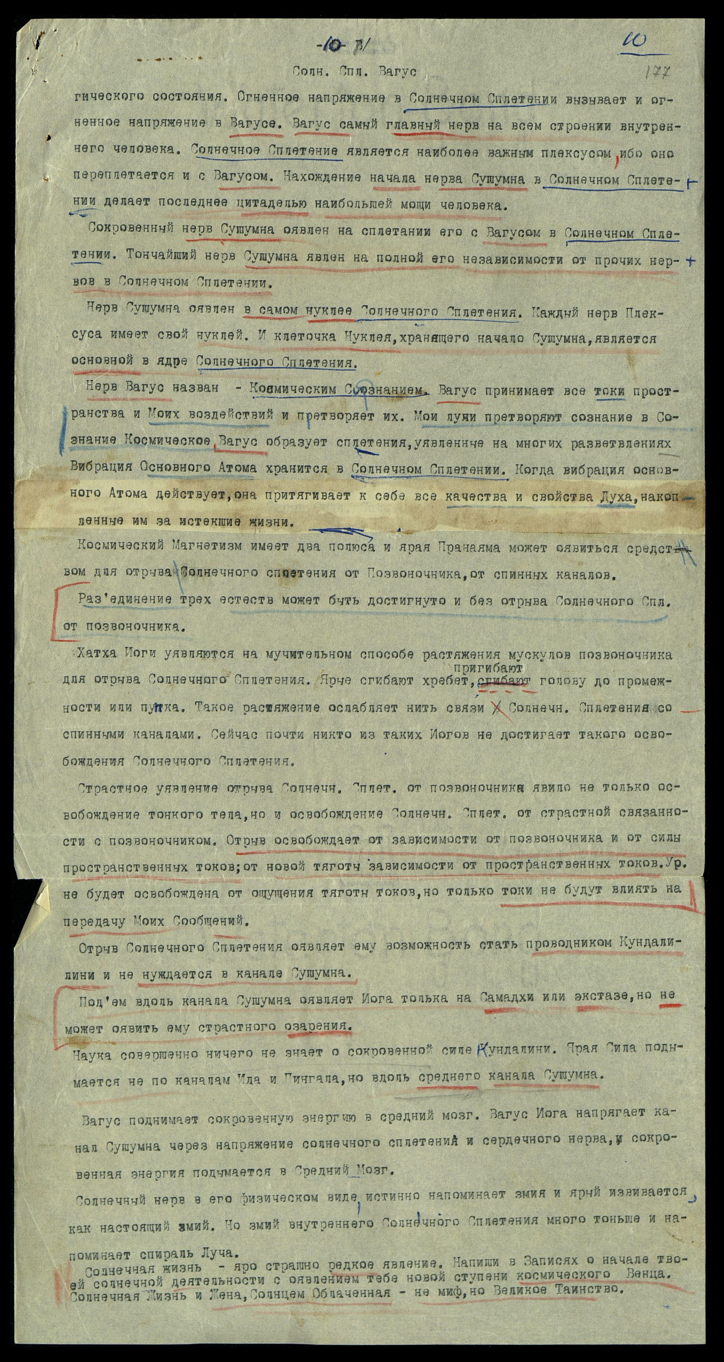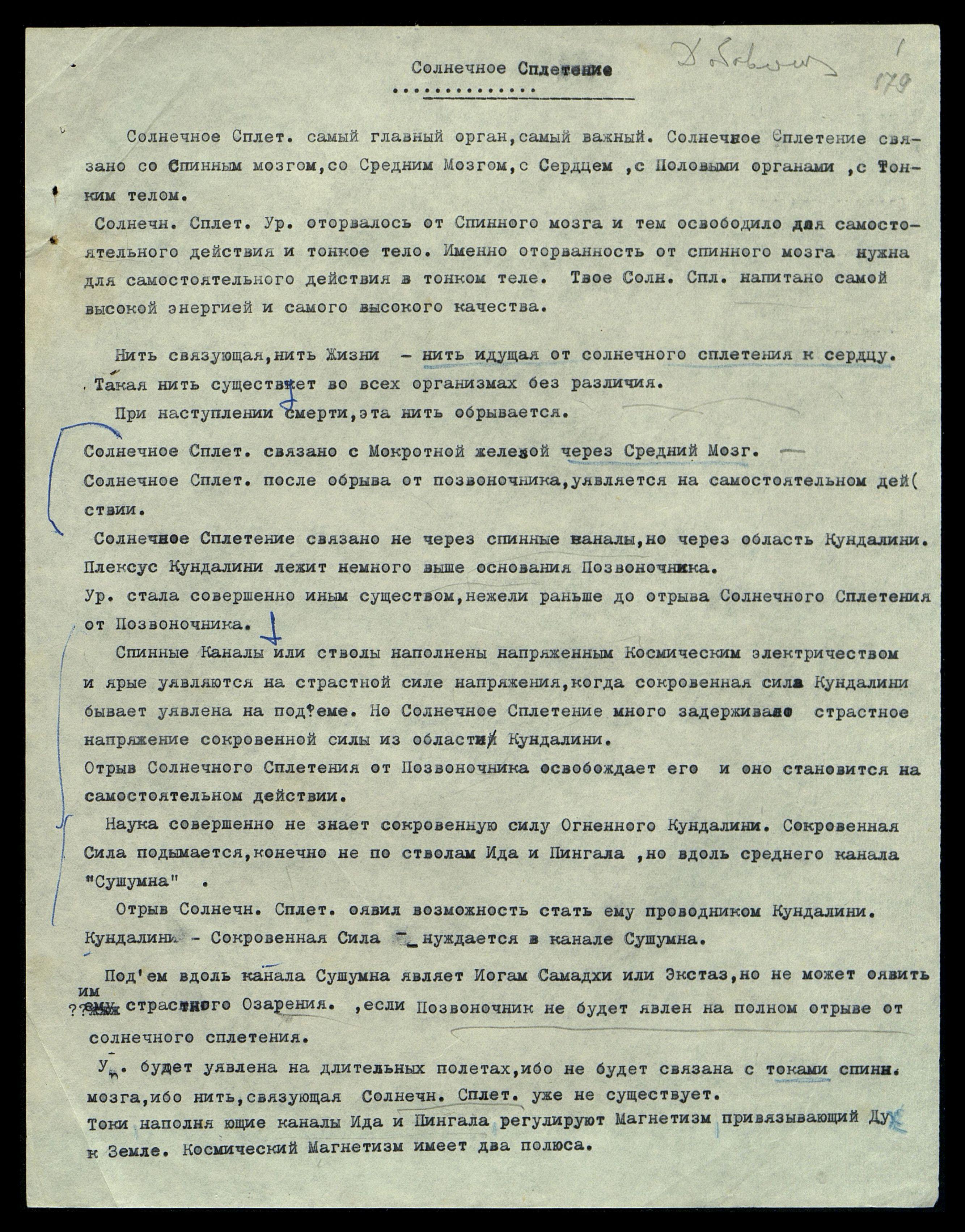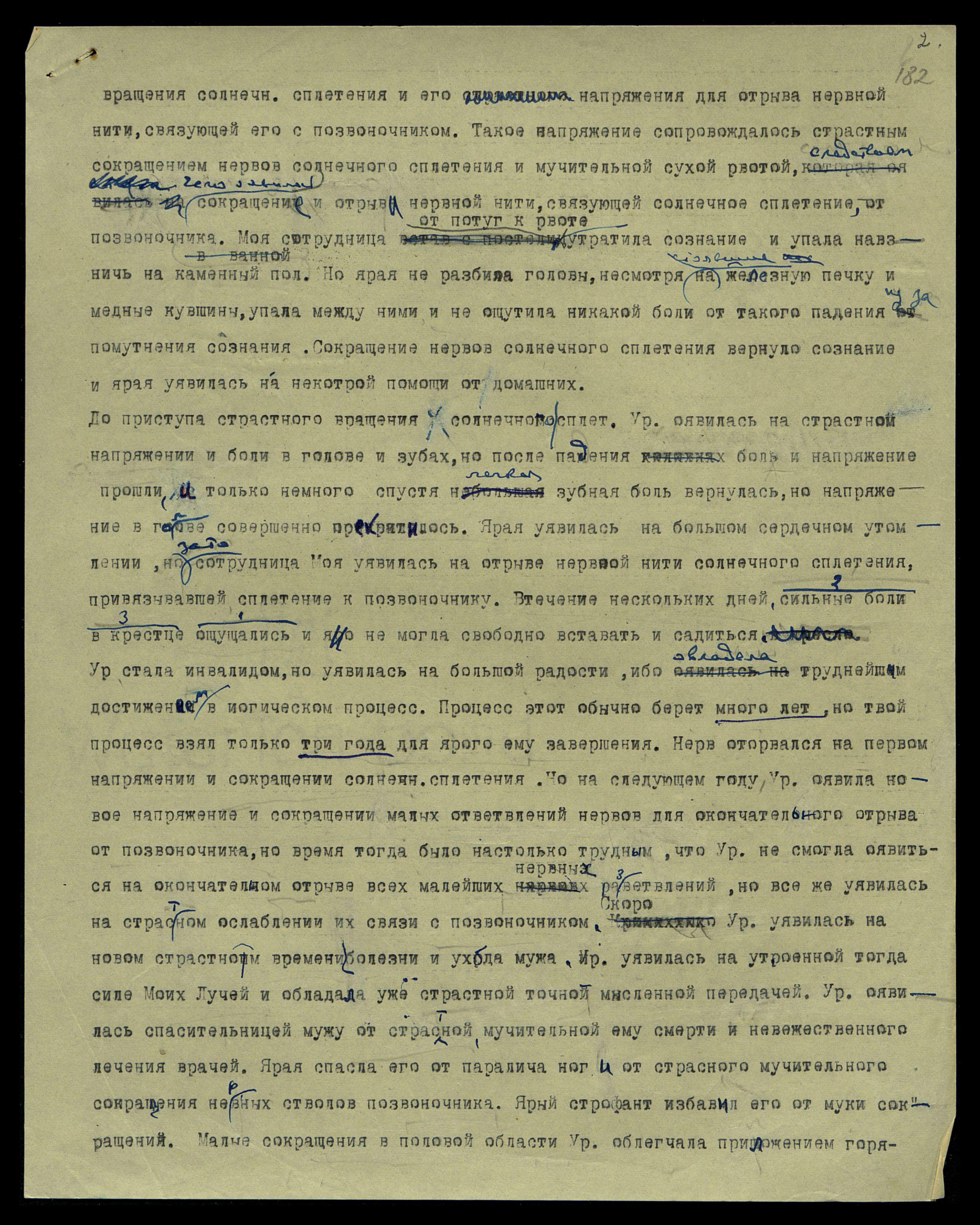 вращения Солнечн[ого] Сплетения и его напряжения для отрыва нервной нити, связующей его с позвоночником. Такое напряжение сопровождалось страстным сокращением нервов Солнечного Сплетения и мучительной сухой рвотой, следствием чего оявилось сокращение и отрыв нервной нити, связующей Солнечное Сплетение, от позвоночника. Моя сотрудница от потуг к рвоте утратила сознание и упала навзничь на каменный пол. Но ярая не разбила головы, несмотря на стоявшие железную печку и медные кувшины, упала между ними и не ощутила никакой боли от такого падения из-за помутнения сознания. Сокращение нервов Солнечного Сплетения вернуло сознание и ярая уявилась на некоторой помощи от домашних.