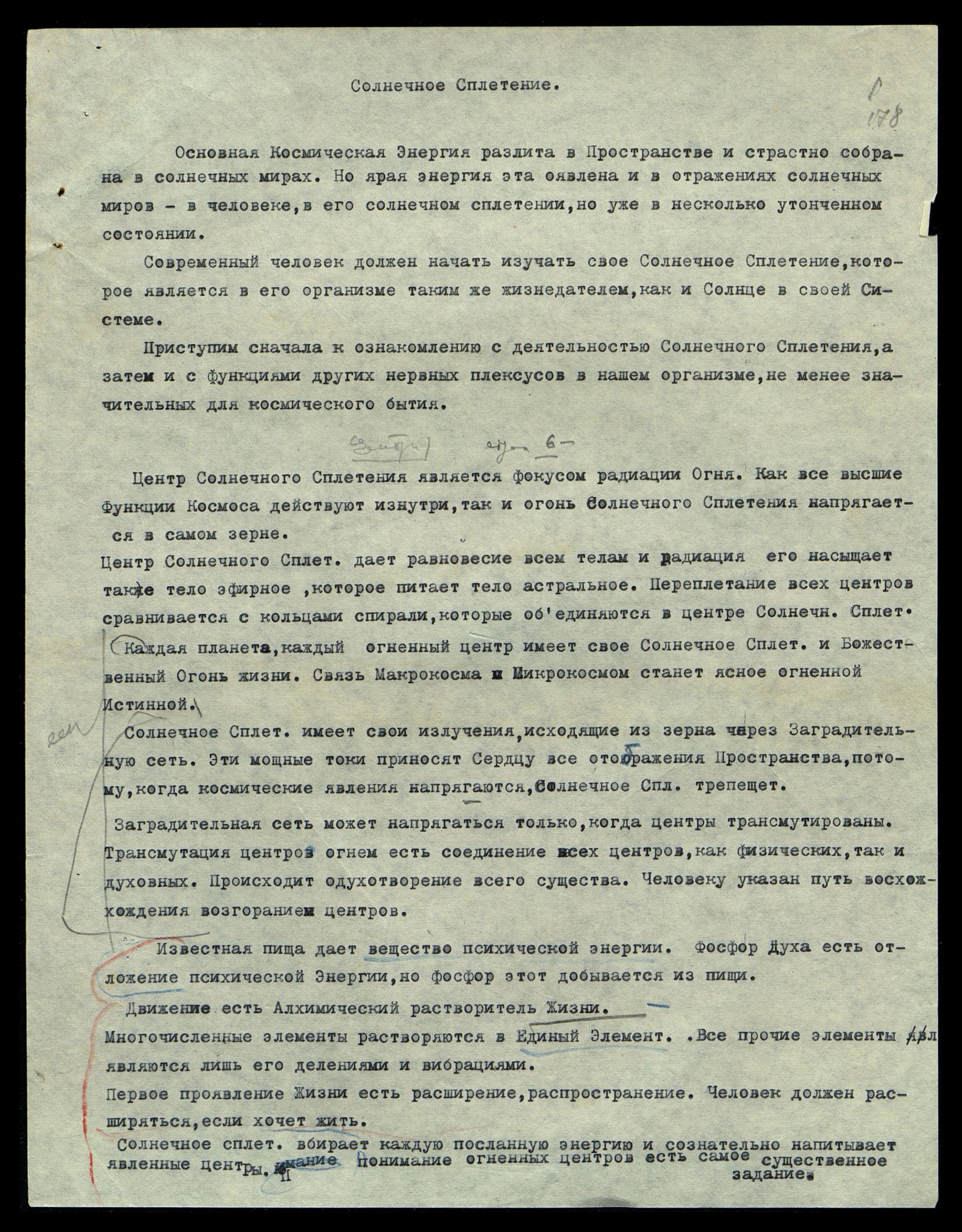 Центр Солнечного Сплет[ения] дает равновесие всем телам и радиация его насыщает также тело эфирное, которое питает тело астральное. Переплетание всех центров сравнивается с кольцами спирали, которые объединяются в центре Солнечн[ого] Сплет[ения]. Каждая планета, каждый огненный центр имеет свое Солнечное Сплет[ение] и Божественный Огонь жизни. Связь Макрокосма с Микрокосмом станет огненной Истинной.