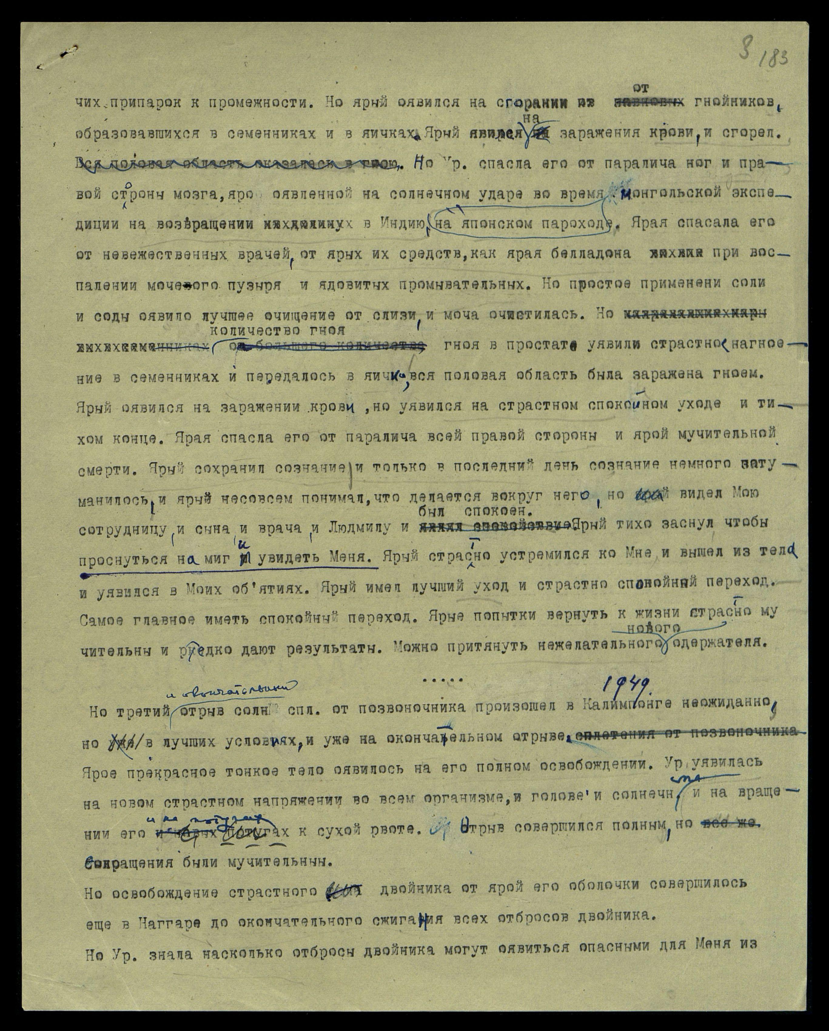 Ярое, прекрасное тонкое тело оявилось на его полном освобождении. Урусвати уявилась на новом страстном напряжении во всем организме и голове, и Солнечн[ом] Спл[етении], и на вращении его, и на потугах к сухой рвоте. Отрыв совершился полным, но сокращения были мучительны.
