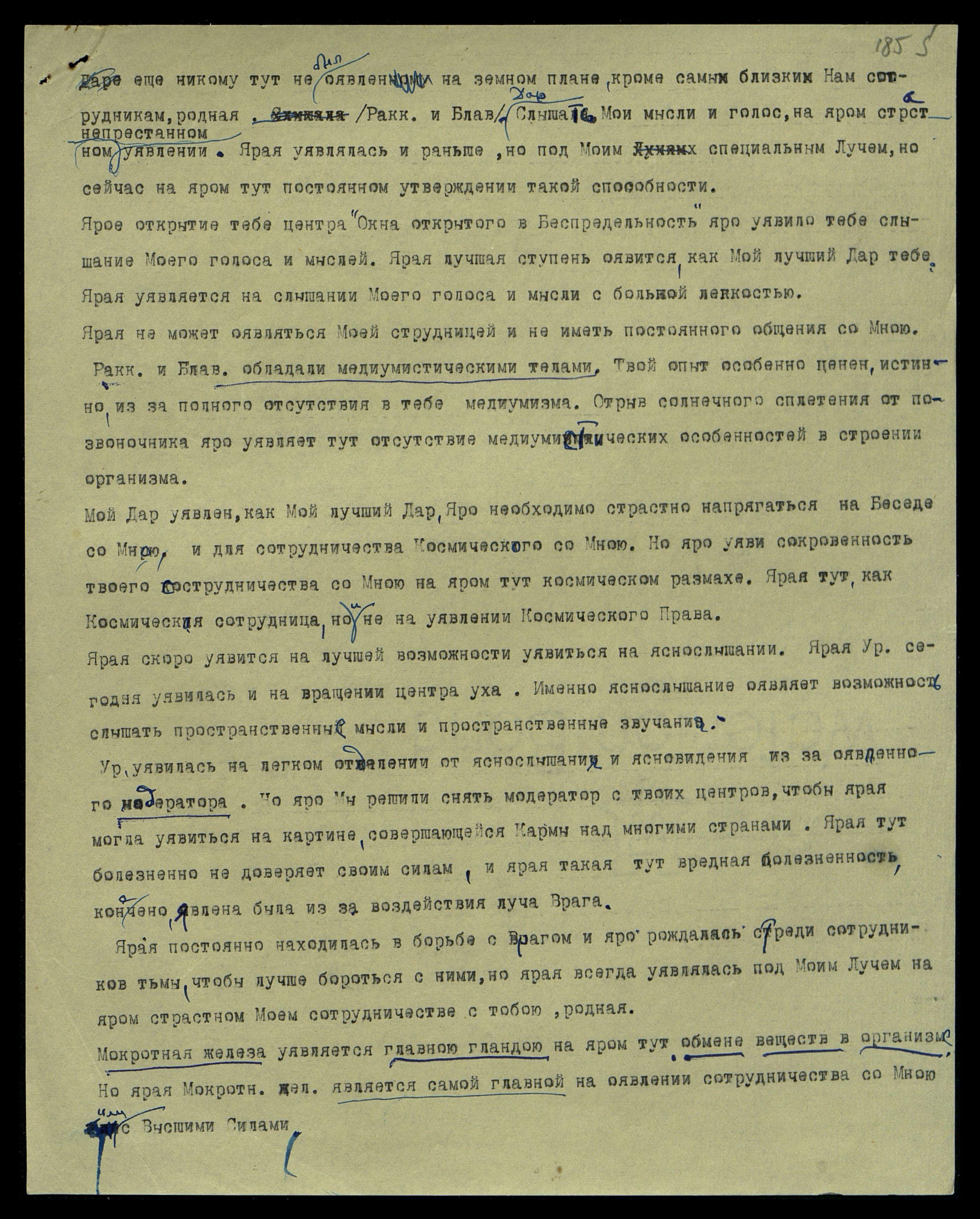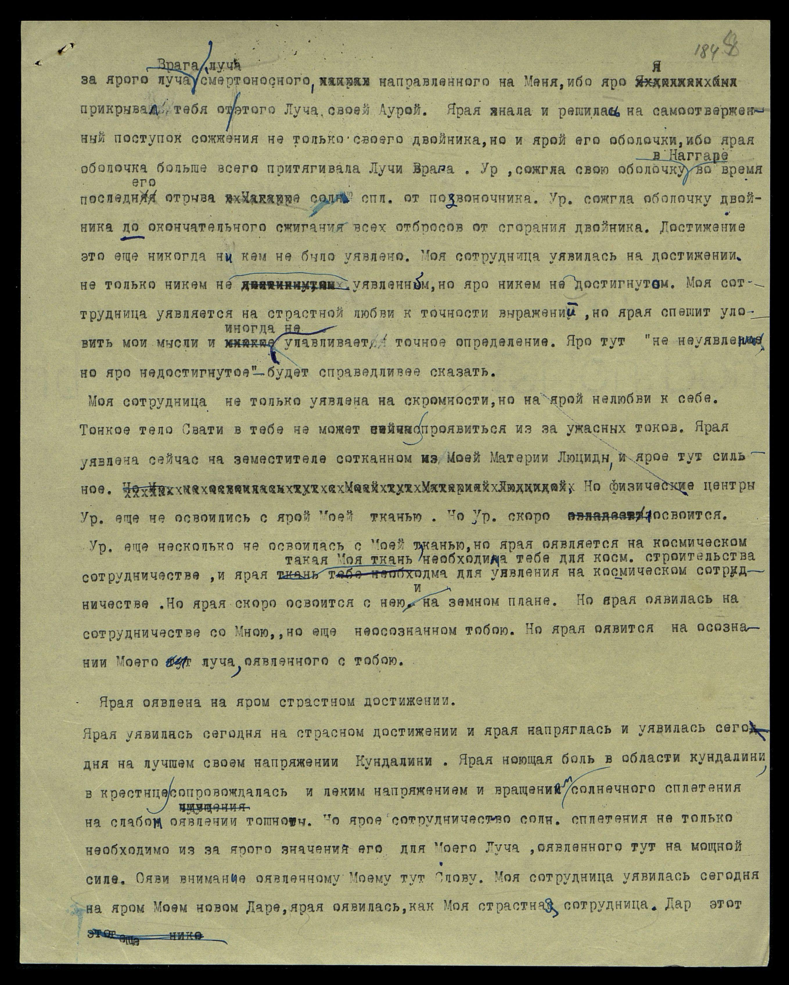 Тонкое тело Свати в тебе не может сейчас проявиться из-за ужасных токов. Ярая уявлена сейчас на заместителе, сотканном из Моей Материи Люциды, и ярое тут сильное. Но физические центры Урусвати еще не освоились с ярой Моей тканью, но ярая оявляется на космическом сотрудничестве, и ярая такая Моя ткань необходима тебе для Косм[ического] строительства. Но ярая скоро освоится с нею и на земном плане. Но ярая оявилась на сотрудничестве со Мною, но еще неосознанном тобою. Но ярая оявится на осознании Моего луча, оявленного с тобою.
