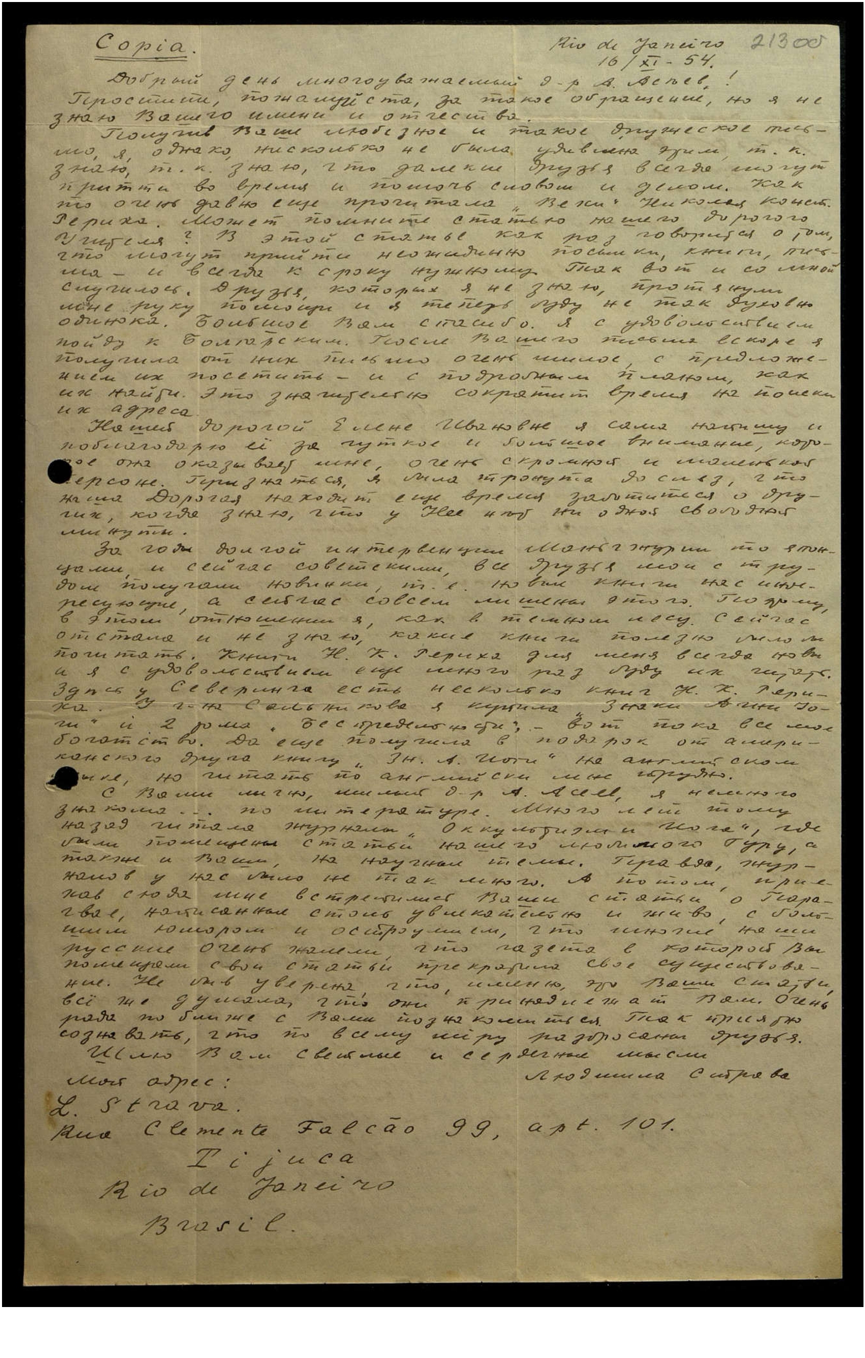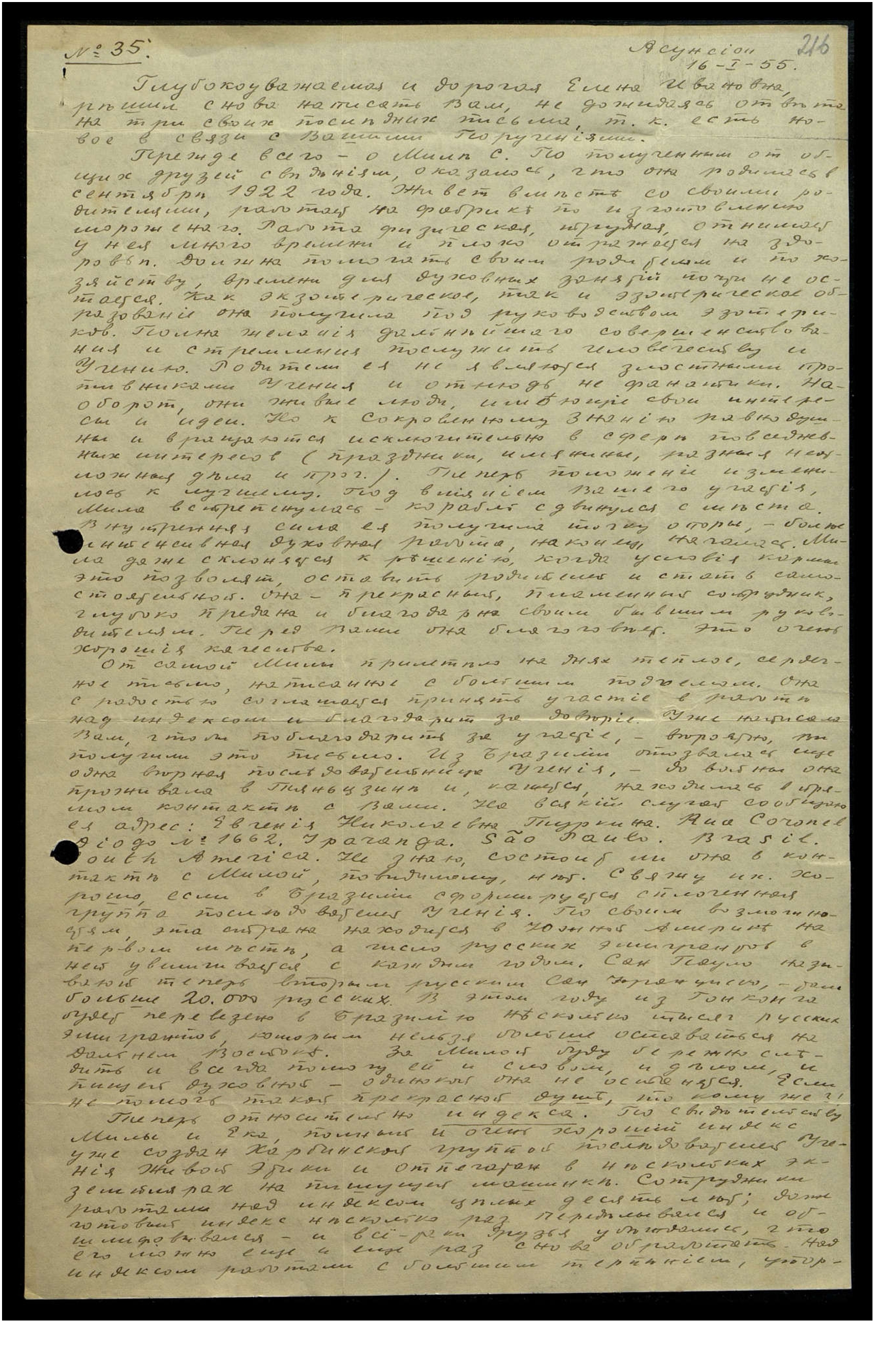 От самой Милы прилетело на днях тёплое, сердечное письмо, написанное с большим подъёмом. Она с радостью соглашается принять участие в работе над индексом и благодарит за доверие. Уже написала Вам, чтобы поблагодарить за участие, — вероятно, Вы получили это письмо. Из Бразилии отозвалась ещё одна верная последовательница Учения — до войны она проживала в Тяньцзине и, кажется, находилась в прямом контакте с Вами. На всякий случай сообщаю её адрес: Евгения Николаевна Туркина. Ria Coronel Diogo №1662. Jparanga. Sao Paulo. Brasil. South America. Не знаю, состоит ли она в контакте с Милой, по-видимому, нет. Свяжу их. Хорошо, если в Бразилии сформируется сплочённая группа последователей Учения. По своим возможностям эта страна находится в Южной Америке на первом месте, а число русских эмигрантов в ней увеличивается с каждым годом. Сан-Пауло называют теперь вторым русским Сан-Франциско, там больше 20.000 русских. В этом году из Гонконка будет перевезено в Бразилию несколько тысяч русских эмигрантов, которым нельзя больше оставаться на Дальнем Востоке. За Милой буду бережно следить и всегда помогу ей и словом, и делом, и пищей духовной — одинокой она не останется. Если не помочь такой прекрасной душе, то кому же?!