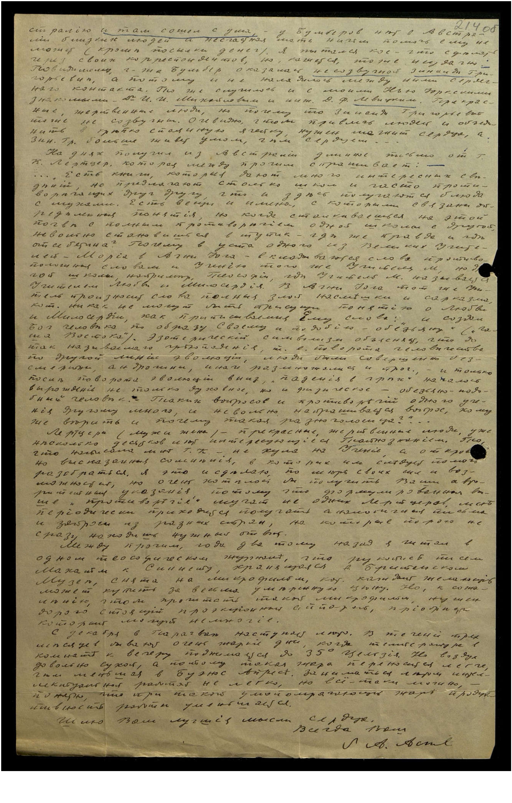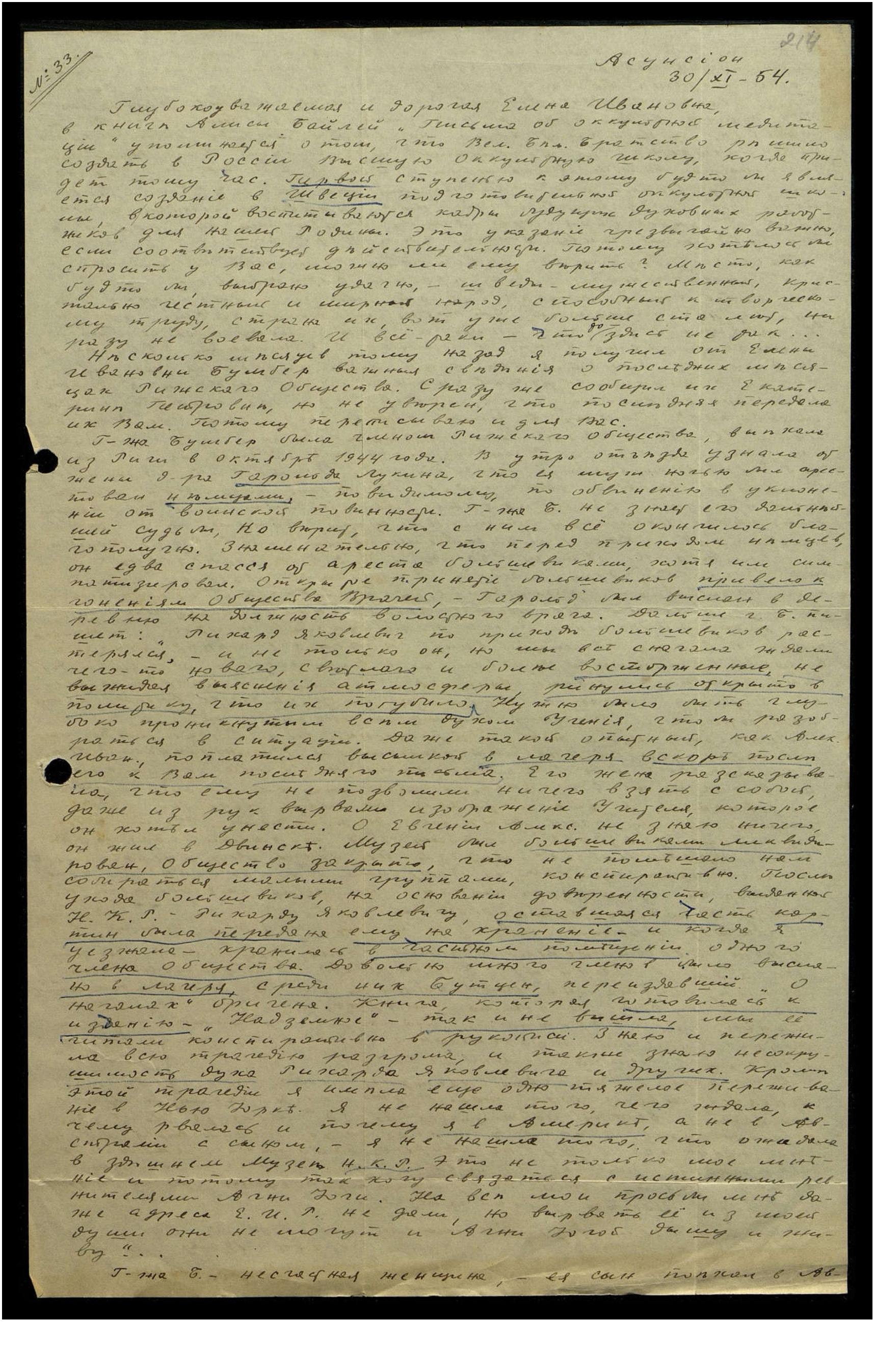 Г[оспо]жа Бумбер была членом Рижского Общества, выехала из Риги в октябре 1944 года. В утро отъезда узнала от жены д[окто]ра Гарольда Лукина, что её муж ночью был арестован немцами, по-видимому, по обвинению в уклонении от воинской повинности. Г[оспо]жа Б[умер] не знает его дальнейшей судьбы, но верит, что с ним всё окончилось благополучно. Знаменательно, что перед приходом немцев, он едва спасся от ареста большевиками, хотя им симпатизировал. Открытое принятие большевиков привело к гонениям Общества Врачей — Гарольд был выслан в деревню на должность волостного врача. Дальше г[оспо]жа Б[умер] пишет: "Рихард Яковлевич по приходе большевиков растерялся, и не только он, но мы все сначала ждали чего-то нового, светлого и более восторженные, не выжидая выяснения атмосферы, ринулись открыто в политику, что их погубило. Нужно было быть глубоко проникнутым всем духом Учения, чтобы разобраться в ситуации. Даже такой опытный, как Алек[сандр] Иван[ович]*, поплатился высылкой в лагеря вскоре после его к Вам последнего письма. Его жена рассказывала, что ему не позволили ничего взять с собой, даже из рук вырвали изображение Учителя, которое он хотел унести. О Евгении Алекс. не знаю ничего, он жил в Двинске. Музей был большевиками ликвидирован, Общество закрыто, что не помешало нам собираться малыми группами, конспиративно. После ухода большевиков, на основании доверенности, выданной Н[иколаем] К[онстантиновичем] Р[ерихом] — Рихарду Яковлевичу, оставшаяся часть картин была передана ему на хранение, и когда я уезжала — хранилась в частном помещении одного члена общества. Довольно много членов было выслано в лагеря, среди них Буцен**, переиздавший "О началах" Оригена. Книга, которая готовилась к изданию — "Надземное" — так и не вышла, мы её читали конспиративно в рукописи. Знаю и переживала всю трагедию разгрома, и также знаю несокрушимость духа Рихарда Яковлевича и других. Кроме этой трагедии я имела ещё одно тяжёлое переживание в Нью Йорке. Я не нашла того, чего ждала, к чему рвалась и почему я в Америке, а не в Австралии с сыном, я не нашла того, что ожидала в здешнем Музее Н[иколая] К[онстантиновича] Р[ериха]. Это не только моё мнение и потому так хочу связаться с истинными ревнителямя Агни Йоги. На все мои просьбы мне даже адреса Е[лены] И[вановны] Р[ерих] не дали, но вырвать её из моей души они не могут и Агни Йогой дышу и живу"...