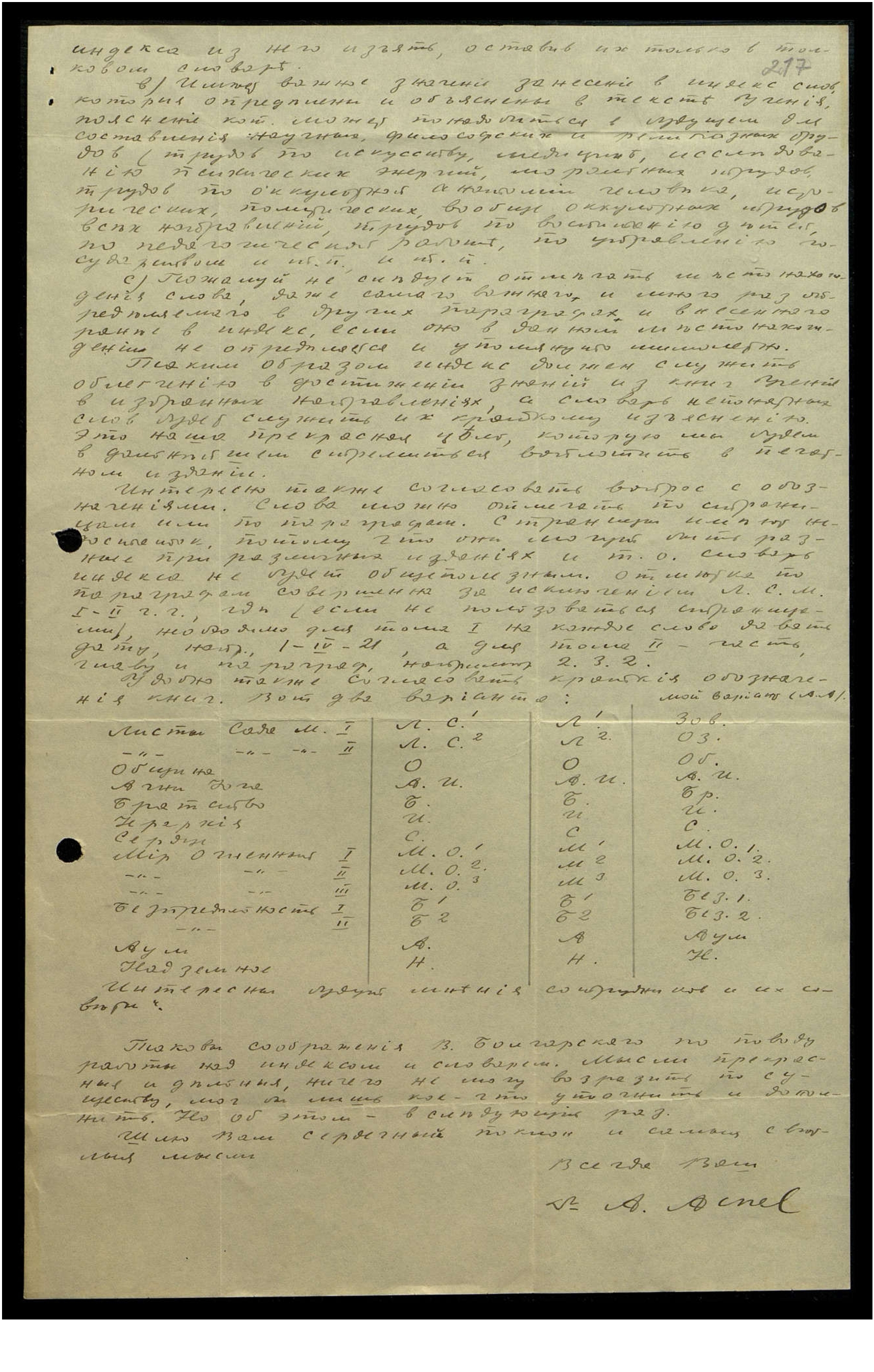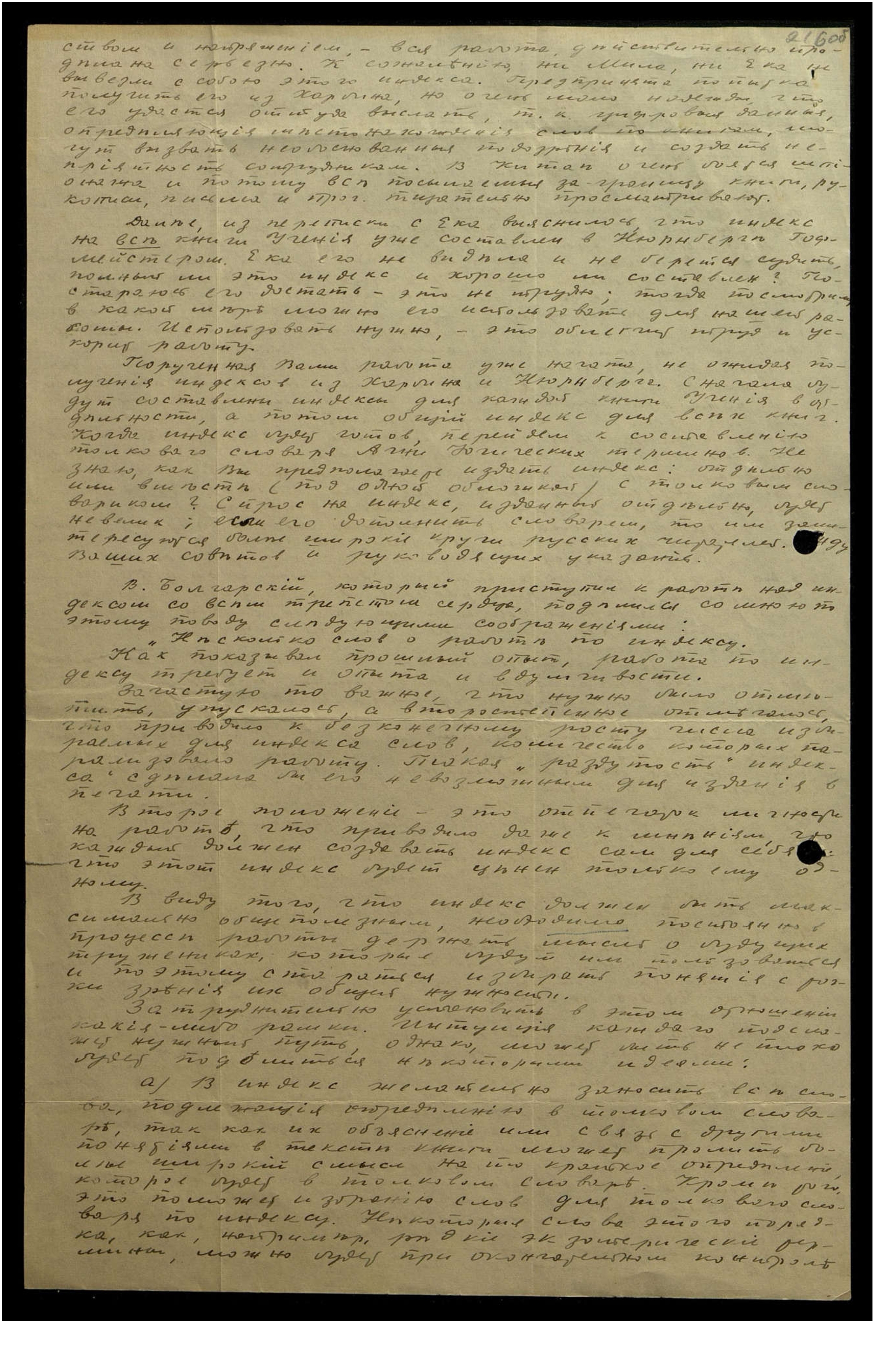 Указанная Вами работа над индексом успешно подвигается вперёд, хоть и не особенно быстро. Всё-таки она идёт уже значительно спористее, чем вначале, и уже вышла из стадии изыскания лучших путей. Конечно, для достижения качества всем сотрудникам придётся пройти взятую на себя книгу по несколько раз. Ждём Ваших руководящих указаний, — при поисках наугад неизбежны ошибки.