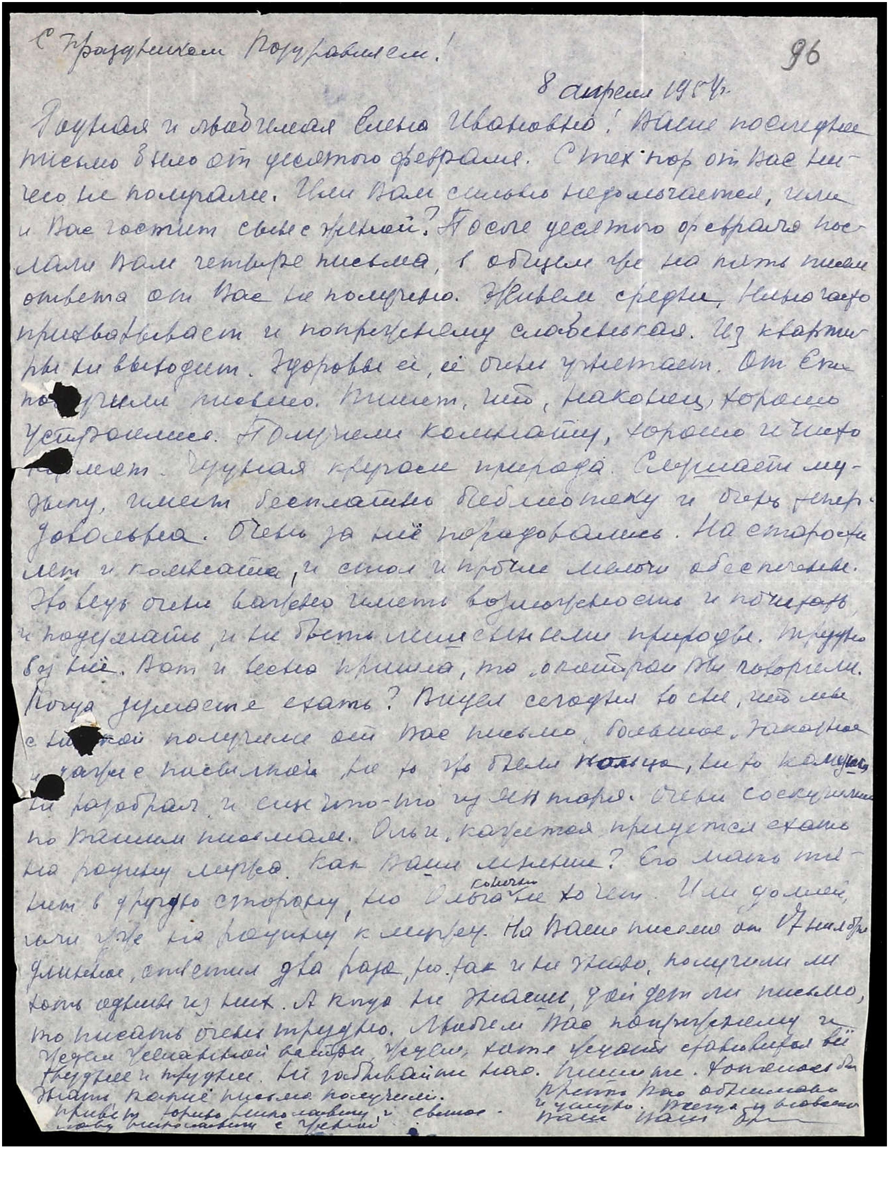 Родная и любимая Елена Ивановна! Ваше последнее письмо было от десятого февраля. С тех пор от Вас ничего не получали. Или Вам сильно недомогается, или у Вас гостит сын с женой? После десятого февраля послали Вам четыре письма, в общем же на пять писем ответа от Вас не получено. Живем средне, Нина часто прихварывает и по-прежнему слабенькая. Из квартиры не выходит. Здоровье её её очень угнетает. От Еки получили письмо. Пишет, что, наконец, хорошо устроилась. Получили комнату, хорошо и часто кормят. Чудная кругом природа. Слушает музыку, имеет бесплатно библиотеку и очень теперь довольна. Очень за неё порадовались. На старости лет и комната, и стол, и прочие мелочи обеспечены. Это ведь очень важно иметь возможность и почитать, и подумать, и не быть лишенными природы. Трудно без неё. Вот и весна пришла, та, о которой Вы говорили. Когда думаете ехать? Видел сегодня во сне, что мы с Нинкой получили от Вас письмо, большое, заказное и даже с посылкой, не то это были кольца, не то камушки, не разобрал, и еще что-то из янтаря. Очень соскучились по Вашим письмам. Ольге, кажется, придется ехать на родину мужа. Как Ваше мнение? Его мать тянет в другую сторону, но Ольга, конечно, не хочет. Или домой, или уже на родину к мужу. На Ваше письмо от 17 ноября, длинное, ответил два раза, но так и не знаю, получили ли хоть один из них. А когда не знаешь, дойдет ли письмо, то писать очень трудно. Любим Вас по-прежнему, ждем желанной встречи, ждем, хотя ждать становится всё труднее и труднее. Не забывайте нас. Пишите. Хотелось бы знать, какие письма получили. Привет Юрию Николаевичу и Святославу Николаевичу с женой. Крепко Вас обнимаю и целую. Всегда и навсегда Ваш,