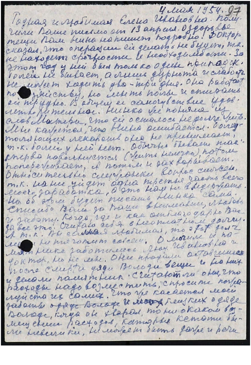 Родная и любимая Елена Ивановна! Получили Ваше письмо от 13 апреля. О здоровье тещи Вам Нина напишет подробно. Доктор сказал, что операции ей делать не будет, т.к. не находит срочности и необходимости. За этот год у ней был только один припадок. Болей не бывает, а лишь дурнота и слабость. Не может ходить два-три дня. Она работает по хозяйству, но мыть полы и стирать ей трудно. В общем ее самочувствие удовлетворительное. Нинка же поняла из слов Матери, что ей осталось недолго жить. Мне кажется, что Нина ошибается. Болеутоляющих лекарств она не принимает, т.к. болей у ней нет. Обычно бывает так: сперва поволнуется (жить нелегко), потом попереживает, а потом и захварывает. Относительно служанки вопрос сложен, т.к. на нее уйдет одна третья часть всего моего заработка, а это нам не выдержать. Но об этом будет писать Нинка сама. Спасибо Вам за Ваше внимание, любовь и заботу. Когда, где и как отблагодарю Вас за все это? Считаю себя в неоплатном долгу. А так как Вы самая любимая, то этот долг меня не тяготит совсем. О могиле и памятнике заботилась Людмила Ивановна и доктор, но не мы. Они продали оставшиеся после смерти дяди Володи вещи и на них и делали памятник. Считают ли они, что расходы надо возместить, спросите пожалуйста их самих. Что же касается моей заботы и моих близких о дяде Володе, когда он хворал, то ни о каком возмещении расходов, которые кстати были невелики, не может быть даже и речи.