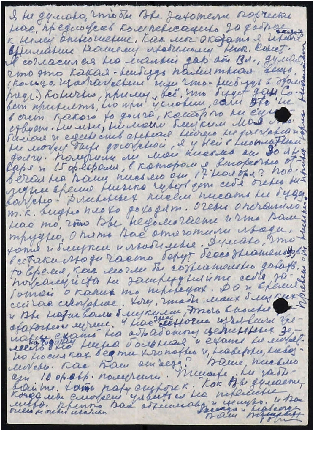 Я не думаю, чтобы Вы захотели огорчить нас, предложив компенсацию за доброе к нему отношение. Как мог оказать я иначе внимание нашему любимому Ник[олаю] Конст[антиновичу]. Я согласился на малый дар от Вл[адыки], думая, что это какая-нибудь памятная вещь (кольцо, изображение или что-нибудь в этом роде). Конечно, приму всё, что будет дан Совет принять, но при условии, если это не в счет какого-то долга, которого не существует. Ни мне, ни моим близким Моя Любимая и единственная ничего не должна и не может быть должной, я у Ней в неоплатном долгу. Получили ли мои письма от 30 января и 15 февраля, в котором я вторично отвечал на Ваше письмо от 17 ноября? Последнее время Нинка чувствует себя очень неважно. Длинных писем писать не буду, т.к. видно плохо доходят. Очень опечалило нас то, что Вы недомогаете и что Вам трудно. Опять Вас отяготили люди, хотя и близкие, и любимые. Думаю, что всё-таки люди часто берут бессознательно, в то время, как могли бы сознательно давать. Пожалуйста не затрудняйте себя заботой о каких-то переводах. Да и время сейчас сложное. Хочу, чтобы моих близких и Вы называли близкими, этого вполне достаточно и лучше. У нас здесь многие изъявили желание ехать на обработку целинных земель на Родину, но Нина больная и ехать не может. На носилках везти хлопотно и, наверно, невозможно. Как Ваш отъезд? Ваше письмо от 10 февраля получили. Пишите. Не забывайте. Хоть пару строчек. Как Вы думаете, когда мы сможем уявиться на перемене места. Крепко Вас обнимаю и целую. И Вас очень и очень люблю. Всегда и навсегда Ваш,