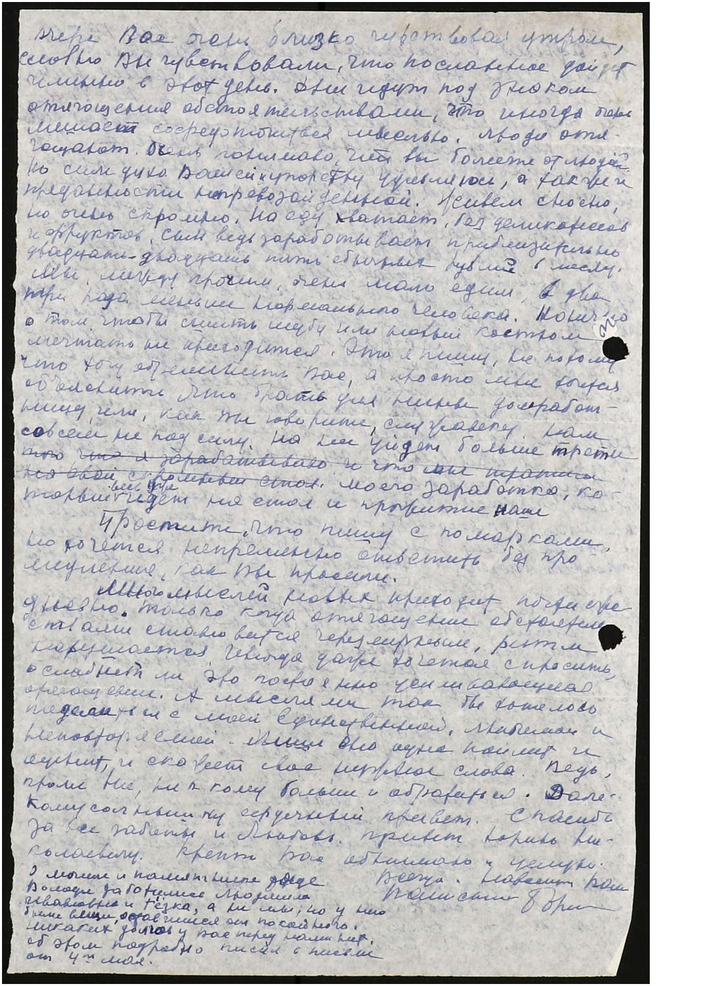 Вчера Вас очень близко чувствовал утром, словно Вы чувствовали, что посланное дойдет именно в этот день. Дни идут под знаком отягощения обстоятельствами, что иногда очень мешает сосредоточиться мыслью. Люди отягощают. Очень понимаю, что вы болеете от людей. Но силе духа Вашей и упорству удивляюсь, а также и преданности непревзойденной. Живем сносно, но очень скромно. На еду хватает, без деликатесов и фруктов, сын ведь зарабатывает приблизительно двадцать-двадцать пять обычных рублей в месяц. Мы, между прочим, очень мало едим, в два три раза меньше нормального человека. Конечно о том, чтобы сшить шубу или новый костюм, мечтать не приходится. Это я пишу, не потому что хочу обременить Вас, а просто мне хочется объяснить, что брать для Нины домработницу, или, как Вы говорите, служанку, нам совсем не под силу. На неё уйдет больше трети [того, что я зарабатываю, и что мы тратим на свой скромный стол] моего заработка, который весь уже идет на стол и прожитие наше.