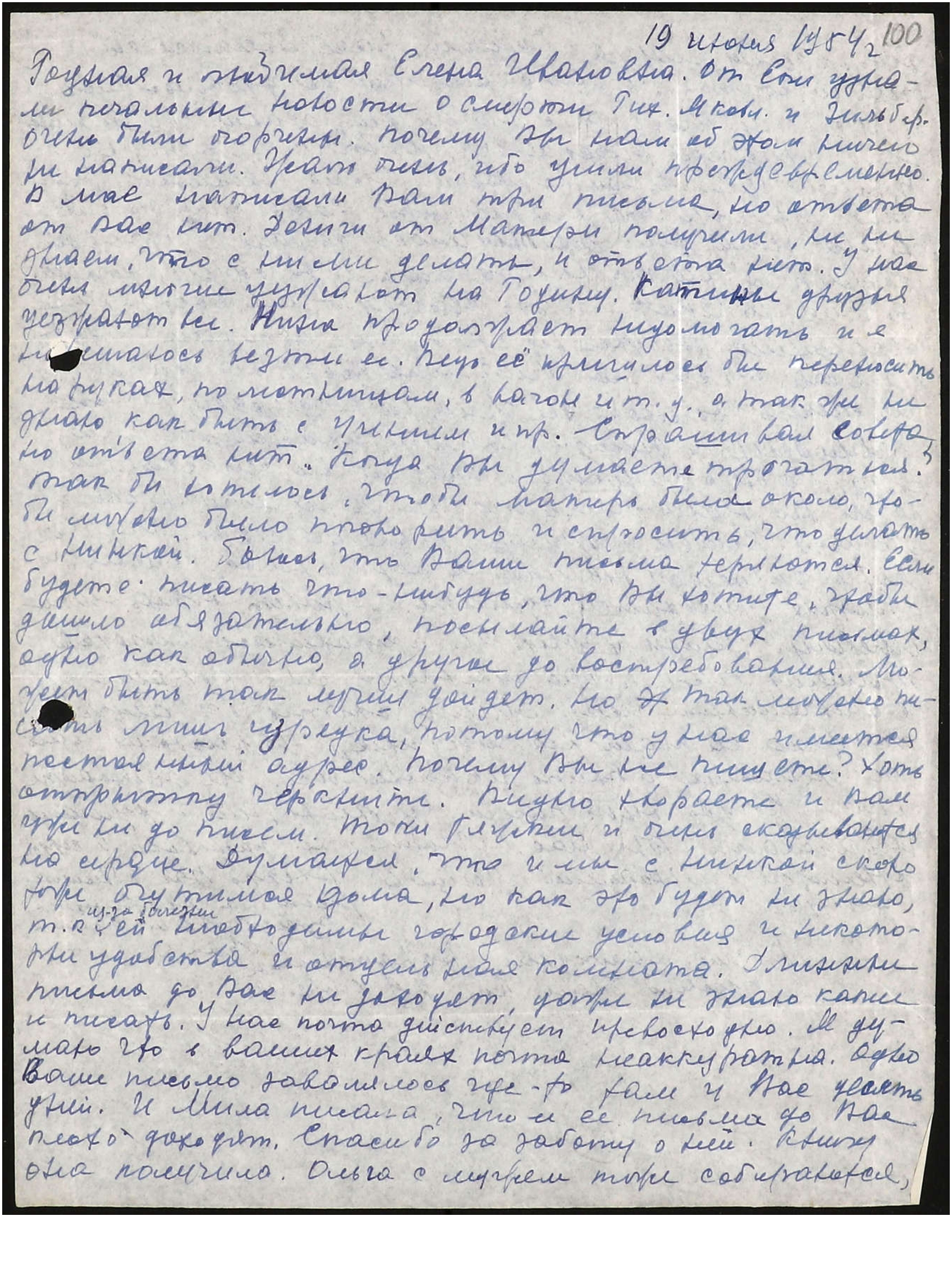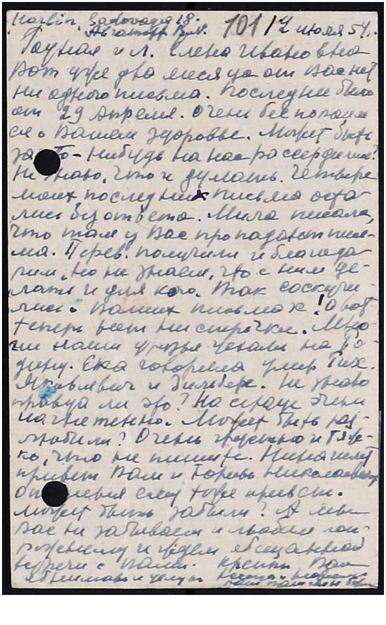Родная и любимая Елена Ивановна. От Еки узнали печальные новости о смерти Рихарда Яковлевича* и Зильберсдорфа**. Очень были огорчены. Почему Вы нам об этом ничего не написали. Жаль очень, ибо ушли преждевременно. В мае написали Вам три письма, но ответа от Вас нет. Деньги от Матери получили, но не знаем, что с ними делать, и ответа нет. У нас очень многие уезжают на Родину. Катины друзья уезжают все. Нина продолжает недомогать и я не решаюсь везти её. Ведь её пришлось бы переносить на руках, по лестницам, в вагон и т.д., а так же не знаю, как быть с Учением и пр. Спрашивал Совета, но ответа нет. Когда Вы думаете трогаться? Так бы хотелось, чтобы Матерь была около, чтобы можно было поговорить и спросить, что делать с Нинкой. Боюсь, что Ваши письма теряются. Если будете писать что-нибудь, что Вы хотите, чтобы дошло обязательно, посылайте в двух письмах, одно как обычно, а другие до востребования. Может быть так лучше дойдет. Но так можно писать лишь изредка, потому что у нас имеется постоянный адрес. Почему Вы не пишете? Хоть открытку черкните. Видно хвораете и Вам уже не до писем. Токи тяжкие и очень сказываются на сердце. Думается, что и мы с Нинкой скоро уже очутимся дома, но как это будет не знаю, т.к. из-за болезни ей необходимы городские условия и некоторые удобства и отдельная комната. Длинные письма до Вас не доходят, даже и не знаю, какие и писать? У нас почта действует превосходно. Я думаю что в ваших краях почта неаккуратна. Одно Ваше письмо завалялось где-то там у Вас десять дней. И Мила писала, что её письма до Вас плохо доходят. Спасибо за заботу о ней. Книгу она получила. Ольга с мужем тоже собираются,