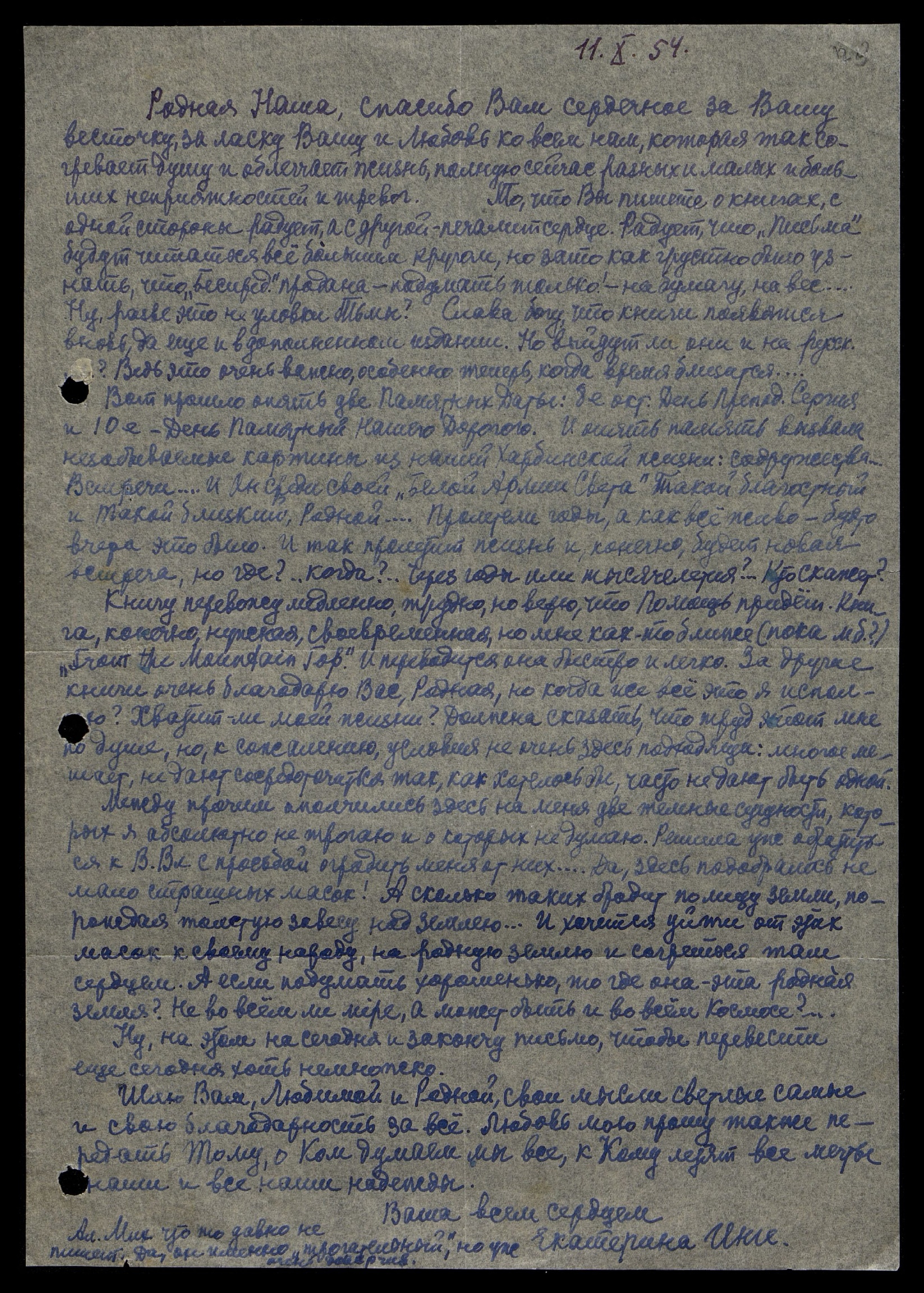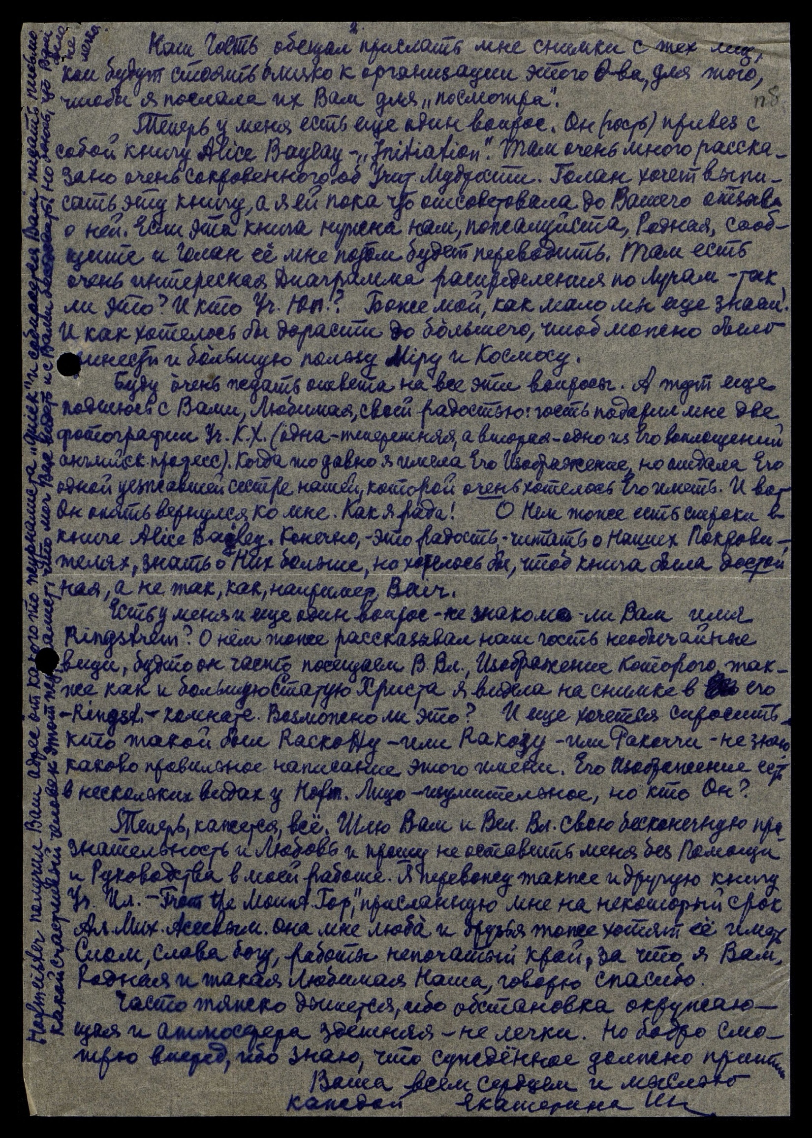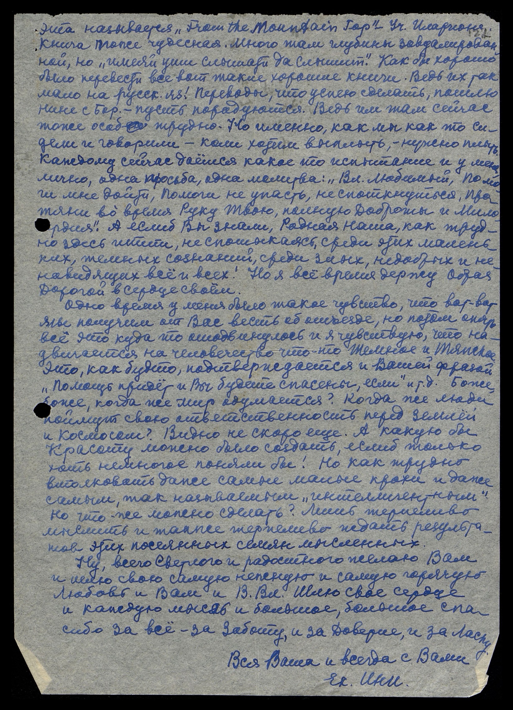 Теперь, кажется, всё. Шлю Вам и Вел[икому] Вл[адыке] свою бесконечную признательность и Любовь и прошу не оставить меня без Помощи и Руководства в моей работе. Я перевожу также и другую книгу Учителя Иллариона "From the Mountain Top", присланную мне на некоторый срок Александром Михайловичем Асеевым. Она мне люба и друзья тоже хотят её иметь. Слом, слава богу, работы непочатый край. За что я Вам, Родная и такая Любимая Наша, говорю спасибо.