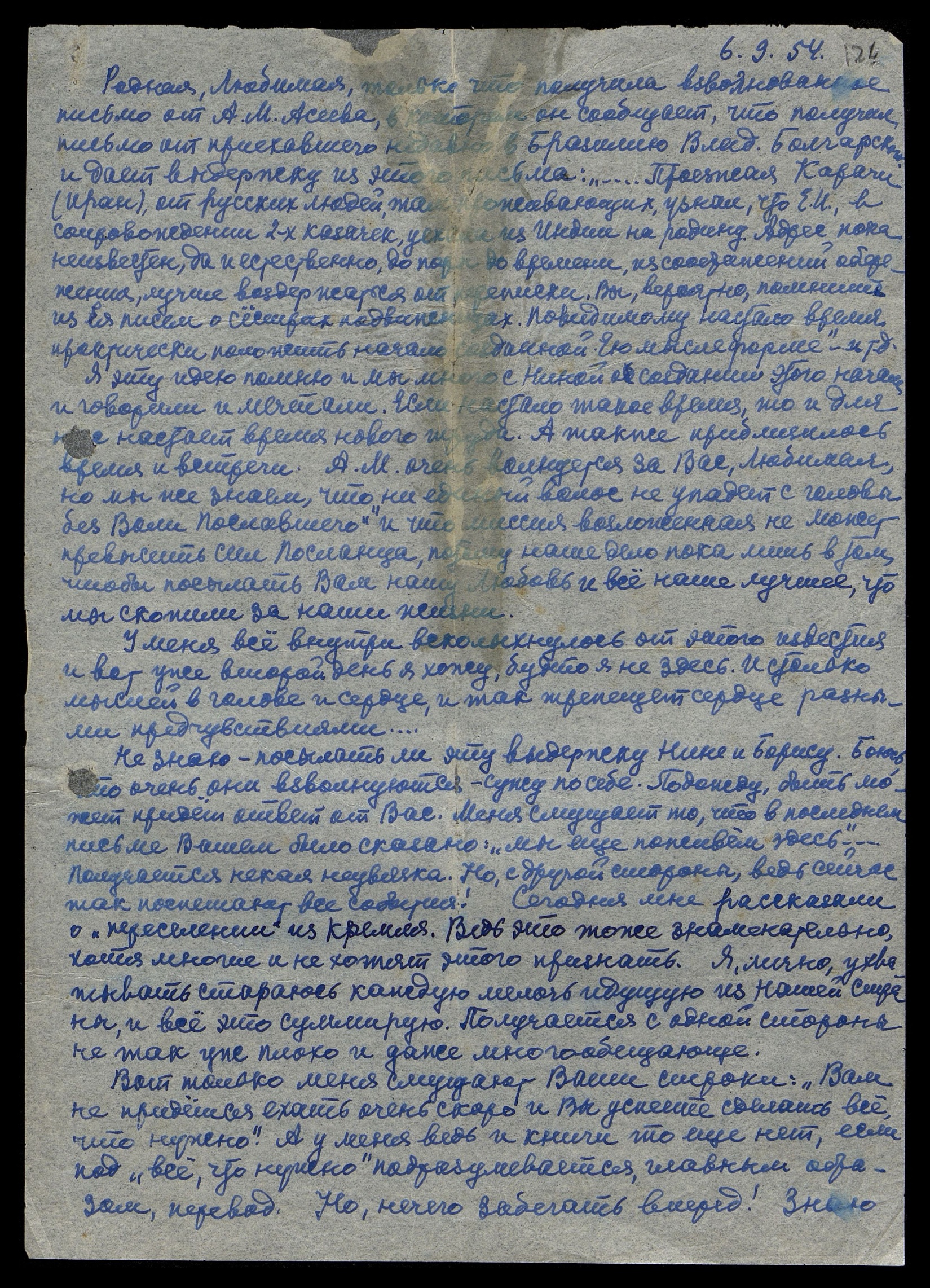 Родная, Любимая, только что получила взволнованное письмо от А.М. Асеева, в котором он сообщает, что получил письмо от приехавшего недавно в Бразилию Влад. Болгарского и дает выдержку из этого письма: "Проезжая Карачи (Иран), от русских людей, там проживающих, узнал, что Е.И. в сопровождении 2-х казачек, уехала из Индии на родину. Адрес пока неизвестен, да и естественно, до поры до времени, из соображений обережения, лучше воздержаться от переписки. Вы, вероятно, помните из её писем о сёстрах подвижницах. По-видимому настало время практически положить начало созданной Ею мыслеформе", - и так далее.