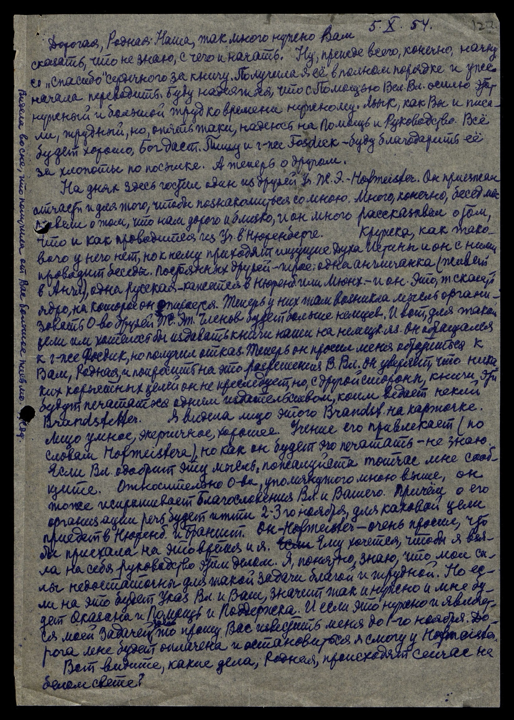На днях здесь гостил один из друзей Учения Живой Этики - Hofmeister**. Он приезжал отчасти и для того, чтобы познакомиться со мною. Много, конечно, бесед мы провели о том, что нам дорого и близко, и он много рассказывал о том, что и как проводится из Учения в Нюрнберге. Кружка, как такового у него нет, но к нему приходят ищущие Духа Истины и он с ними проводит беседы. Постоянных друзей трое: одна англичанка (живет в Англии), одна русская - кажется в Нюрнберге или Мюнхене, и он. Это, скорей ядро, на которое он опирается. Теперь у них там возникла мысль организовать Общество друзей Живой Этики. Членов будет больше немцев. И вот для такой цели им хотелось бы издавать книги наши на немецком языке. Он обращался к г-же Фосдик, но получил отказ. Теперь он просил меня обратиться к Вам, Родная, и попросить на это разрешения В[еликого] Вл[адыки]. Он уверяет, что никаких корыстных целей он не преследует, но, с другой стороны, книги эти будут печататься одним издательством, коим ведает некий Brandstetter. Я видела лицо этого Brandstetter'a на карточке. Лицо умное, энергичное, хорошее. Учение его привлекает (по словам Hofmeistera), но как он будет его печатать - не знаю. Если Вл[адыка] одобрит эту мысль, пожалуйста, тотчас мне сообщите. Относительно Общества, упомянутого мною выше, он тоже испрашивает Благословения Вл[адыки] и Вашего. Причём о его организации речь будет идти 2-3 ноября, для каковой цели приедет в Нюрнберг и Брандштетер***. Он - Hofmeister - очень просил, что бы приехала на это время и я. Ему хочется, чтобы я взяла на себя руководство этим делом. Я, понятно, знаю, что мои силы недостаточны для такой Задачи благой и трудной. Но если на это будет Указ Вл[адыки] и Ваш, значит, так и нужно, и мне будет Оказана и Помощь, и Поддержка. И если это нужно и является моей Задачей, то прошу Вас известить меня до 1-го ноября. Дорога мне будет оплачена и остановиться я смогу у Hofmeistera.