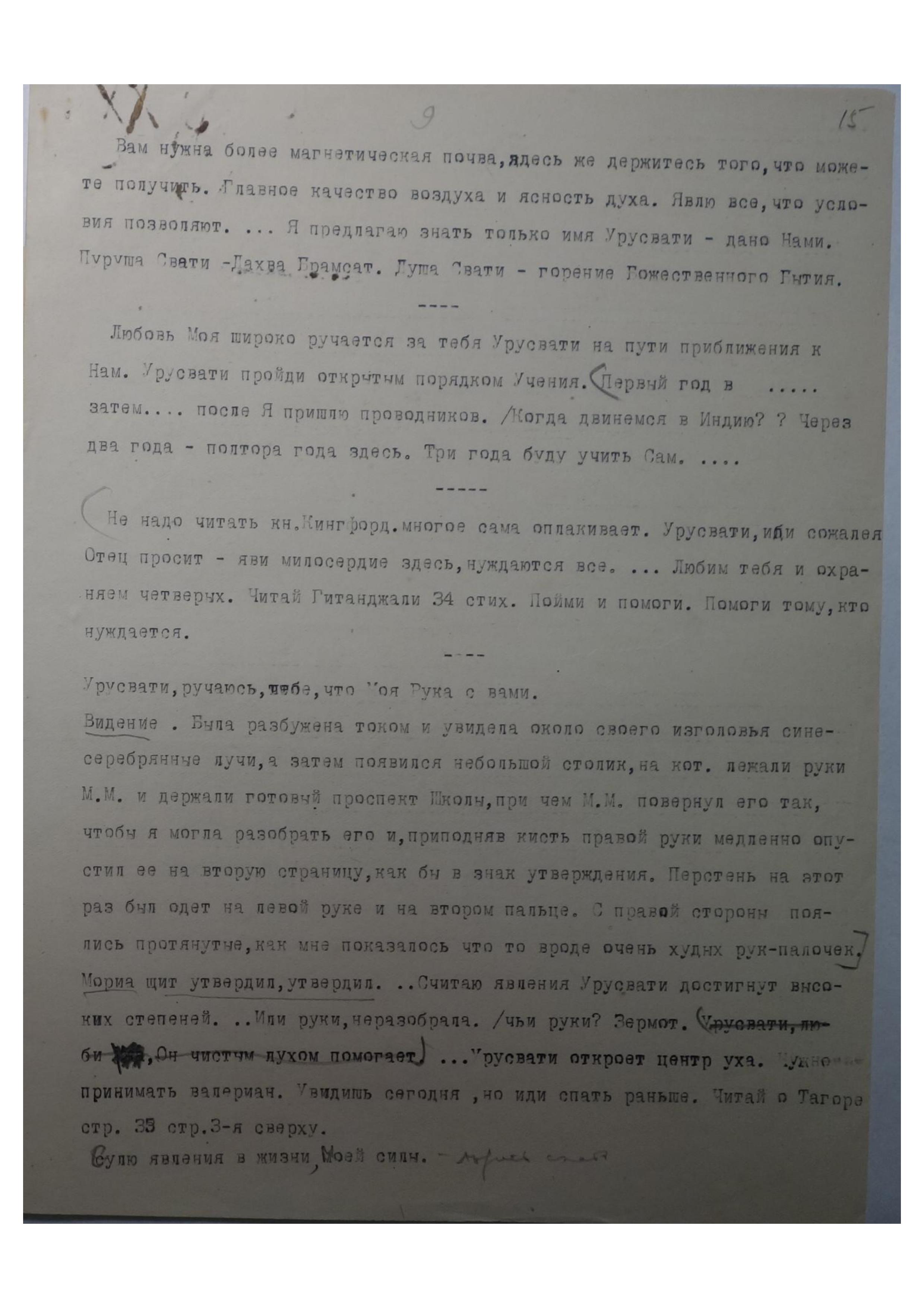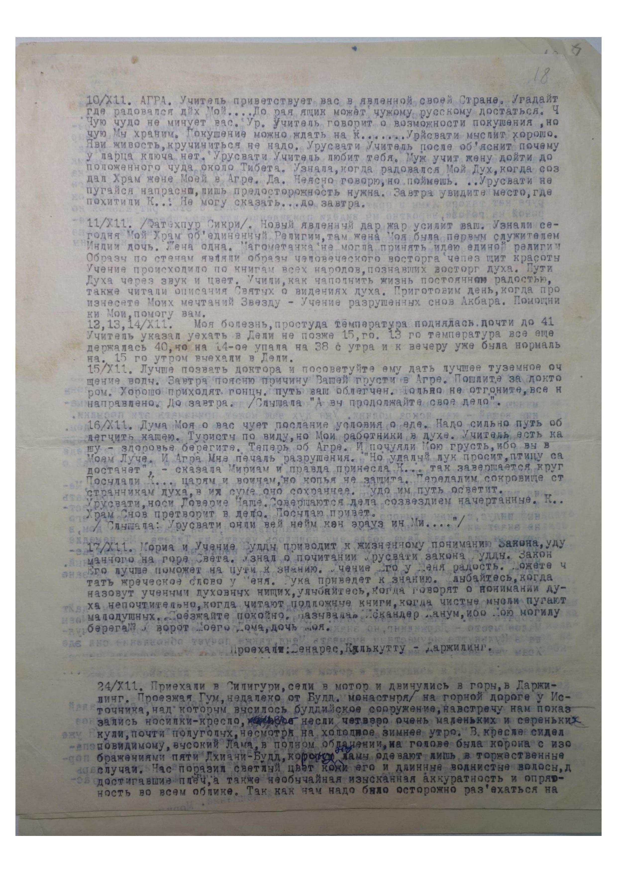 10/XII. АГРА. Учитель приветствует вас в явленной своей Стране. Угадайте, где радовался дух Мой.... До рая ящик может чужому русскому достаться. Чую, чудо не минует вас. Урусвати, Учитель говорит о возможности покушения, но, чую, Мы Храним. Покушение можно ждать на к[амень]. Урусвати мыслит хорошо. Яви живость, кручиниться не надо. Урусвати, Учитель после объяснит, почему у ларца ключа нет. Урусвати, Учитель любит тебя. Муж учит жену дойти до положенного чуда около Тибета. Узнала, когда радовался Мой Дух, когда создал Храм жене Моей в Агре. Да. Неясно говорю, но поймешь. Урусвати не пугайся напрасно, лишь предосторожность нужна. Завтра увидите место, где похитили К[амень]. Не могу сказать... до завтра.