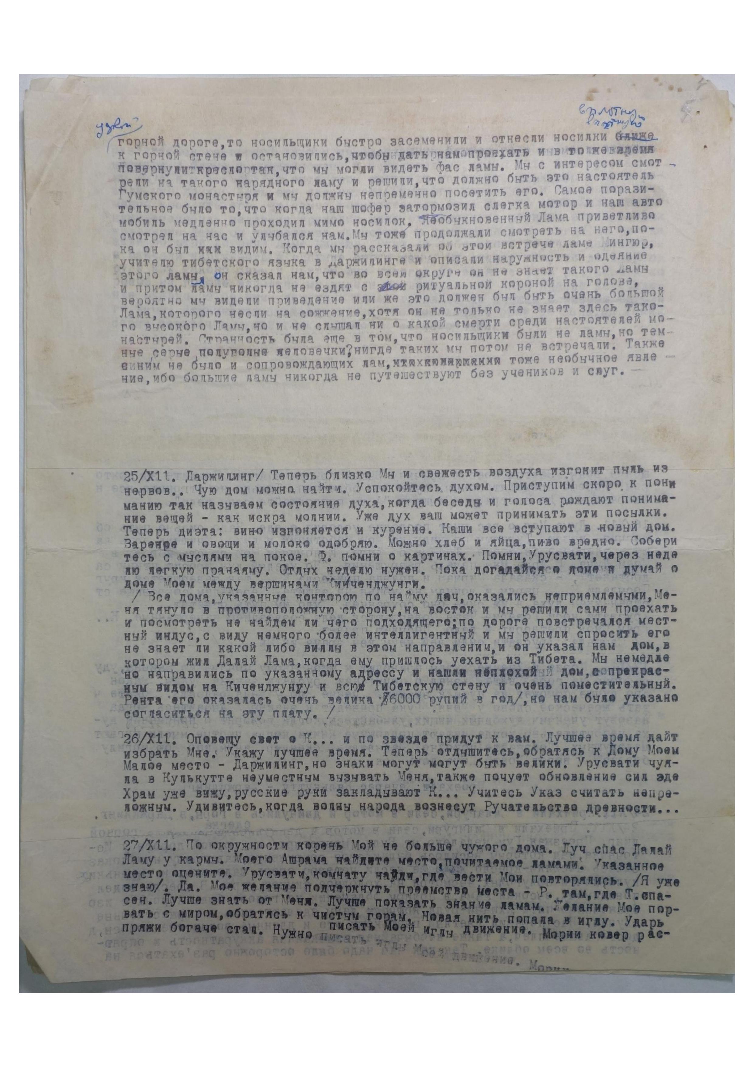 24/XII. Приехали в Силигури, сели в мотор и двинулись в горы, в Даржилинг. Проезжая Гум, недалеко от Будд[истского] монастыря на горной дороге у Источника, над которым высилось буддийское сооружение, навстречу нам показались носилки-кресло. Его несли четверо очень маленьких и сереньких кули, почти полуголых, несмотря на холодное зимнее утро. В кресле сидел, по-видимому, высокий Лама, в полном облачении, на голове была корона с изображениями пяти Дхиани-Будд, корону эту ламы надевают лишь в торжественные случаи. Нас поразил светлый цвет кожи его и длинные волнистые волосы, достигавшие плеч, а также необычайная изысканная аккуратность и опрятность во всем облике. Так как нам надо было осторожно разъехаться на