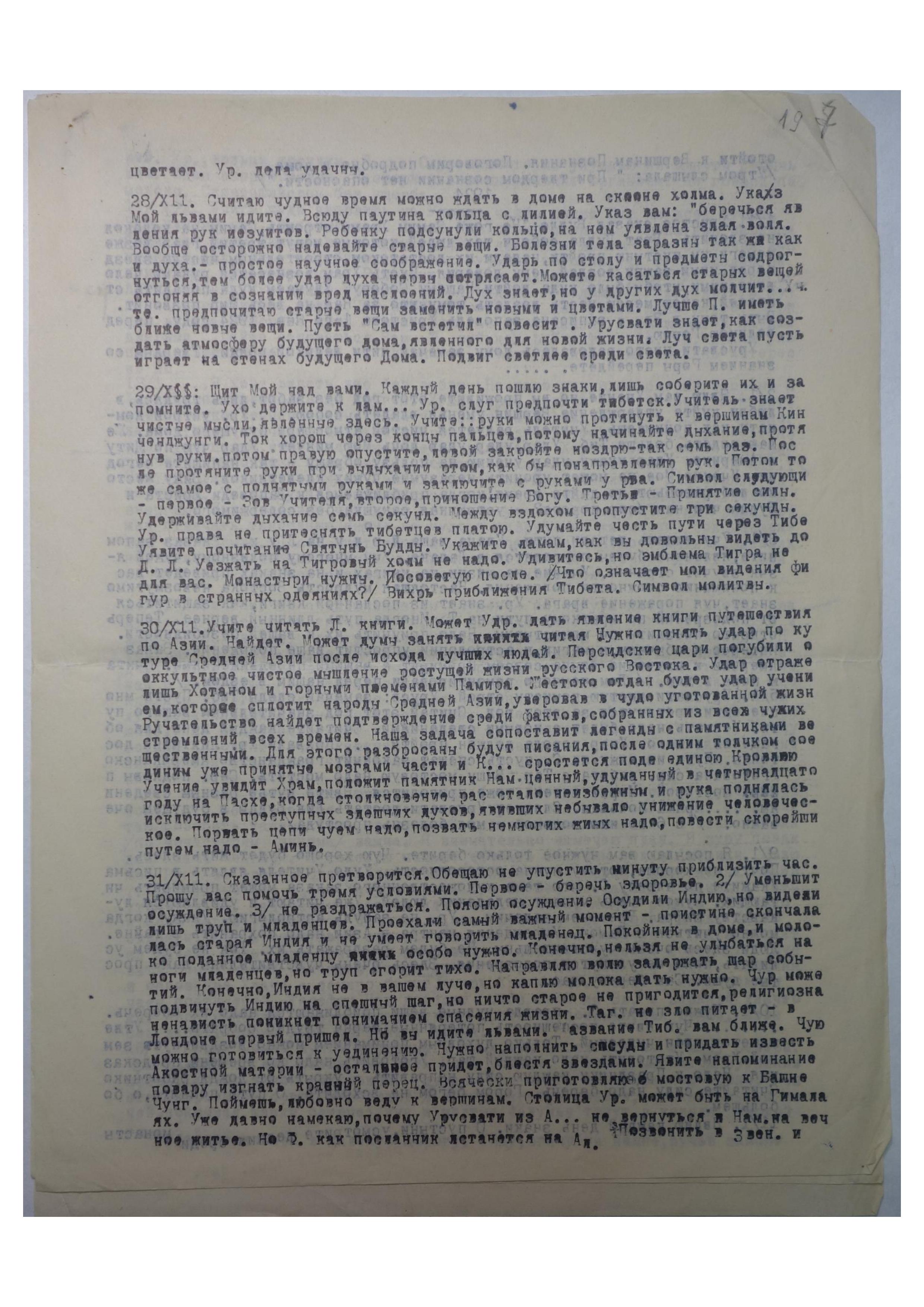28/ХI. Я ищу для вас явления. Утверждаю закон вашего сочетания с Нами. Удар Моего Меча — вам его. Мудро в Европе домогаться будут ваши враги, узнаете в Калькутте. Чую, как Гуру поносят русские. Урусвати, гору духа мудро яви. Урусвати Учитель посылает мудрость родной мыслями. Урусвати, Луч Мой лучше кучи Щитов защитит вас. Учитель хочет скорее послать нужного человека.