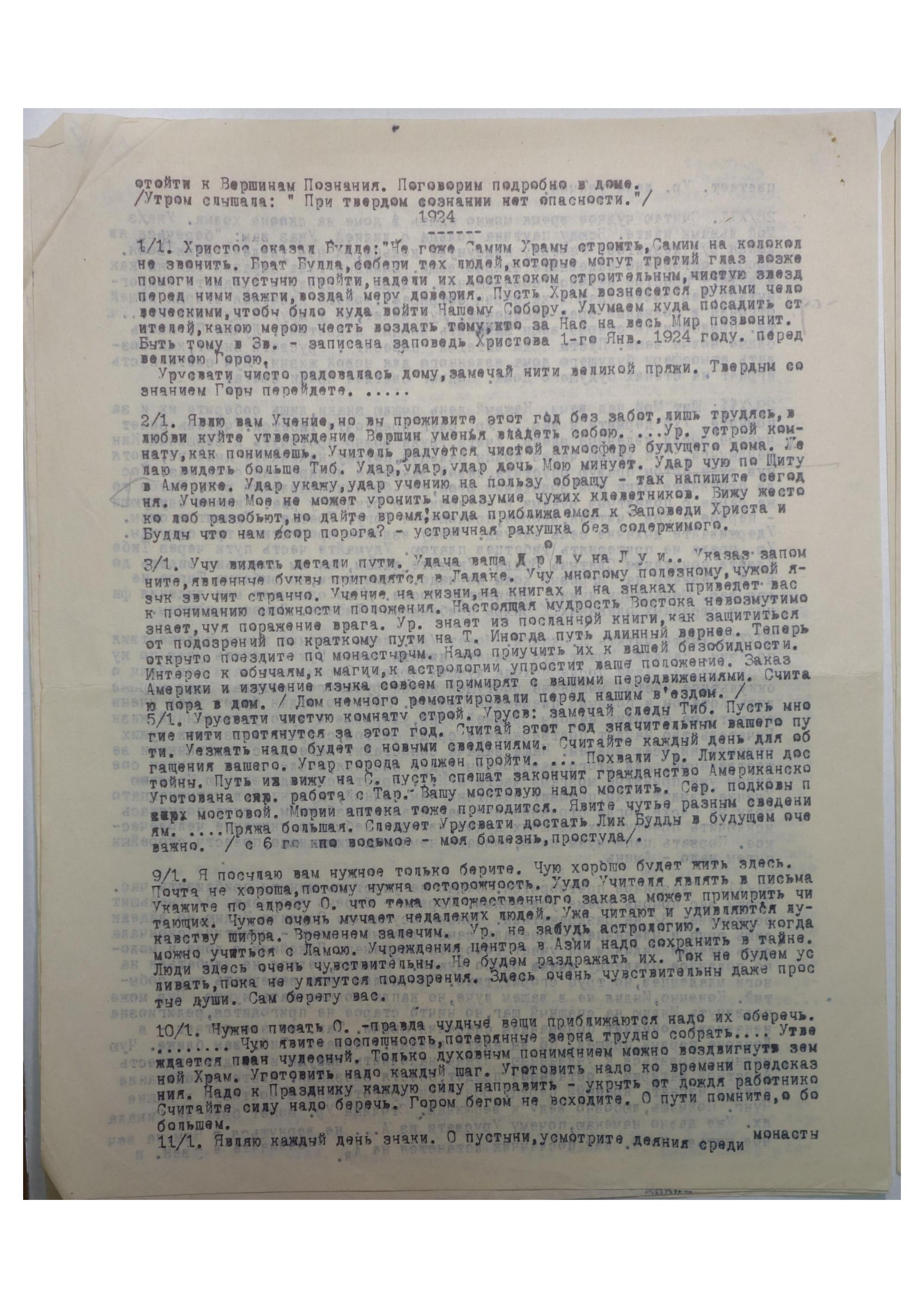 1/1. Христос сказал Будде: «Негоже Самим Храмы строить, Самим на колокольне звонить. Брат Будда, собери тех людей, которые могут третий глаз возжечь, помоги им пустыню пройти, надели их достатком строительным, чистую звезду перед ними зажги, воздай меру доверия. Пусть Храм вознесется руками человеческими, чтобы было куда войти Нашему Собору. Удумаем, куда посадить строителей, какою мерою честь воздать тому, кто за Нас на весь Мир позвонит. Быть тому в Зв[енигороде]» — записана заповедь Христова 1-го янв[аря] 1924 году, перед великою Горою.