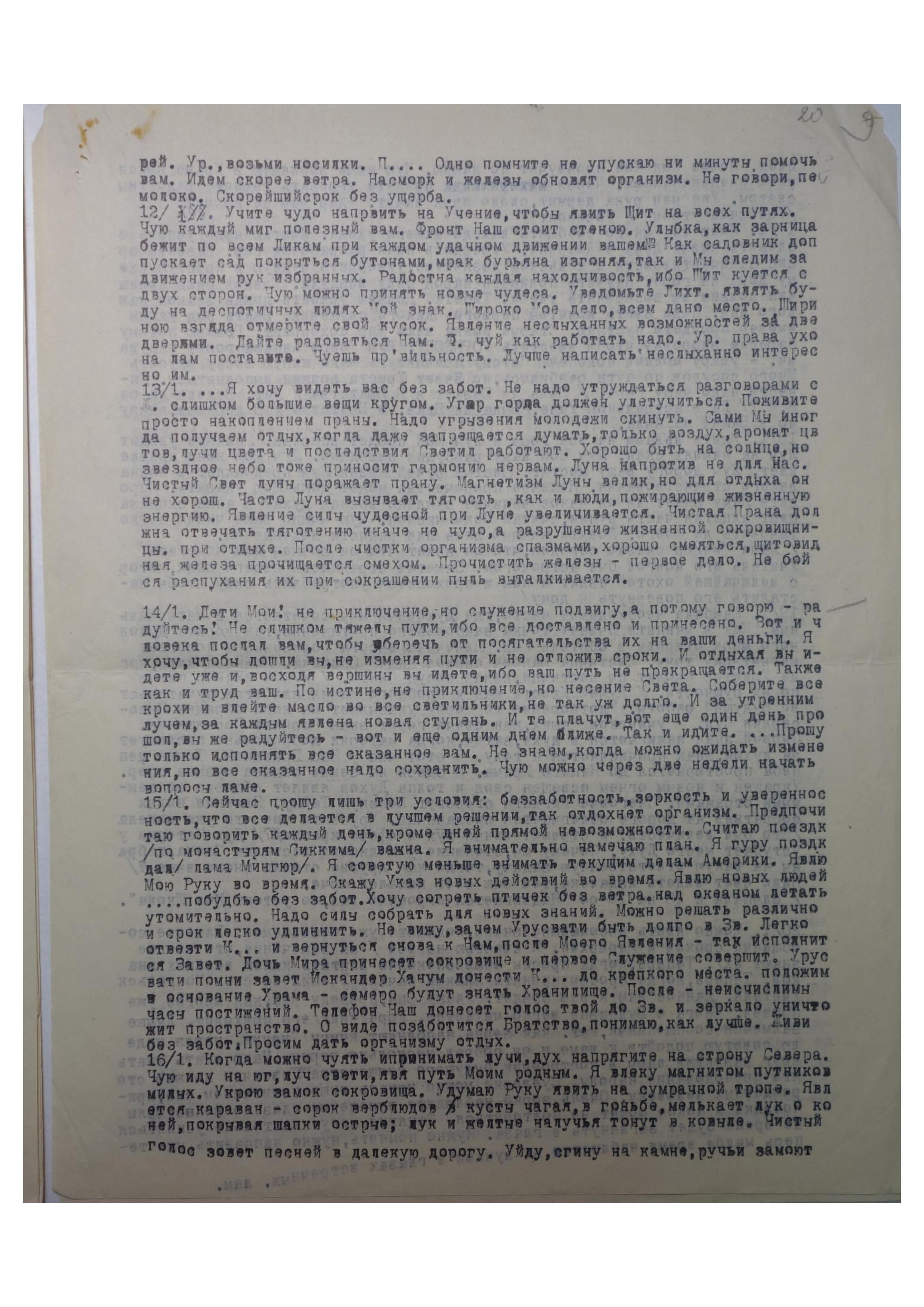 4/ХII. Поистине, вы потрудились и время дать вам отдых. И чистая задача возобновит здоровье ваше, к этому приложу заботу. Указ Мой — продолжить путь в покое духа, даже фонтан рупий не должен волновать. Явите поступь туристов без волнения. Явление близости к[амня] усиливает давление, ибо даже спящий к[амень] показывает магические знаки. Так же как медиум иногда бывает подавляем или восхищаем столом без видимой причины, так же от к[амня] идут лучи, к которым организм должен привыкнуть. Но все-таки надо к[амень] держать при себе. Позабочусь о здоровье. Считайте дорогу до Гор как путь к Храму. Но храните глаза от пыли, ехать пора.