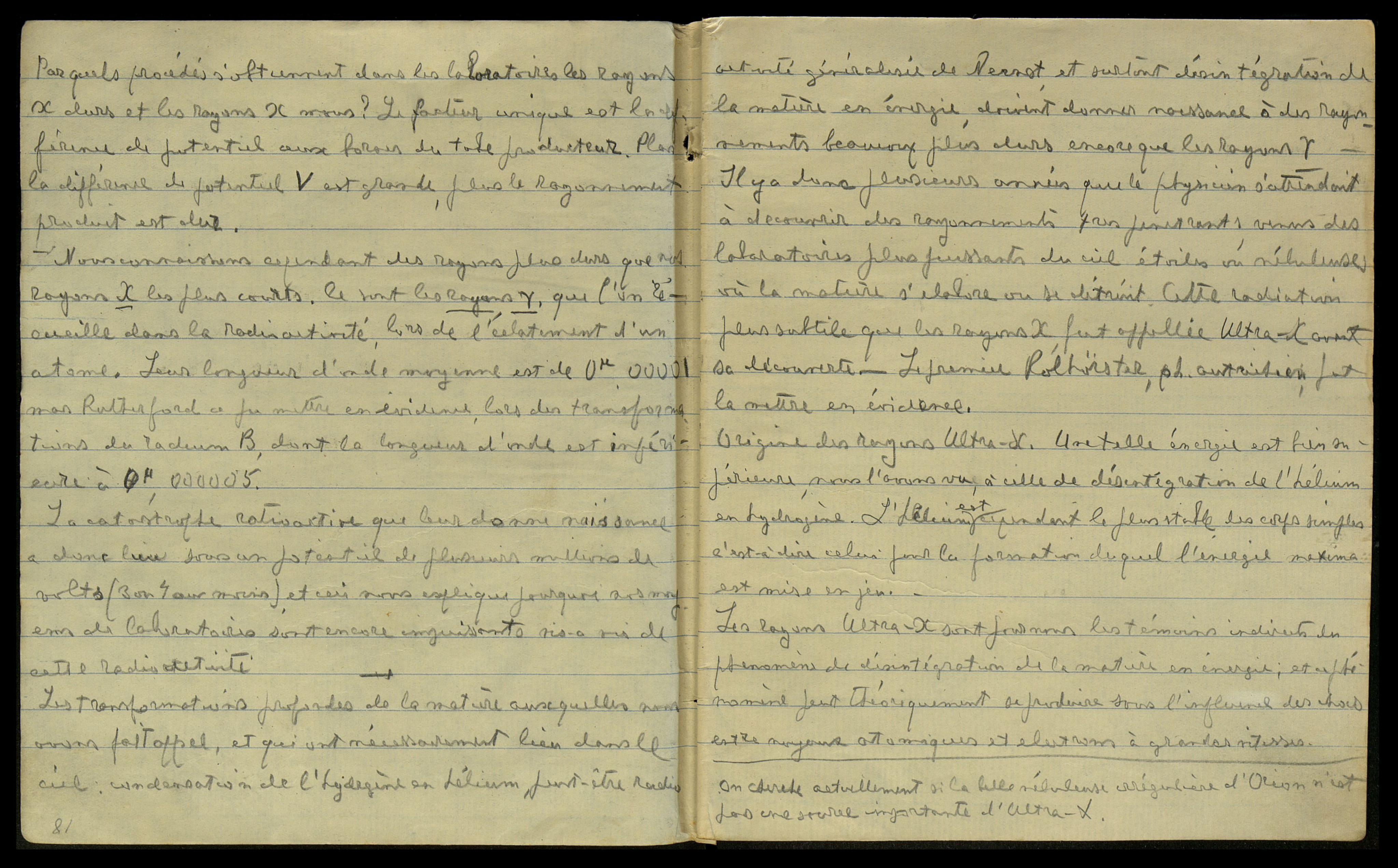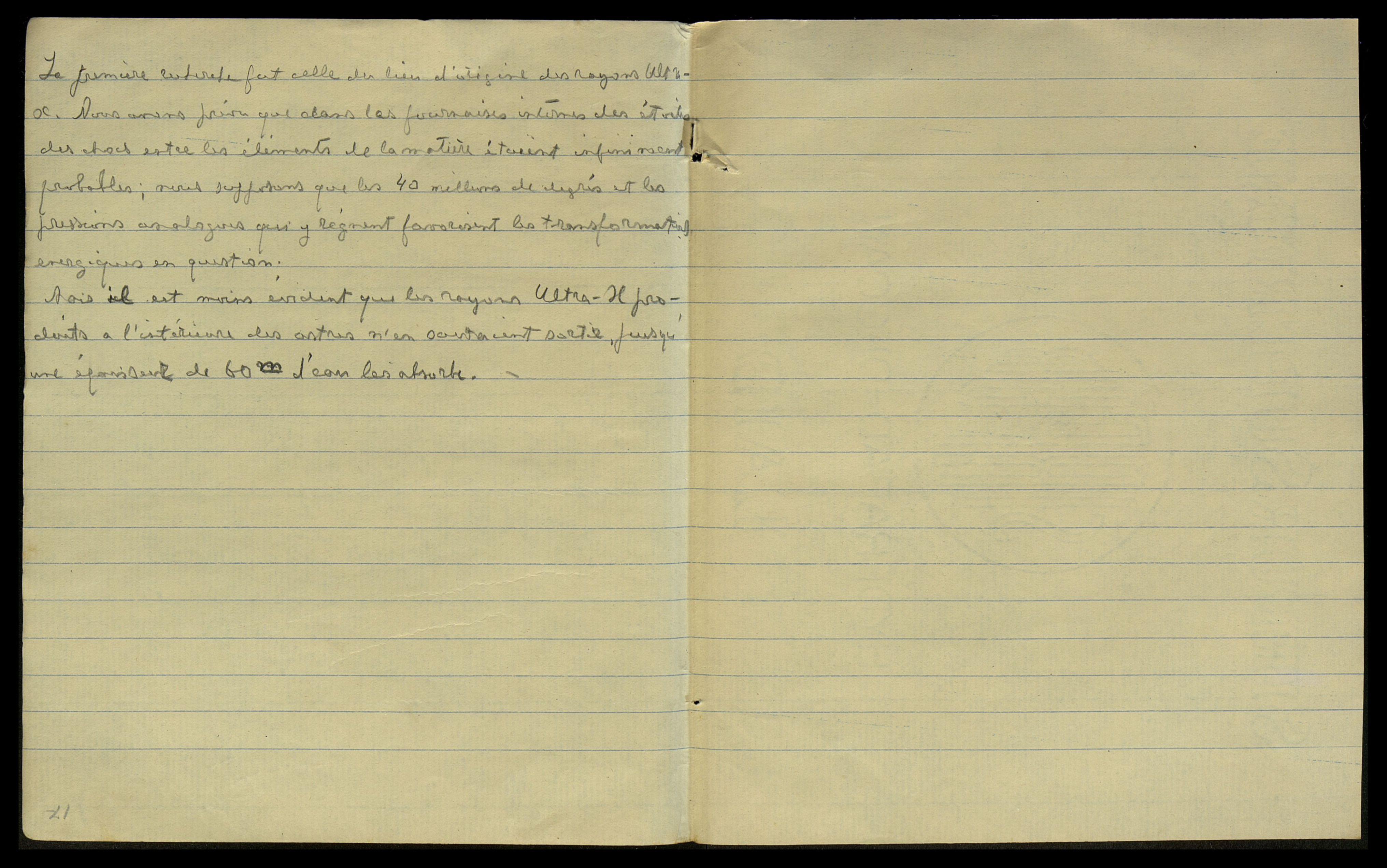 [франц.: Первым [одно слово неразборчиво] было открытие ультра X-лучей. Мы предвидели, что во внутренних горнилах звезд бесконечно вероятны столкновения между элементами материи; мы предполагаем, что 40 миллионов градусов и аналогичное давление, которое преобладает там, благоприятствуют рассматриваемым энергетическим преобразованиям.
