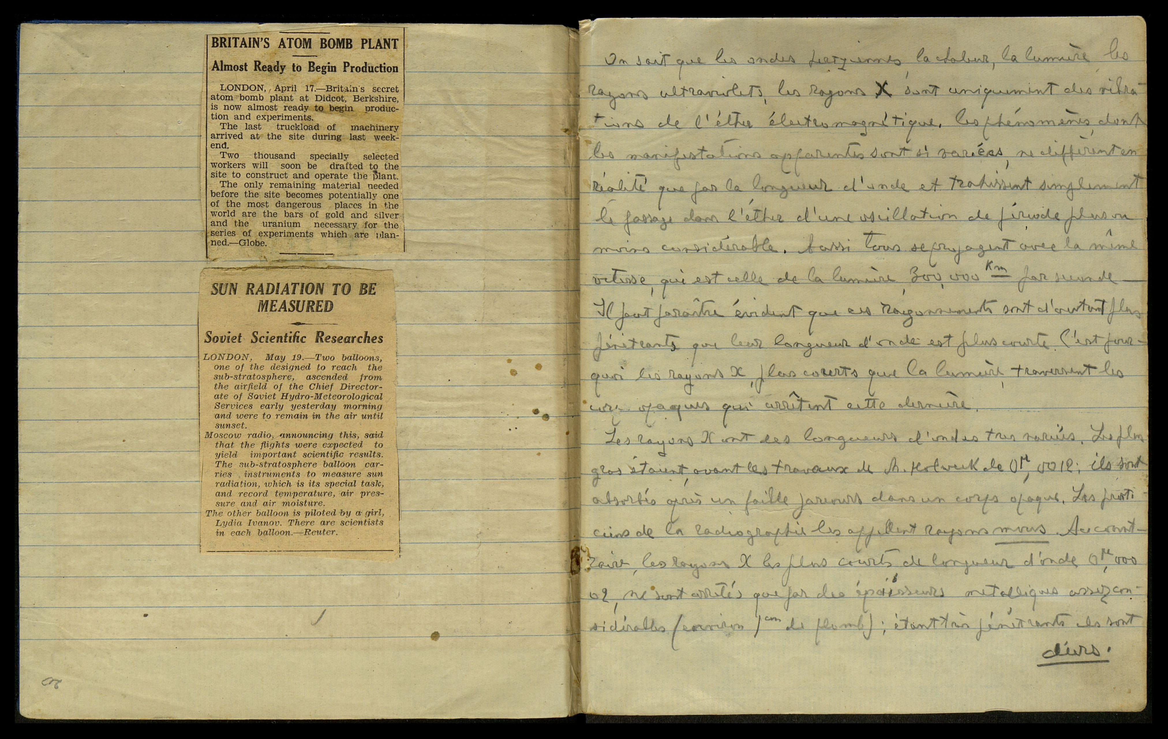 La première [одно слово неразборчиво] fut celle des liens d’origine des rayons Ultra-X. Nous avons prévu que dans les fournaises internes des étoiles des chocs entre les éléments de la matière étaient infiniment probables; nous supposons que les 40 millions de degrés et les pressions analogues qui y règnent favorisent les transformations énergiques en question.