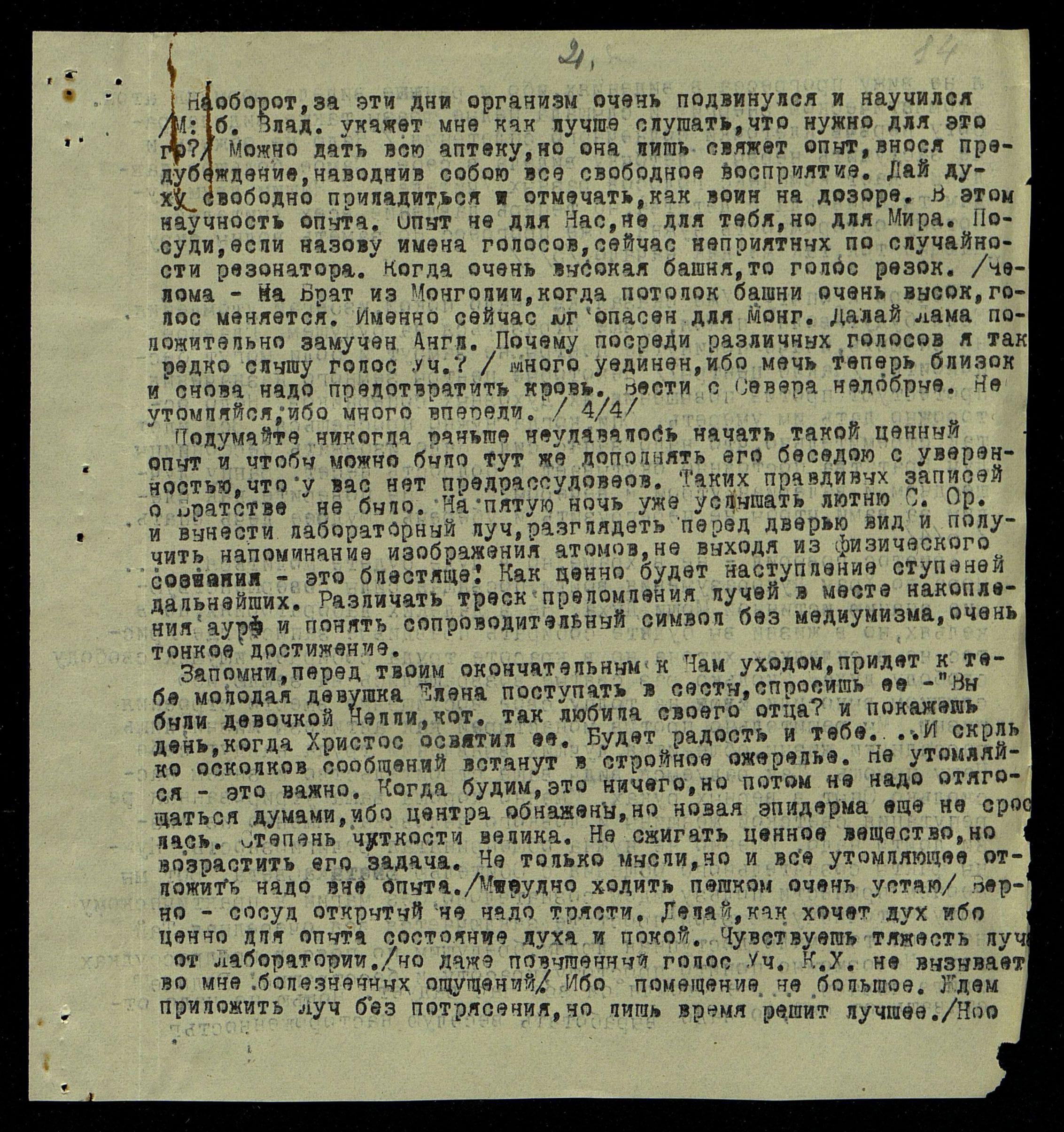 Запомни, перед твоим окончательным к Нам уходом, придёт к тебе молодая девушка Елена поступать в сёстры, спросишь её: "Вы были девочкой Нелли, кот[оторая] так любила своего отца?" − и покажешь день, когда Христос освятил её. Будет радость и тебе. И сколько осколков сообщений встанут в стройное ожерелье. Не утомляйся − это важно. Когда будим, это ничего, но потом не надо отягощаться думами, ибо центра обнажены, но новая эпидерма ещё не срослась. Степень чуткости велика. Не сжигать ценное вещество, но возрастить его − задача. Не только мысли, но и всё утомляющее отложить надо вне Опыта.