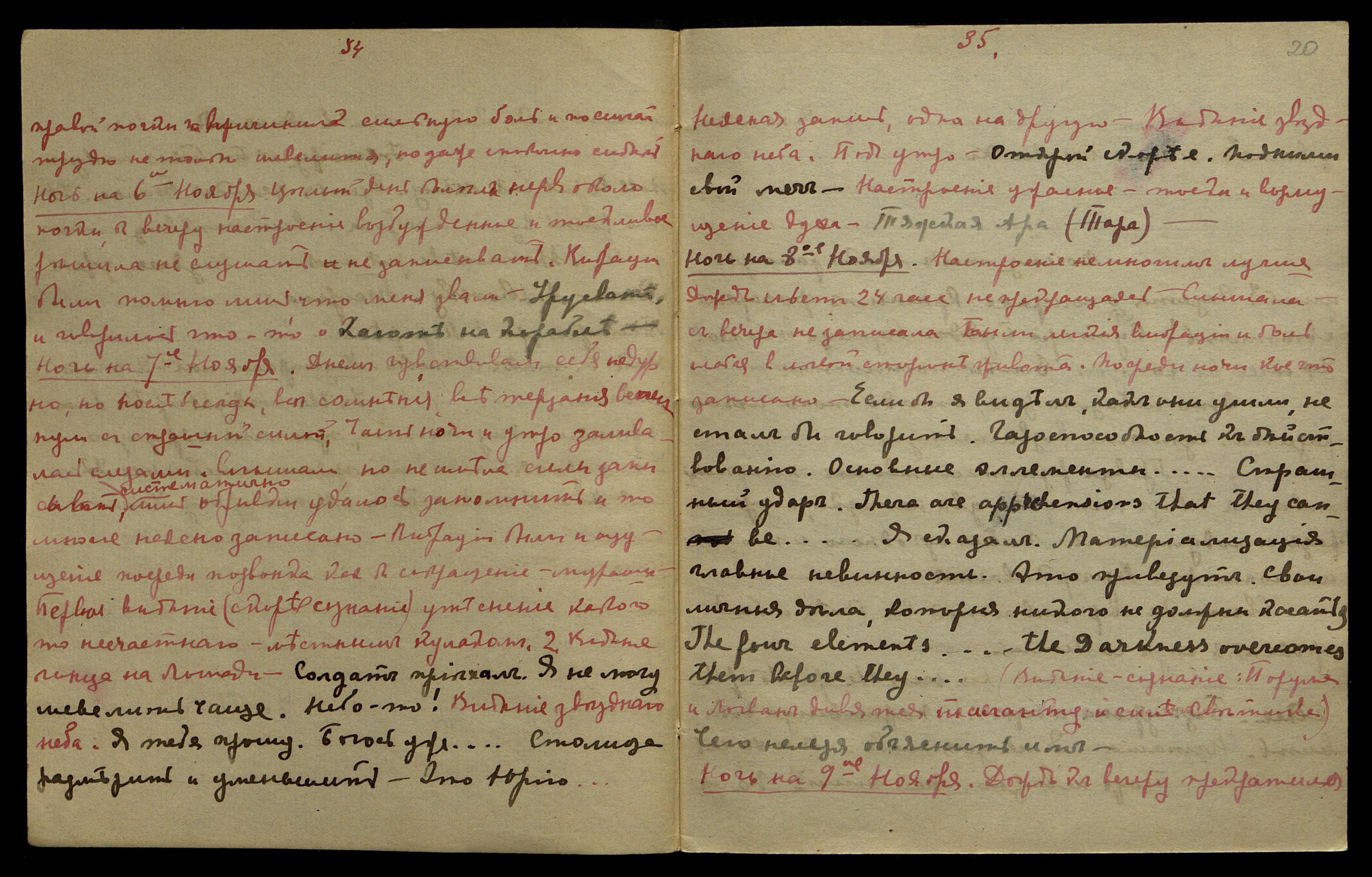 Ночь на 19-ое [ноября]. День ясный, легла рано и по Указанию не вслушивалась, ибо весь день плохо чувствовала себя, боль в желудке и повышенная раздражительность. Всё же слышала и немного видела. Опять огни − сине-серебряный, жёлто-красноватый. Какие-то изображения в красных, зелёных и жёлтых красках (почему-то мне казалось, что это какие-то символы). "The famous road − (Chais) − Чер − Through Gobi. There are seasons [англ.: Знаменитая дорога − (Чаис) − Чер − Через Гоби. Есть времена года] − Сам Я почую − [одно слово неразборчиво]". Спала плохо, проснулась и долго не могла уснуть, неприятный разговор с прислугами. Смутно помню, посреди ночи проснулась от какого-то испуга.