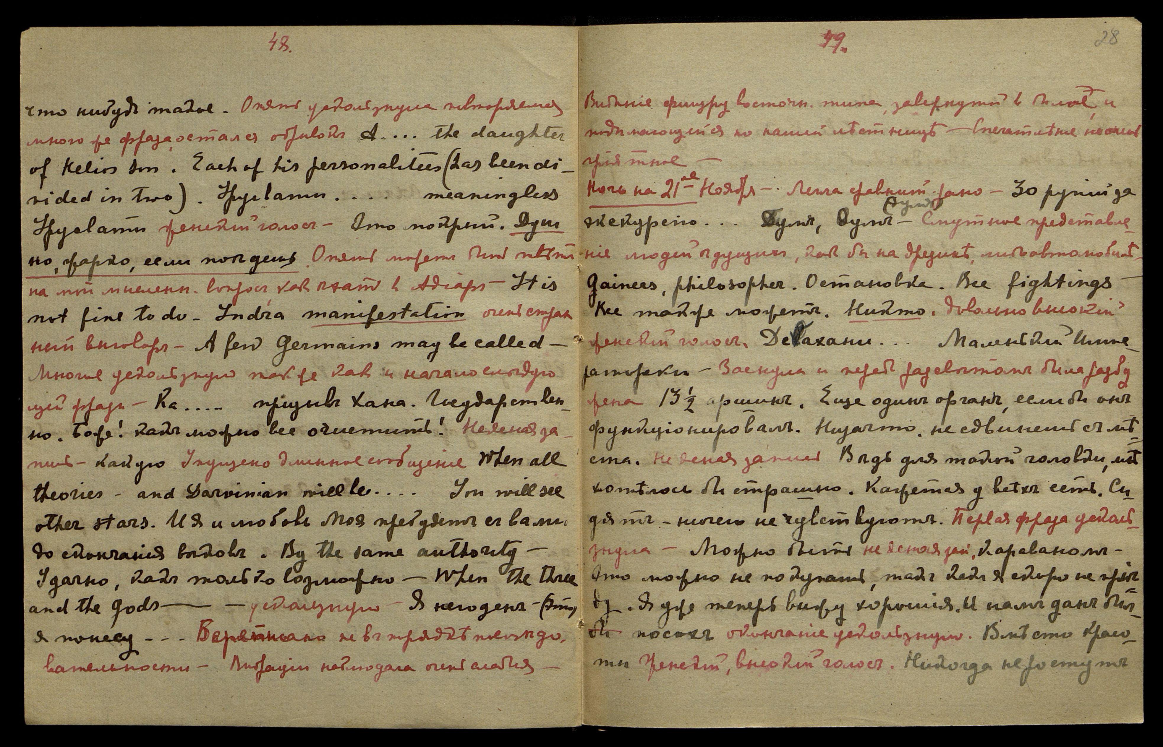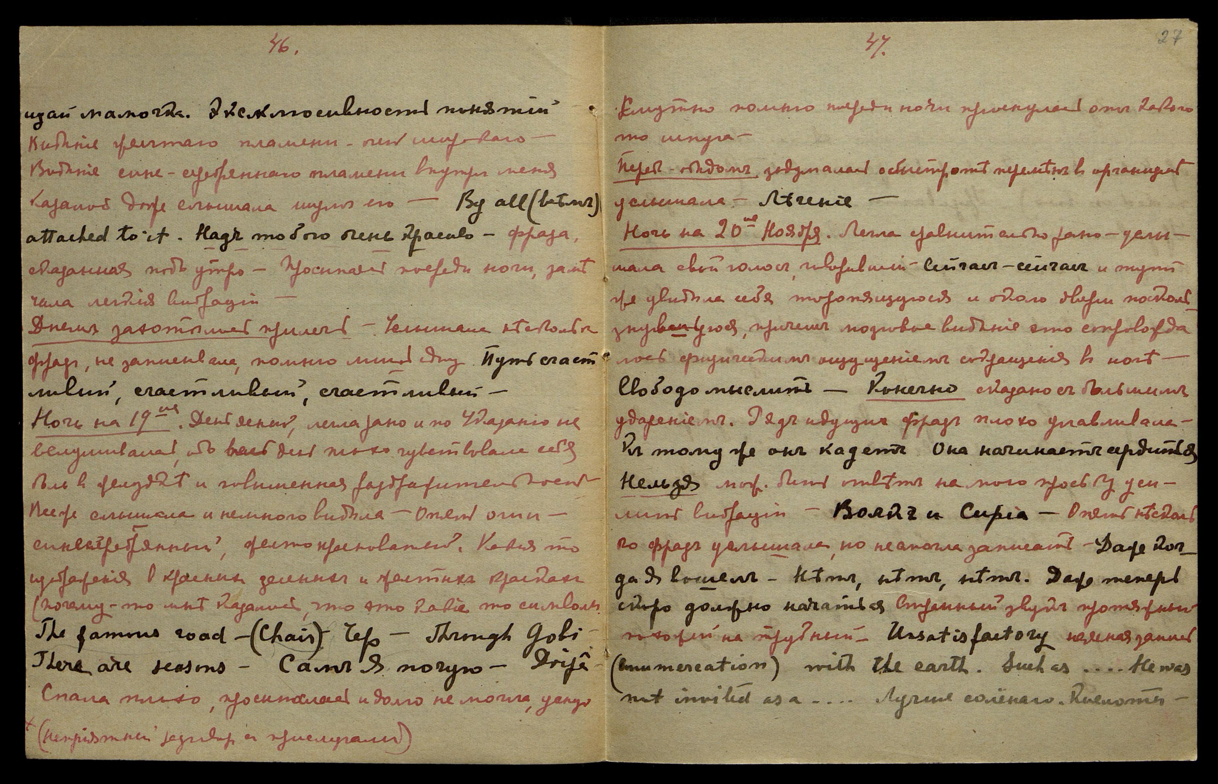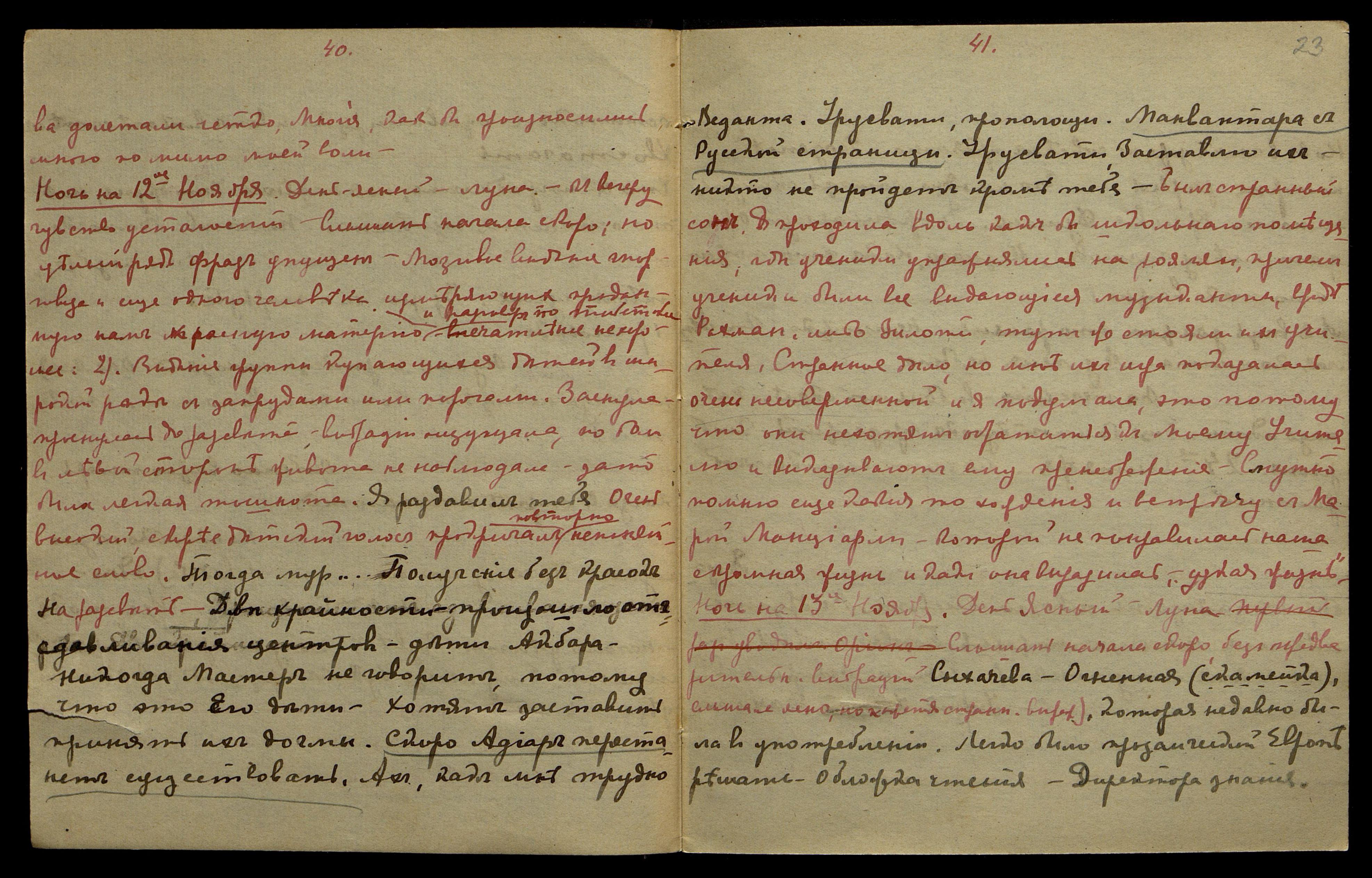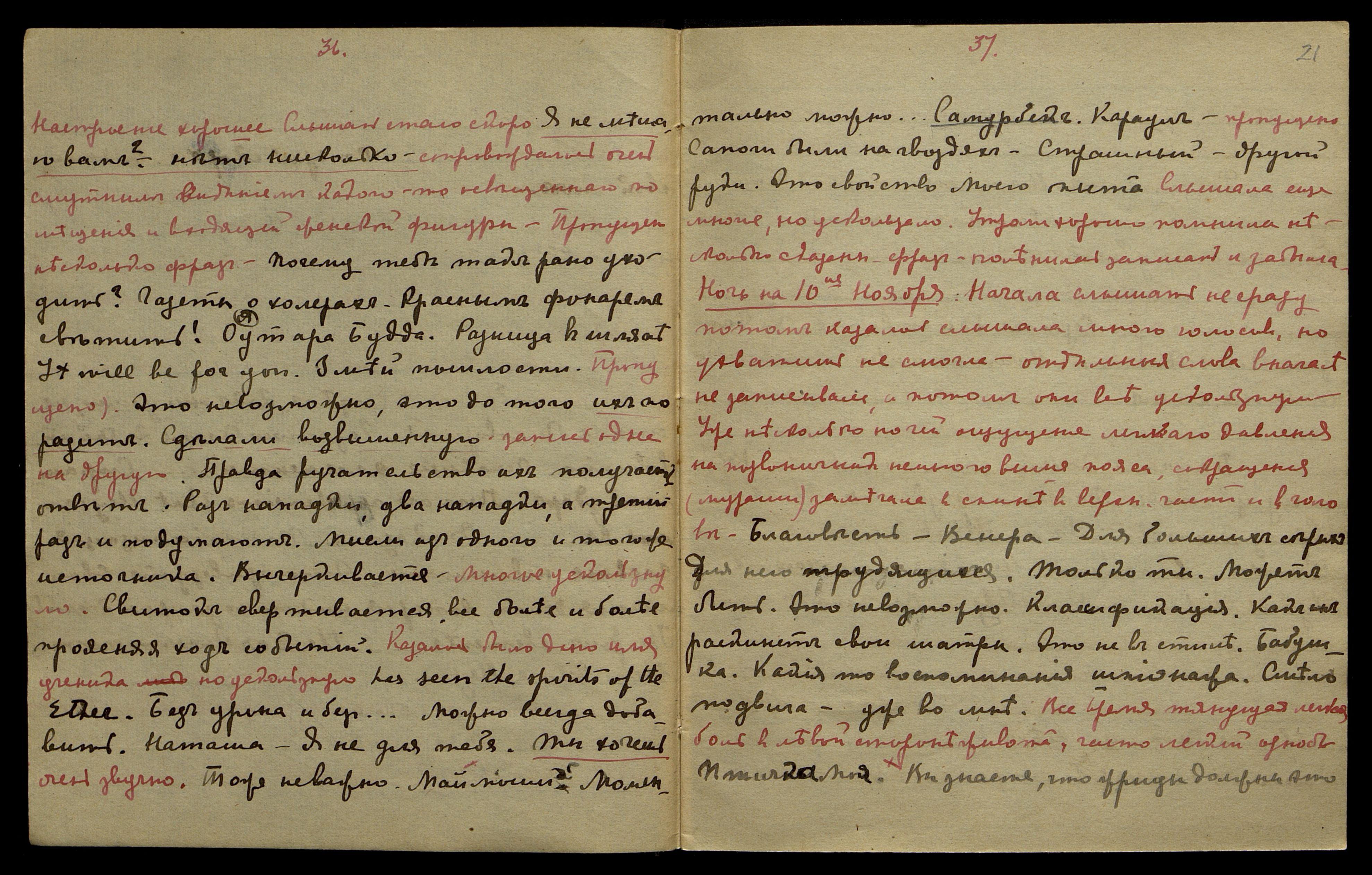 Ночь на 21-ое ноября. Легла сравнительно рано. "30 рупий за экскурсию... Бум, бум, бум". Смутное представление людей, едущих как бы на дрезине либо автомобиле. "Jainers, phylosopher [англ.: Джейнерс, философ]. Остановка. Bce fightings. [англ.: сражения]. Всё также может". "Никто", − довольно высокий женский голос. "Девахани... Маленький Императорский". Заснула и перед рассветом была разбужена. "13 1/2 аршин. Ещё один орган, если бы он функционировал. Ни за что не сдвинешь с места". Неясная запись. "Ведь для такой головки, мне хотелось бы страшно. Кажется, у всех есть. Сидят − ничего не чувствуют". Первая фраза ускользнула. "Можно быть", − неясная зап[ись]. "Караваном. Это можно не покупать. Так как Я скоро не приеду. Я уже теперь вижу хорошие. И нам дан был посох", − окончание ускользнуло. "Вместо красоты", − женский высокий голос. "Никогда не растут