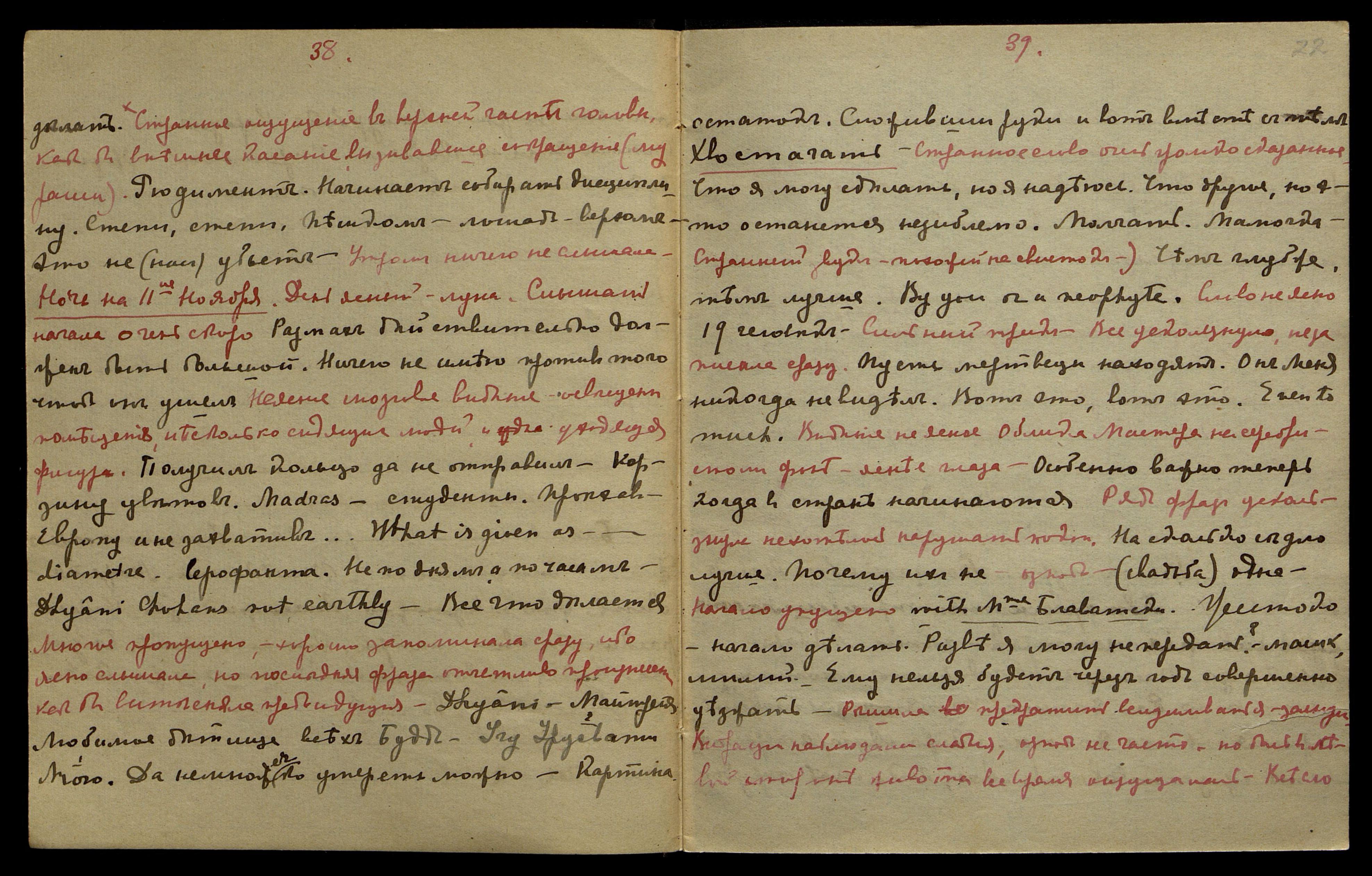 что-нибудь такое". Опять ускользнула повторяемая много же фраза, остался обрывок. "A... the daughter of Helios Sm. Each of his personalities (has been divided in two) [англ.: А... дочь Гелиоса См. Каждая его личность (была разделена на две части)]. Урусвати... meaningless [англ.: бессмысленный]. Урусвати", − женский голос. "Это мокрый. Душно, жарко, если поедешь", − опять, может быть, ответ на мой мысленн[ый] вопрос, как ехать в Адьяр. "It is not fine to do. Indra manifestation [англ.: Это не нормально. Проявление Индры]", − очень странный выговор. "A few Germains may be called [англ.: Можно назвать несколько Жерменов]".Многое ускользнуло так же как и начало следующей фразы: "Ка... призыв Хана. Государственно. Боже! Как можно всё очистить!" Неясная запись. "Какую, − упущено длинное сообщение. "When all theories − and Darvinian will be... You will see other stars [англ.: Когда все теории − и дарвинизм будет... Увидишь другие звёзды]. И Я, и любовь Моя пребудет с вами до скончания веков. By the same authority [англ.: Тем же авторитетом]. Удачно, как только возможно. When the three and the Gods [англ.: Когда трое и боги]", − ускользнуло, − Я не годен. (Это) Я понесу..." Вероятно, не в порядке последовательности. Вибрации наблюдала очень слабые. Видение фигуры восточн[ого] типа, завернутой в белое и подымающейся по нашей лестнице. Впечатление не очень приятное.