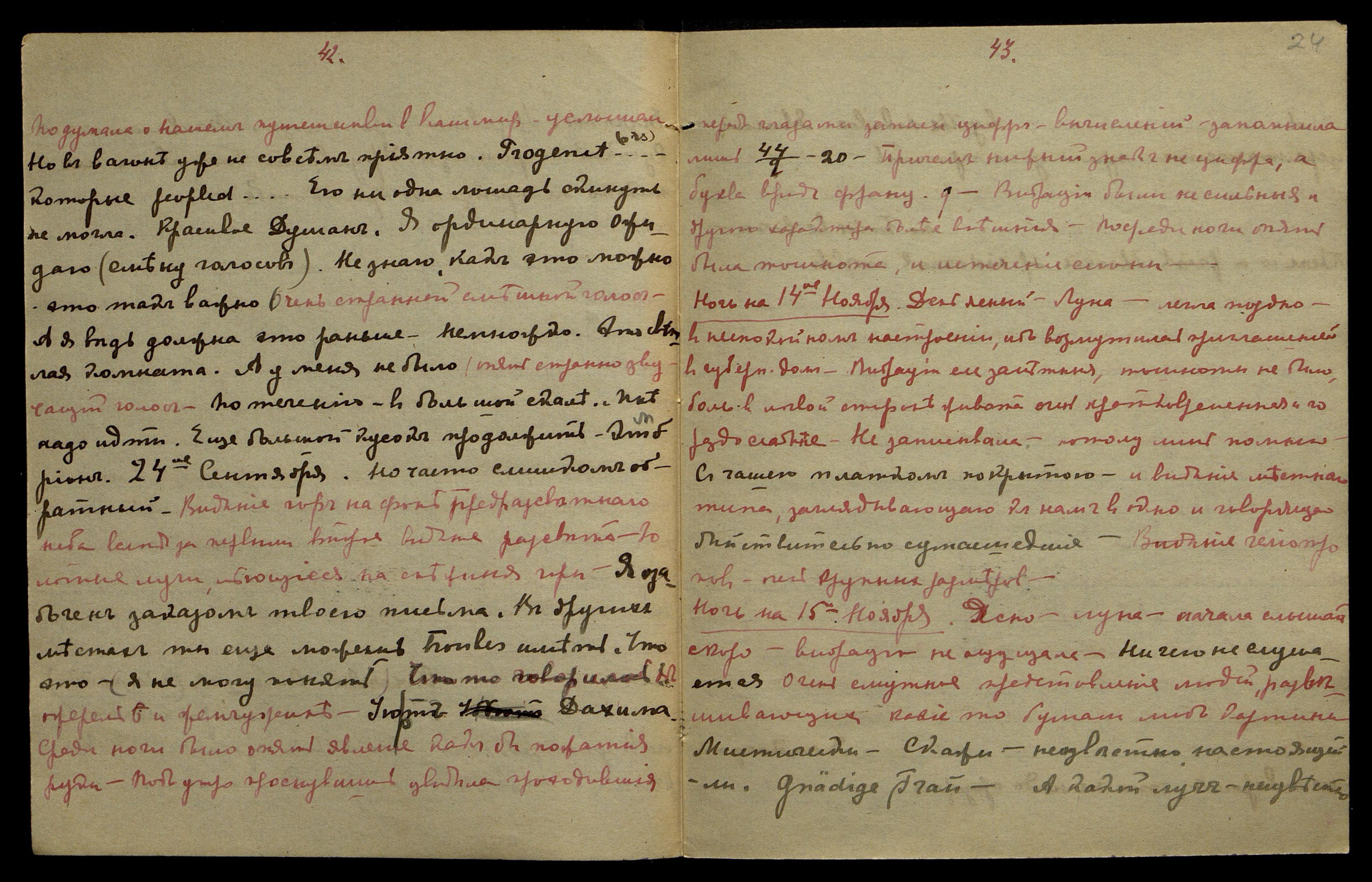 "Но в вагоне уже не совсем приятно. Progenit (ors) [англ.: Прародители]... которые peopled ... [англ.: населённые]. Его ни одна лошадь скинуть не могла. Красивое Душан. Я ординарную ожидаю (смену голосов). Не знаю, как это можно − это так важно". Очень странный, смешной голос. "А я ведь, должна это раньше. Немножко. Это светлая комната. А у меня не было", − опять странно звучащий голос, − по течению − в большой скале. Мне надо идти. Ещё большой кусок продолжить. Эмбрион. 24-ое сентября. Но часто слишком обратный". Видение гор на фоне предрассветного неба; вслед за первым, второе видение: рассвет − золотые лучи, льющиеся на снежные горы. "Я озабочен заказом твоего письма. В других местах ты ещё можешь [одно слово неразборчиво] иметь. Что это − (я не могу понять)". Что-то говорилось об ожерелье из жемчужин. "Уюрт Дахима". Среди ночи было опять явление как бы пожатия руки. Под утро, проснувшись, увидела проходившие перед глазами записи цифр − вычислений, запомнила лишь 44/q-20. Причём, нижний знак не цифра, а буква вроде французской "q". Вибрации были не сильные и другого характера, более внешние. Посреди ночи опять была тошнота и истечение слюны.