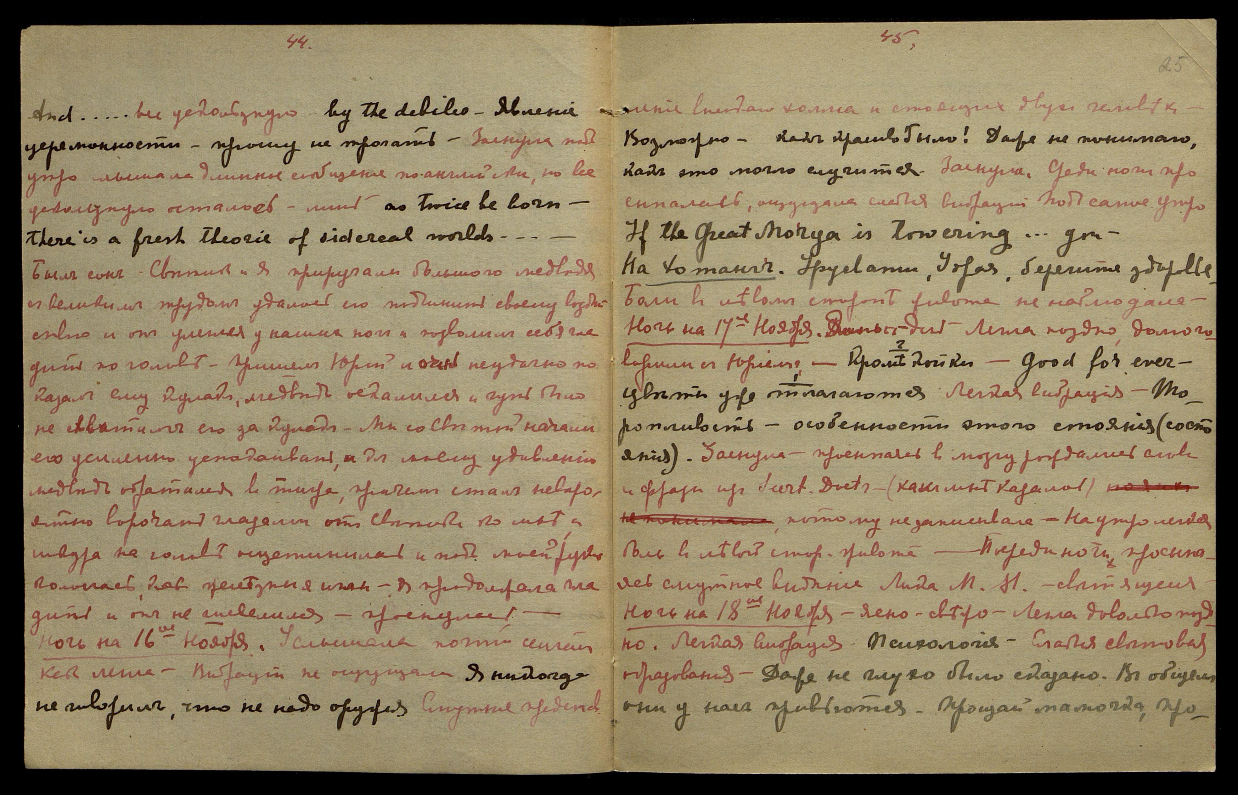 "And..." − [англ.: И] всё ускользнуло, − by the debilie [англ.: по слабоумию]. Явление церемонности − прошу не трогать". Заснула под утро, слышала длинное сообщение по-английски, но всё ускользнуло, осталось лишь: "...no twice be born − there is a fresh theorie of sidereal worlds [англ.: не дважды рожденные − есть свежая теория звёздных миров]..."