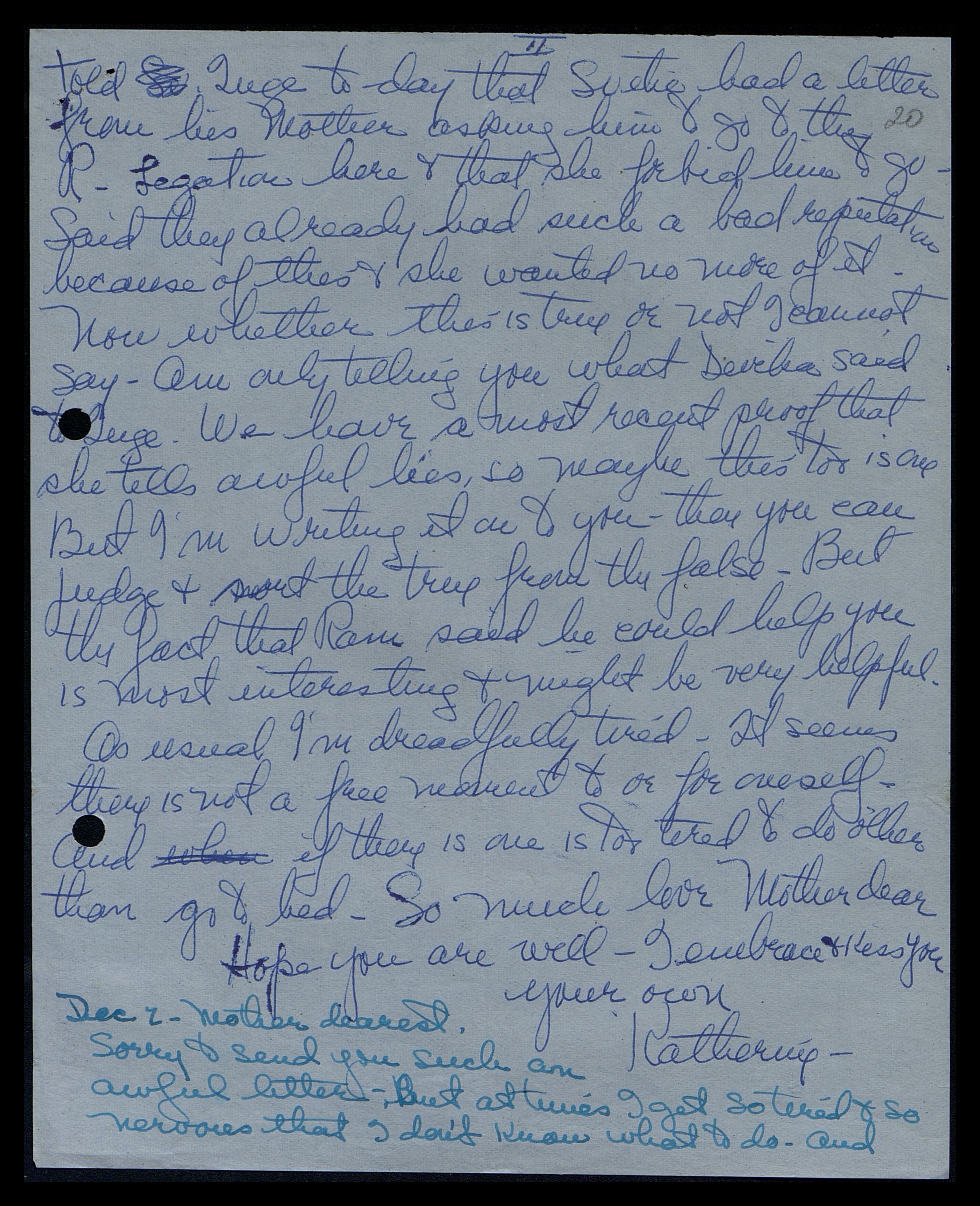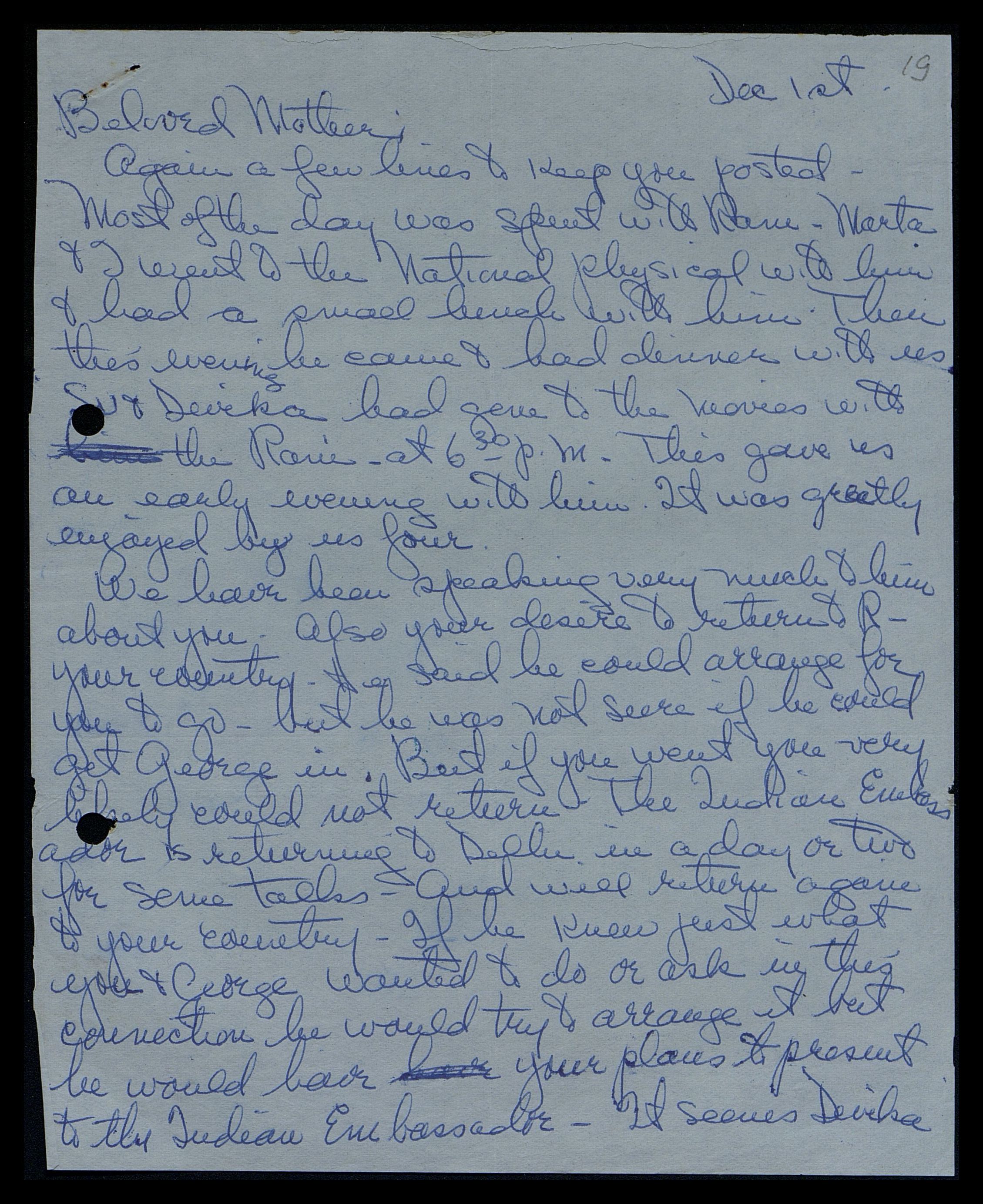 We have been speaking very much to him about you. Also, your desire to return to R[ussia] – your country. He said he could arrange for you to go, but he was not sure if he could get George in. But if you went, you very likely could not return. The Indian Ambassador is returning to Delhi in a day or two for some talks and will return again to your country. If he knew just what you and George wanted to do or ask in this connection, he would try to arrange it, but he would have your plans to present to the Indian Ambassador. It seems Devika