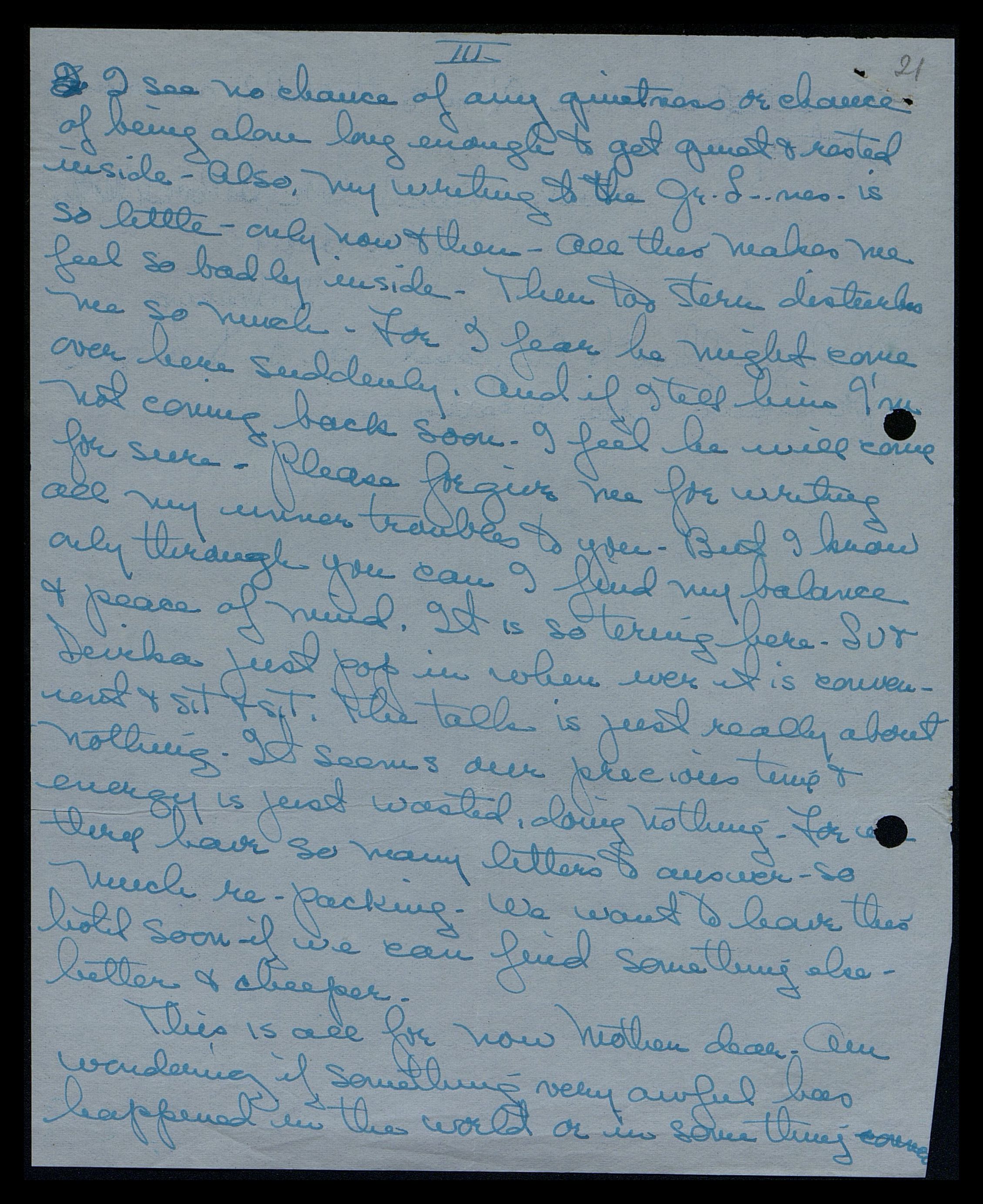 I see no chance of any quietness or chance of being alone long enough to get quiet and rested inside. Also, my writing to the Gr[eat] L[eonidas] is so little – only now and then. All this makes me feel so bad inside.