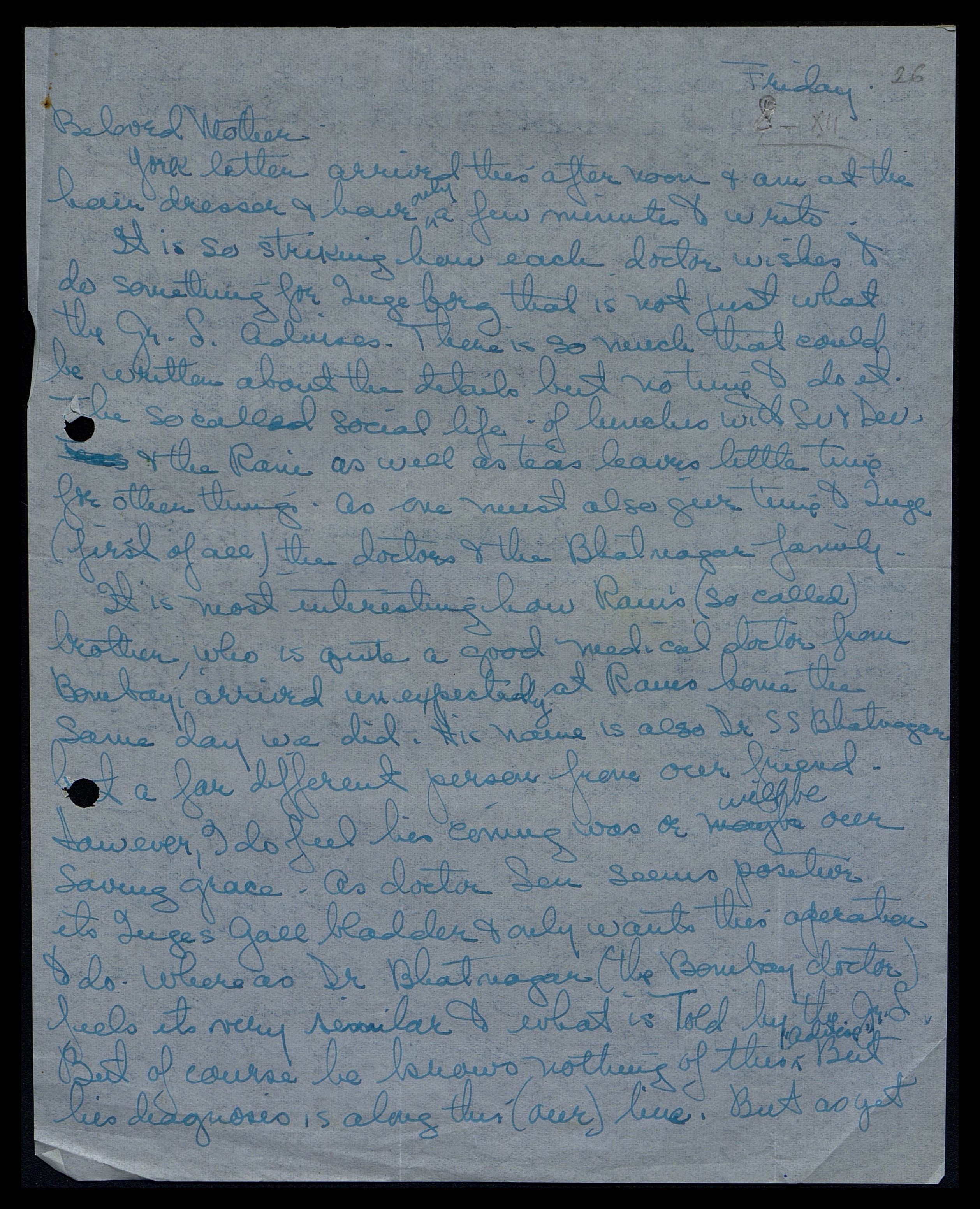 It is so striking how each doctor wishes to do something for Ingeborg that is not just what the Gr[eat] L[ord] Advises. There is so much that could be written about the details, but no time to do it. The so-called social life of lunches with Sv[etic], Dev[ika], and the Rani [Rita], as well as teas, leaves little time for other things, as one must also give time to Inge (first of all), the doctors, and the Bhatnagar family.