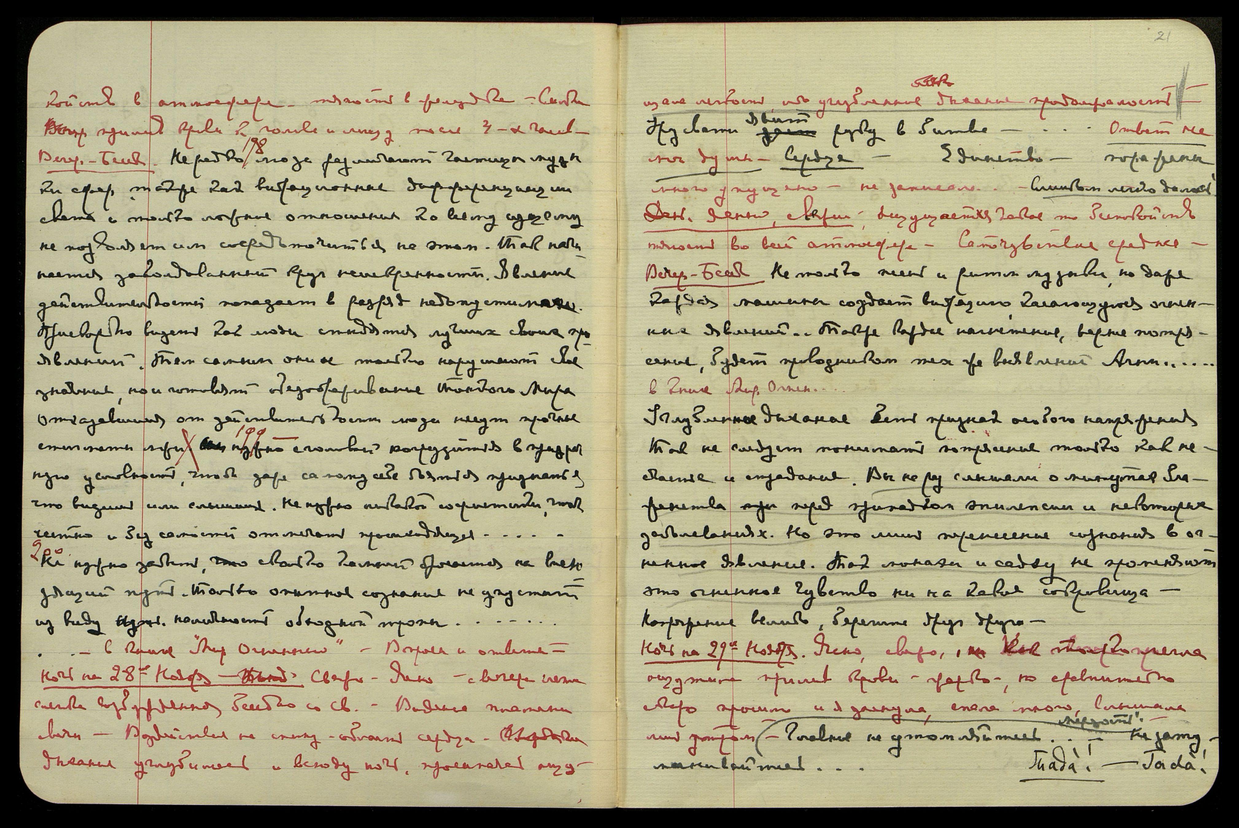 Ночь на 30-е ноября. Облачно, свежо. Но как только легла, стало жарко, горят ноги, сна нет, легкое ощущение в солн[ечном] спл[етении], приняла валериан, соду. Большая вспышка красного света. Думы о том, что несмотря на все трудности, мы самые счастливые люди во всем свете, усл[ышала]: "Ты моя родная!..." Горение ног продолжается.